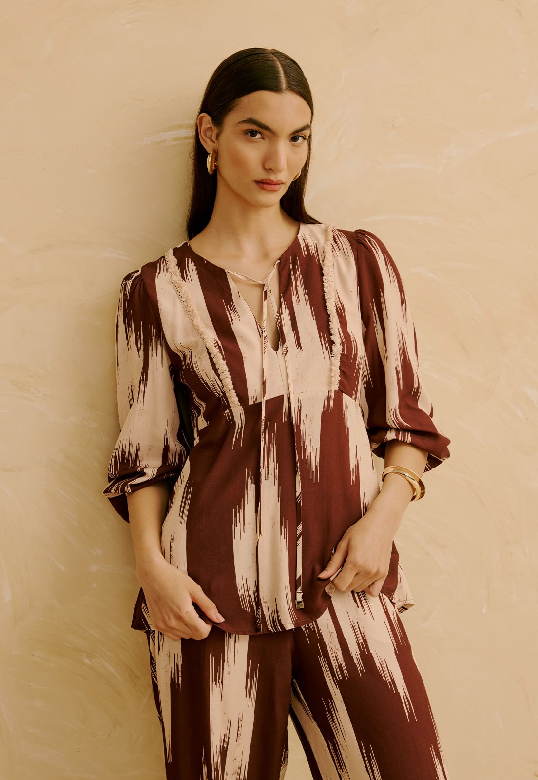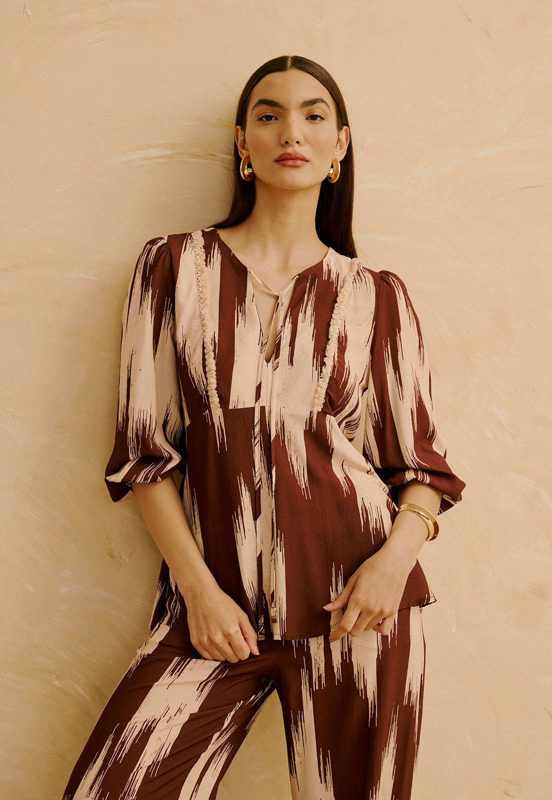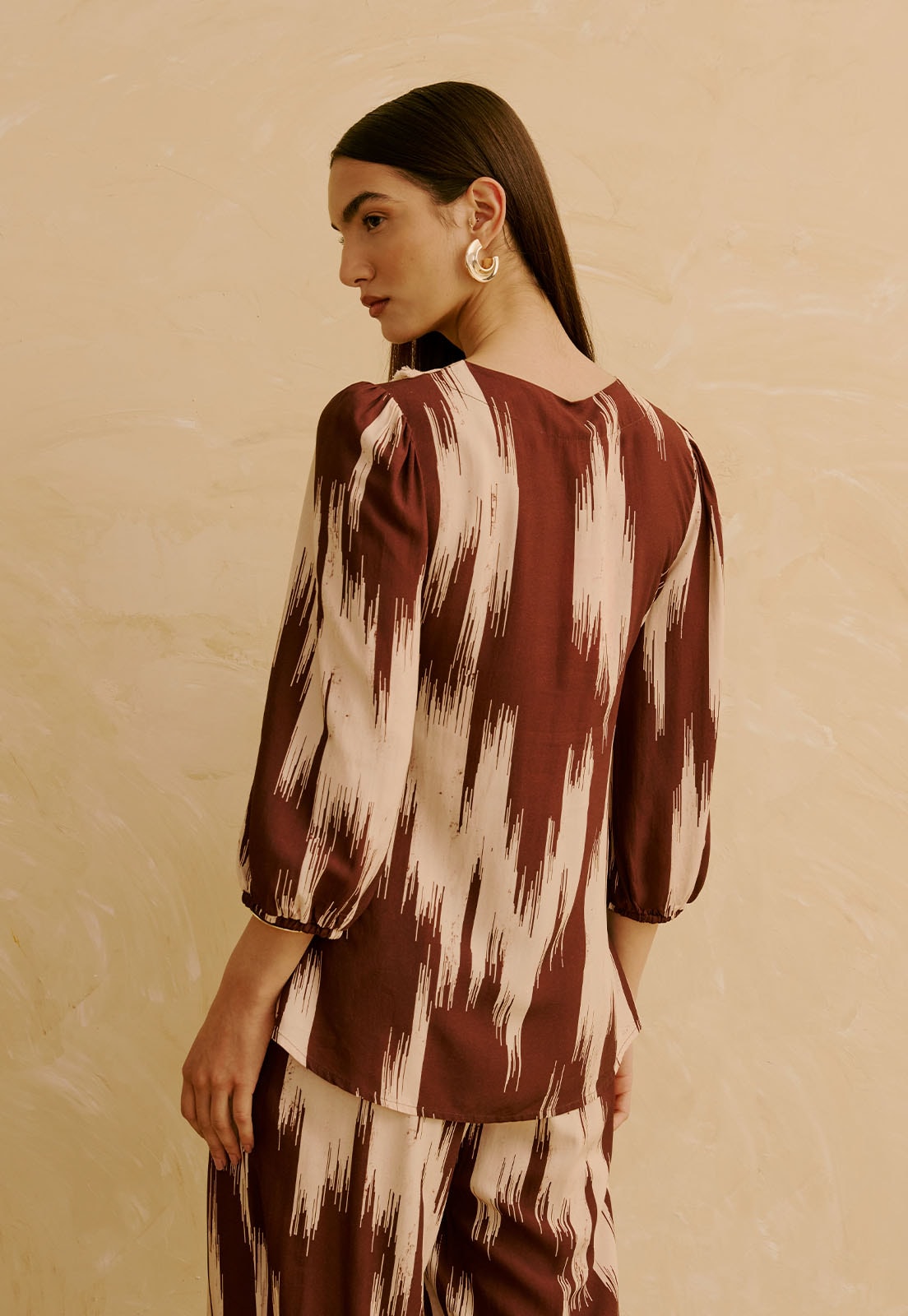 Confeccionada em 100% viscose, o tecido é leve e sem elasticidade, ideal para uso prolongado com bem-estar. O estilo é atemporal e se adapta a momentos casuais, ao dia a dia ou até ao trabalho, trazendo sofisticação com a estampa como elemento de design. Combine com brincos marcantes, calças de alfaiataria ou uma saia fluida para criar composições versáteis e cheias de personalidade.