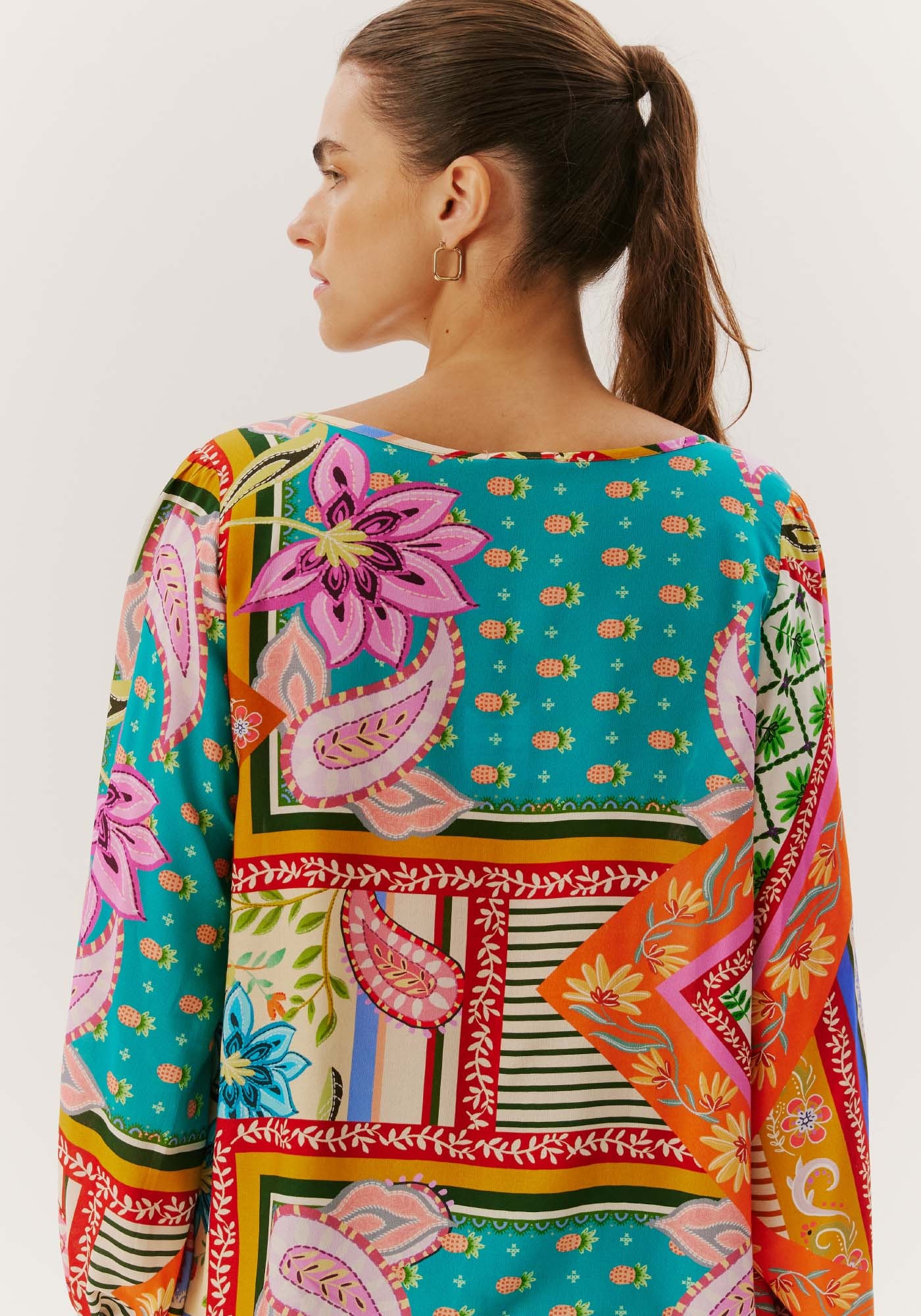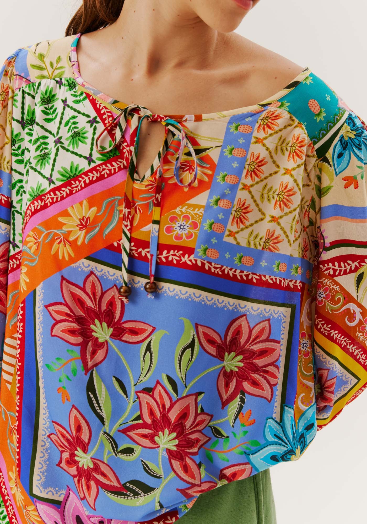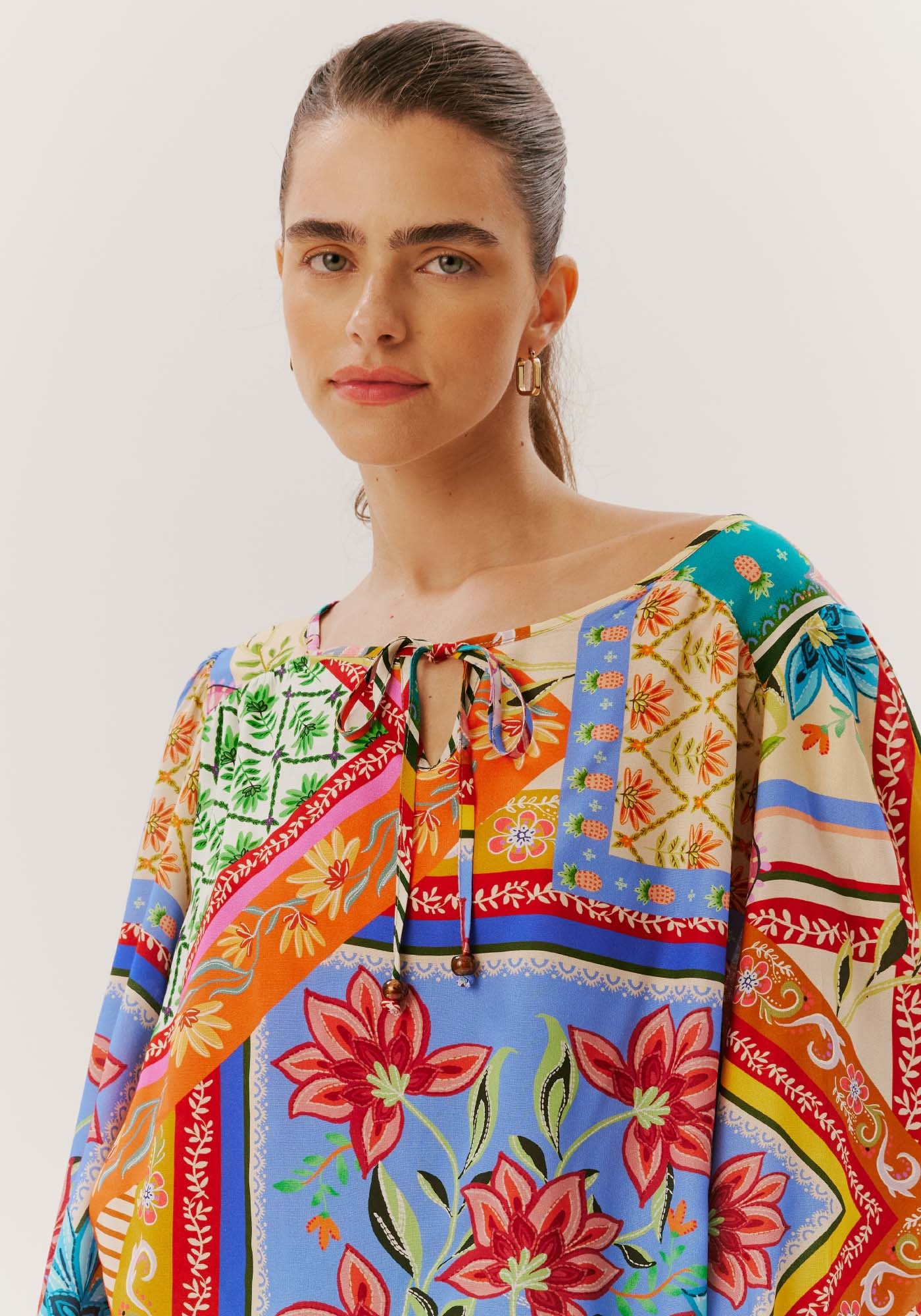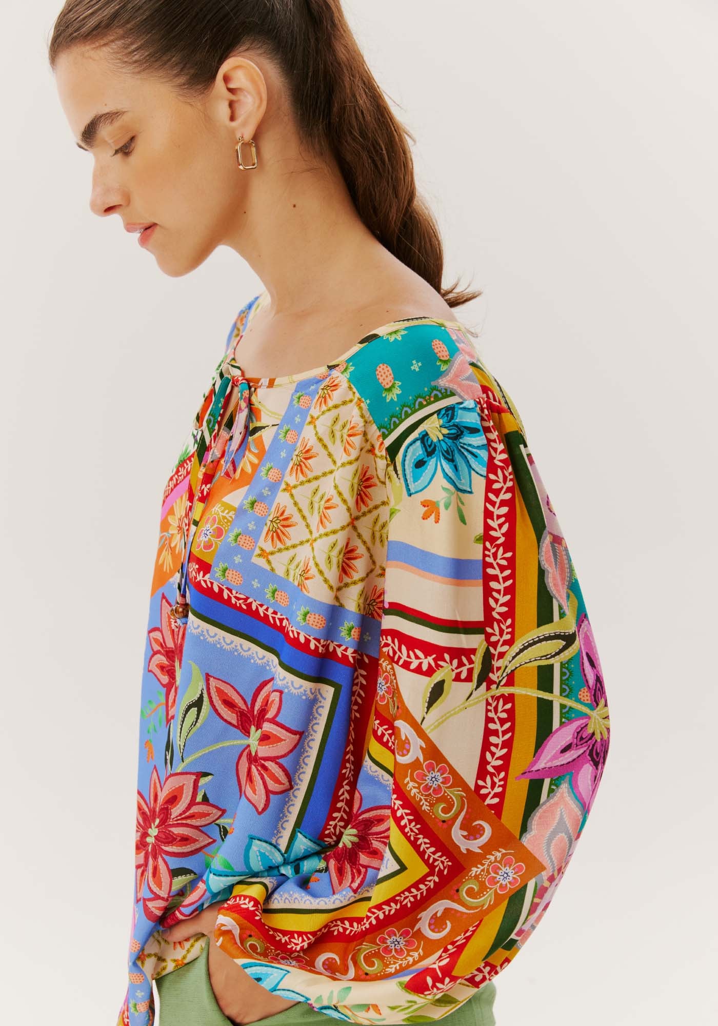 A blusa bata é uma opçãoestilosa para o dia a dia. Confeccionada em viscose com manga bufante, possui amarraçãodelicada finalizada com ponteiras, dando um toque sofisticado para a peça. Oshape solto proporciona mais conforto. A estampa Maya é vibrante e colorida,ideal para o verão.