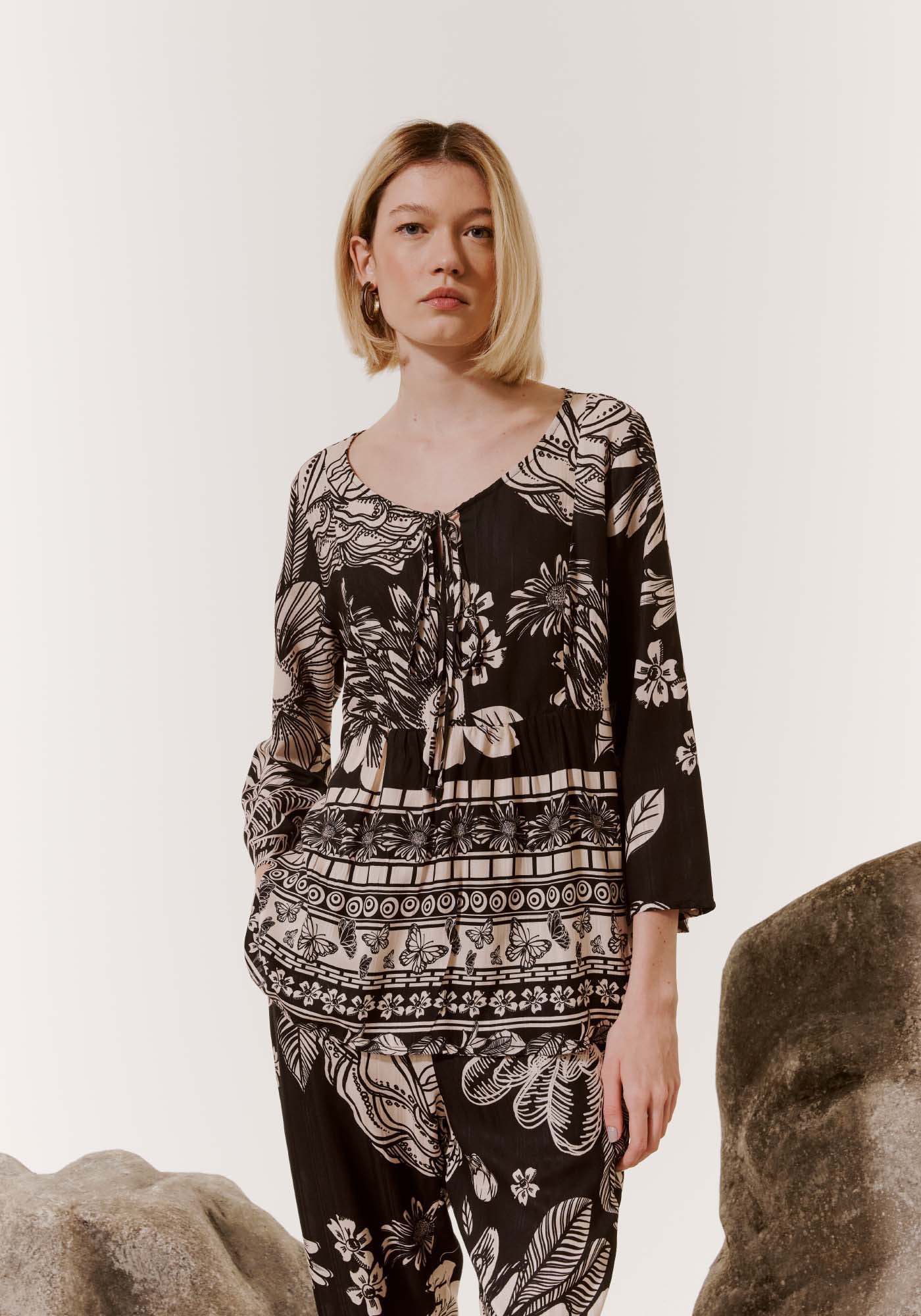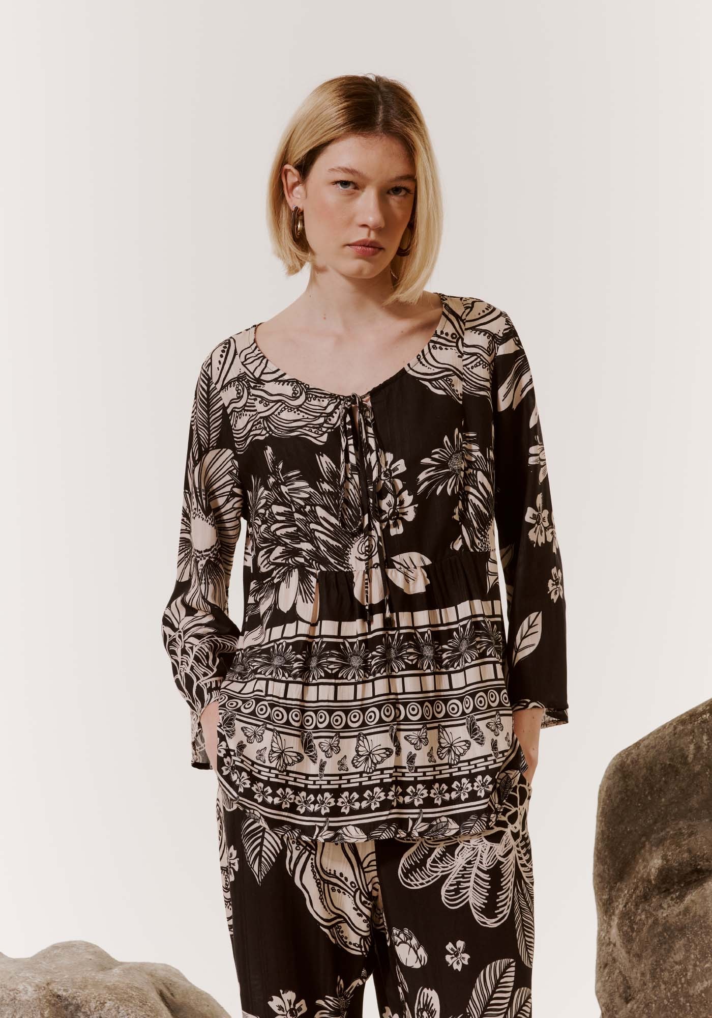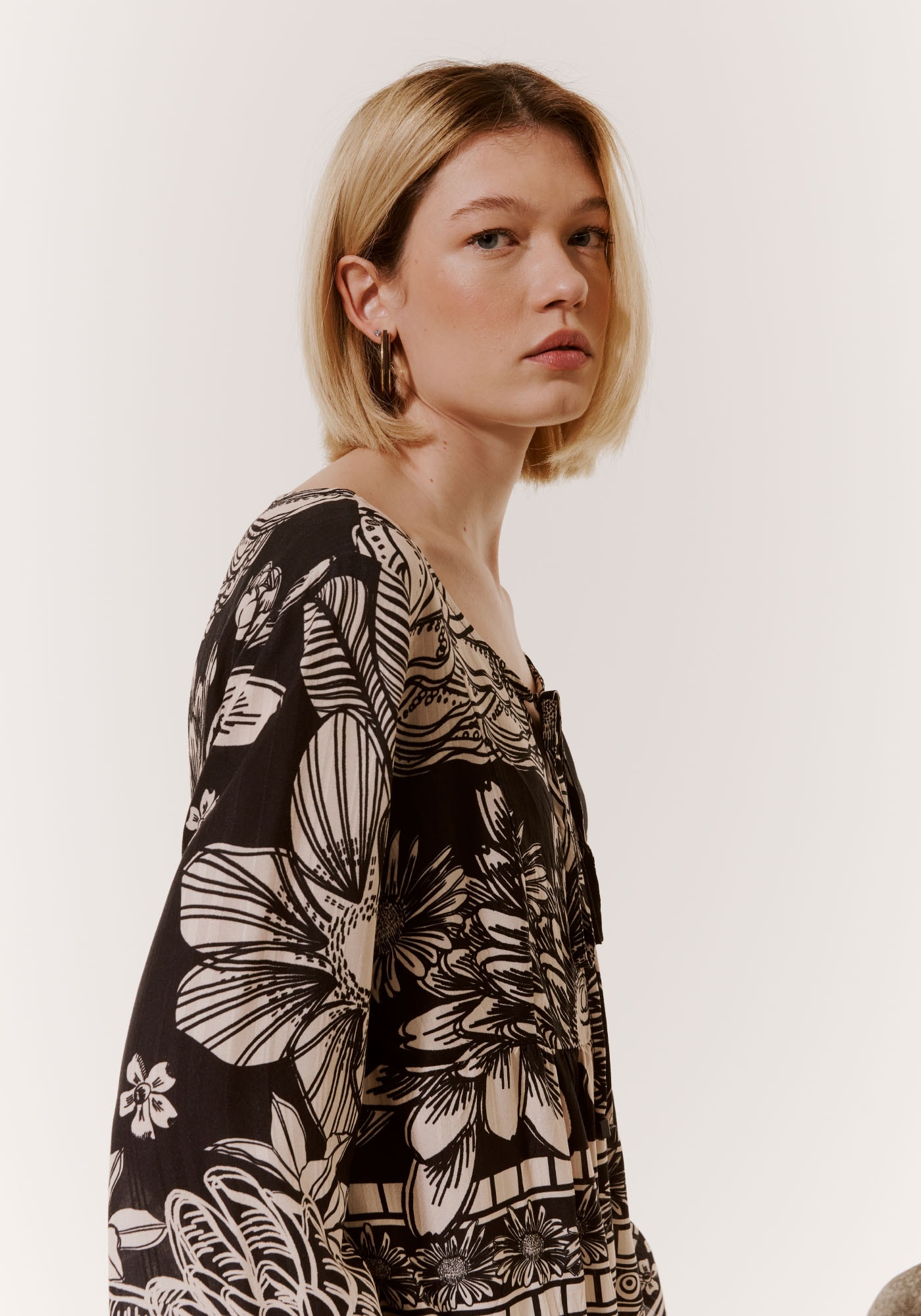 A bata é uma peça que une conforto eestilo. Confeccionado em tecido 100% viscose, o modelo possui manga ¾ com aboca mais larga. A modelagem é ampla, com amarração em túnel. A estampaPradaria é um clássico P&B com elementos florais de diferentes modelos etamanhos.