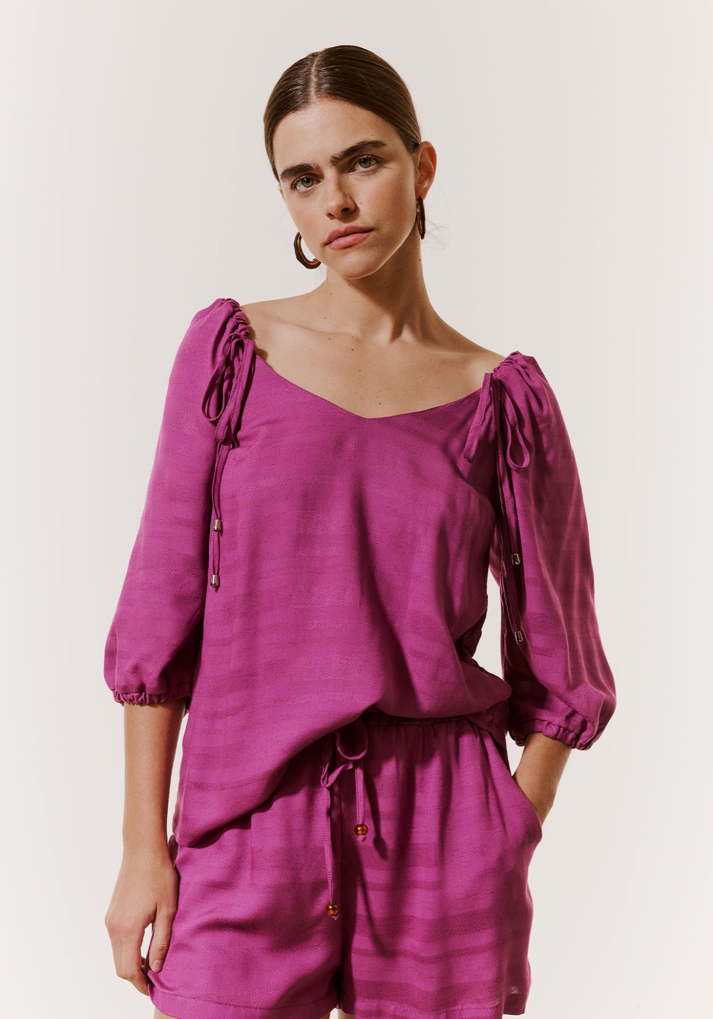 A bata é uma peça sofisticada e elegante.Confeccionada em tecido 97% viscose e 3% linho, possui manga ¾ bufante com elásticoe shape solto. A amarração nos ombros é um detalhe charmoso, que dá um toque amais para peça.