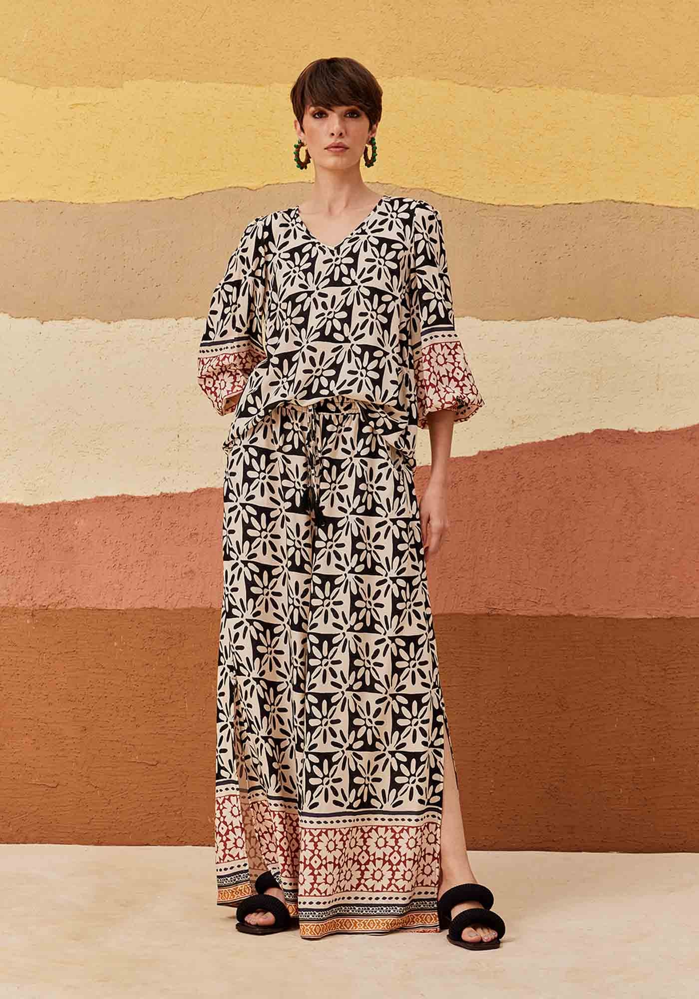 A bata é um modelo elegante e versátil. Confeccionada em tecido 100% viscose, possui decote em V e manga bufante. A modelagem é soltinha e confortável. estampa contrasta o floral P&B com o barrado colorido.
