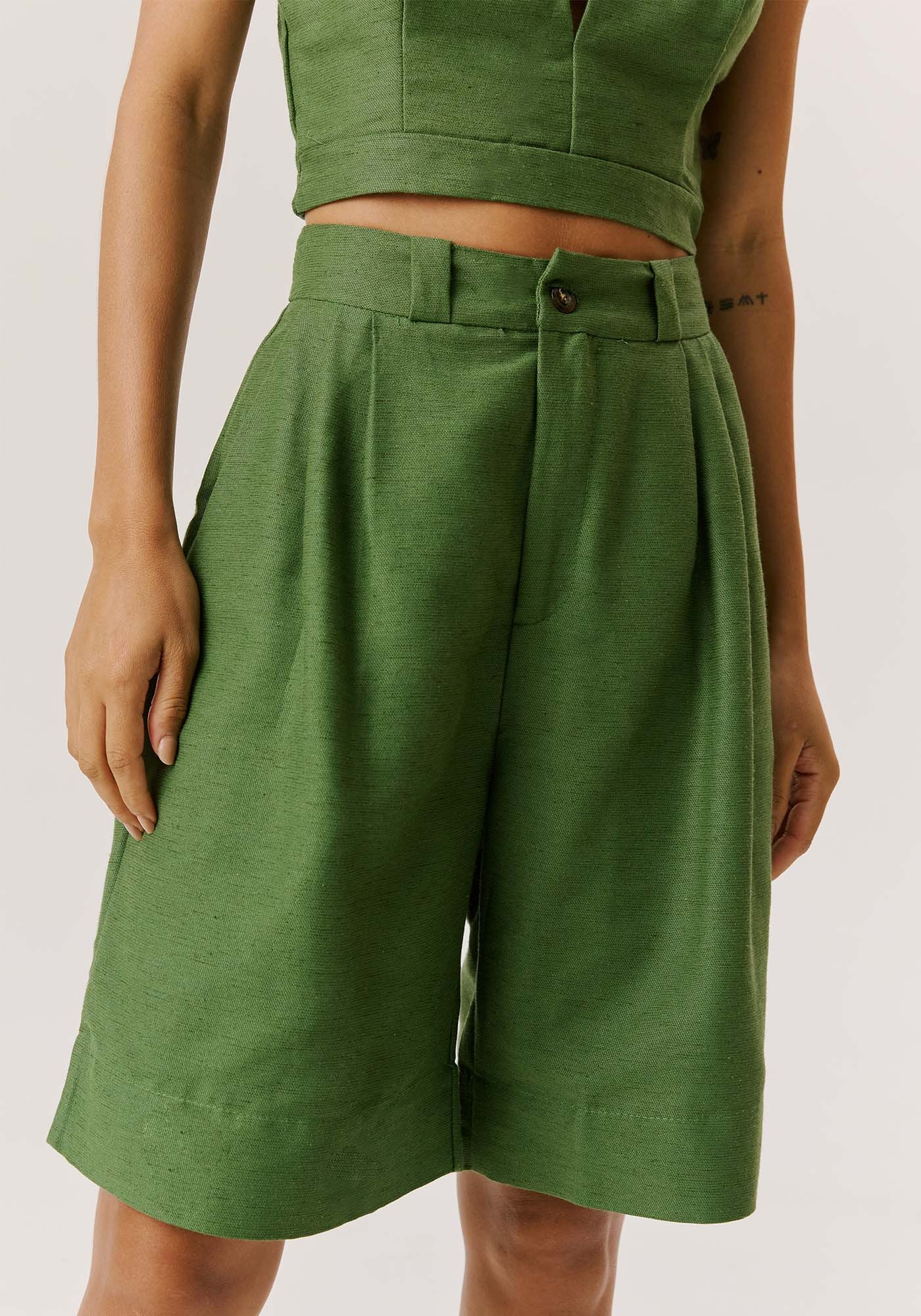Confeccionada em tecido misto 50%algodão 29% viscose 15% modal e 6% linho, a bermuda lisa é uma peça versátil, queganha uma roupagem sofisticada e elegante. O modelo com pregas possui bainhainglesa e bolsos laterais e pode ser usada em diferentes ocasiões. A peça aindaconta com fechamento com zíper e botão na parte da frente, além de passadorpara cinto.