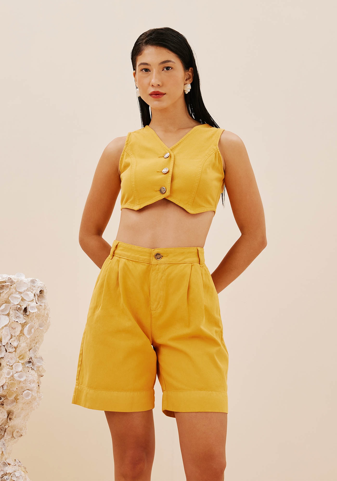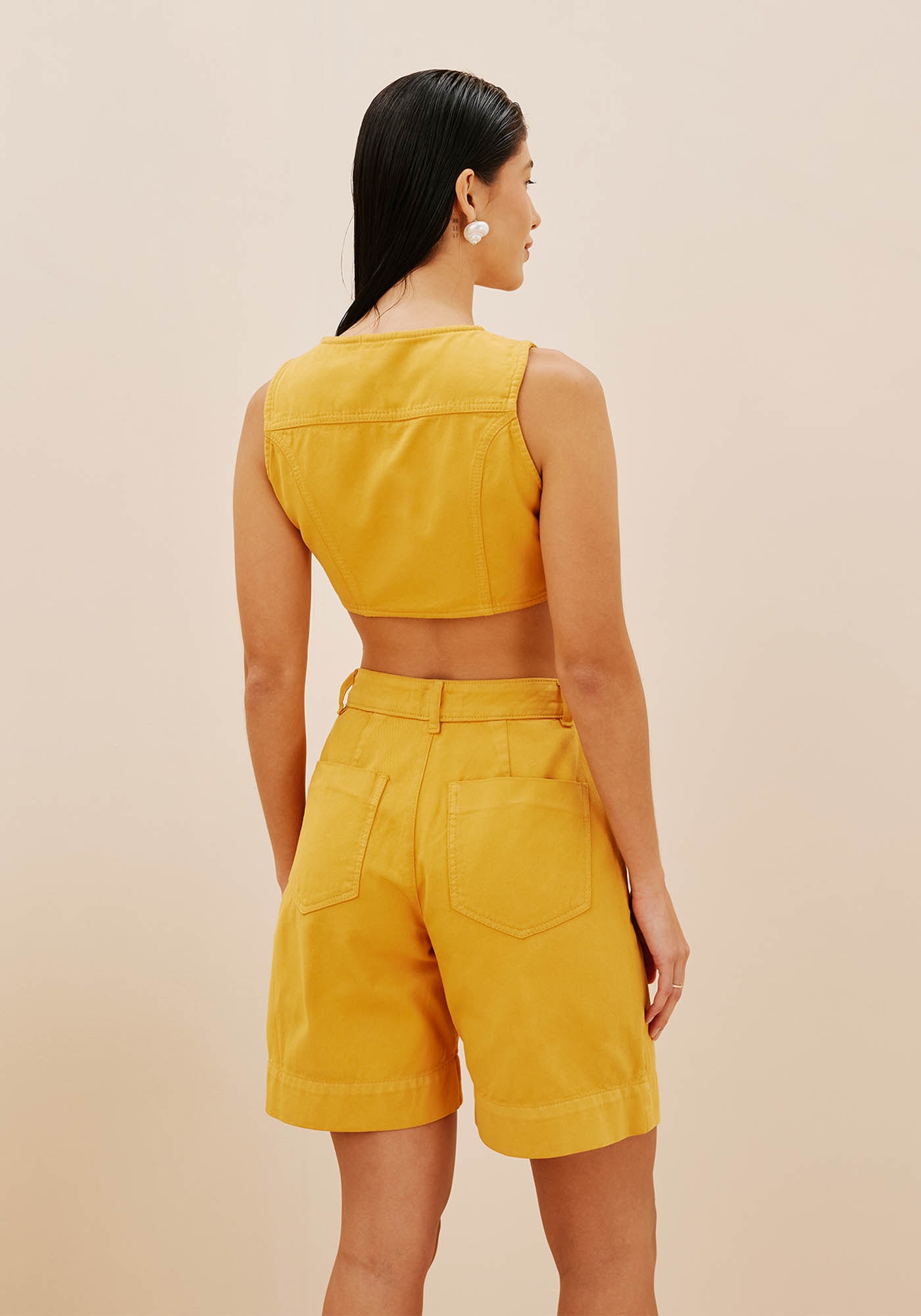 A bermuda lisa é confeccionada emsarja 100% algodão. Possui cintura alta, com passador, além dos bolsos lateraise traseiros e trazem praticidade. As pregas e o comprimento deixam o modelomais elegante.