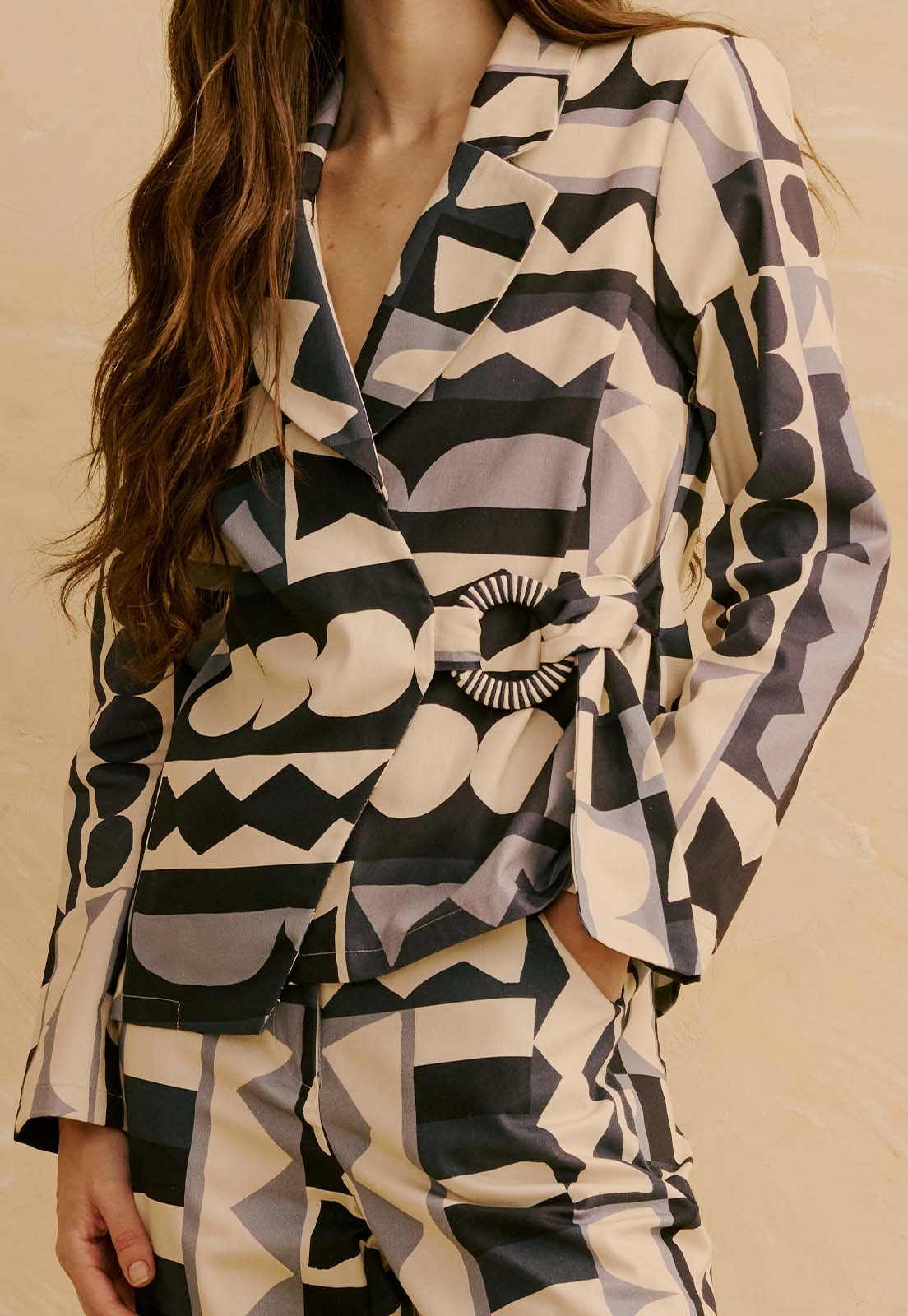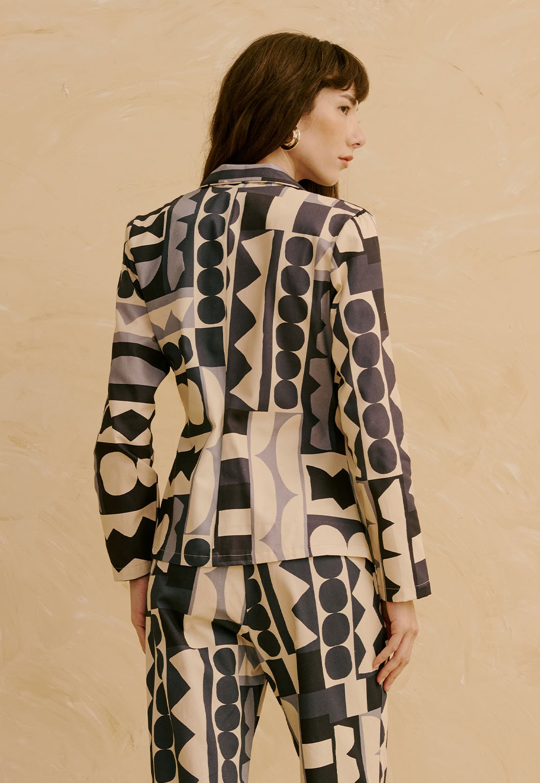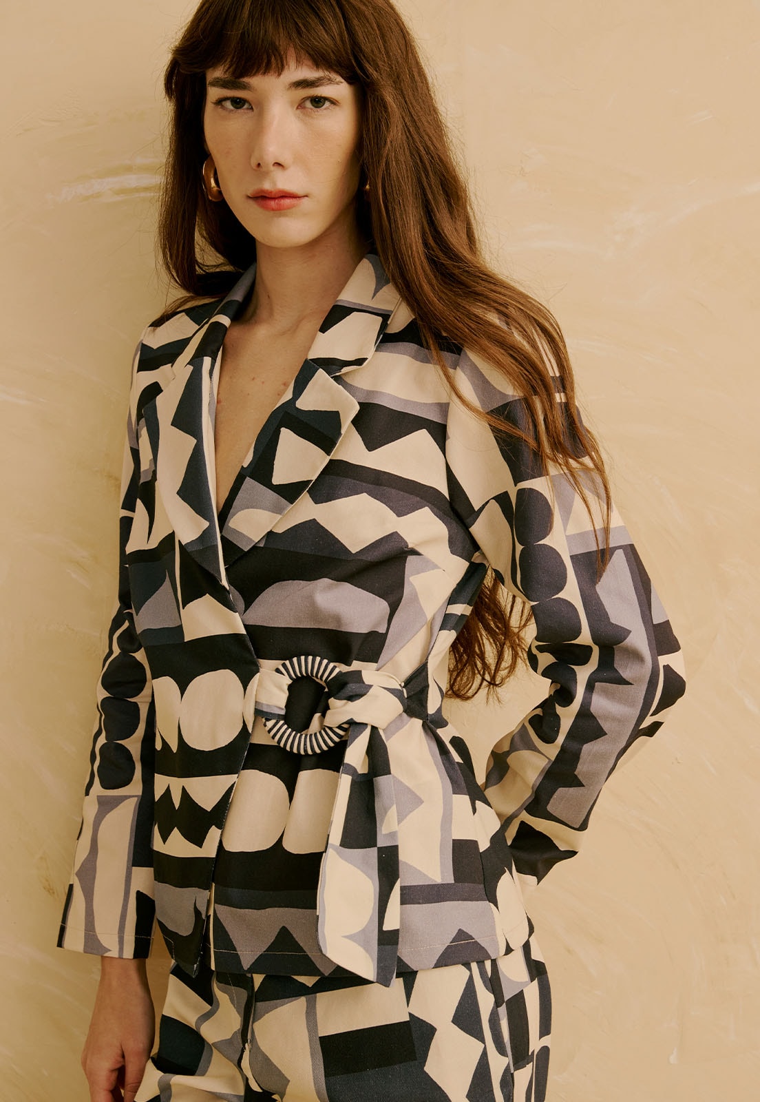 Confeccionado em 100% algodão, o tecido é encorpado e sem elasticidade, garantindo conforto mesmo em uso prolongado. A estampa geométrica adiciona um toque artístico e atemporal, ideal para compor looks modernos. Use com calça de alfaiataria ou jeans para um visual elegante no dia a dia, e complemente com acessórios como brincos marcantes ou bolsas estruturadas para destacar ainda mais o estilo.