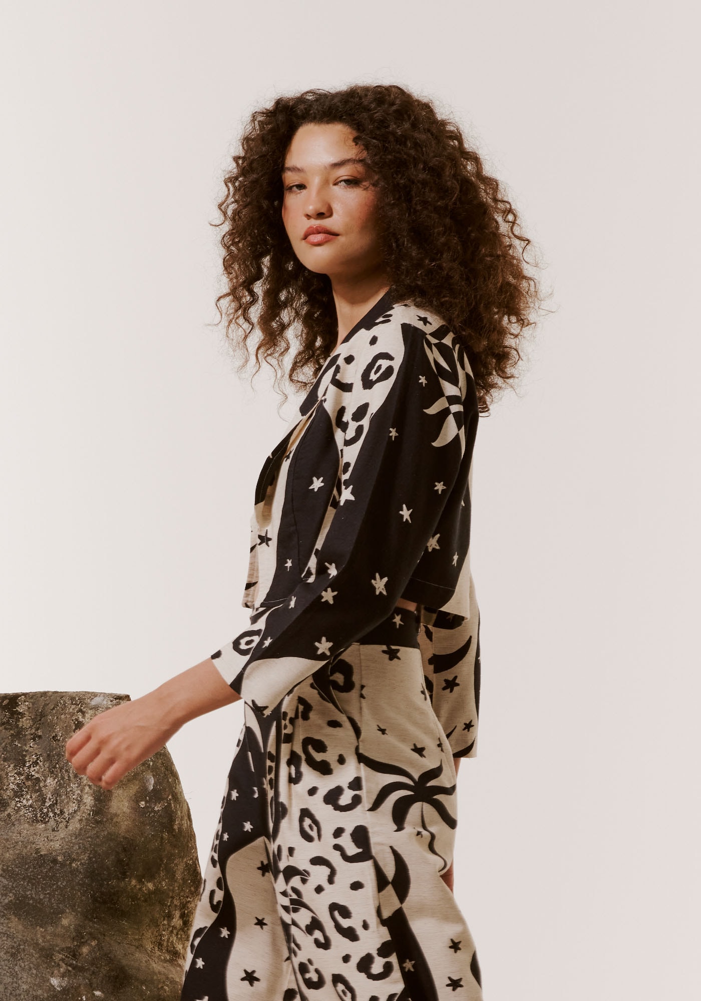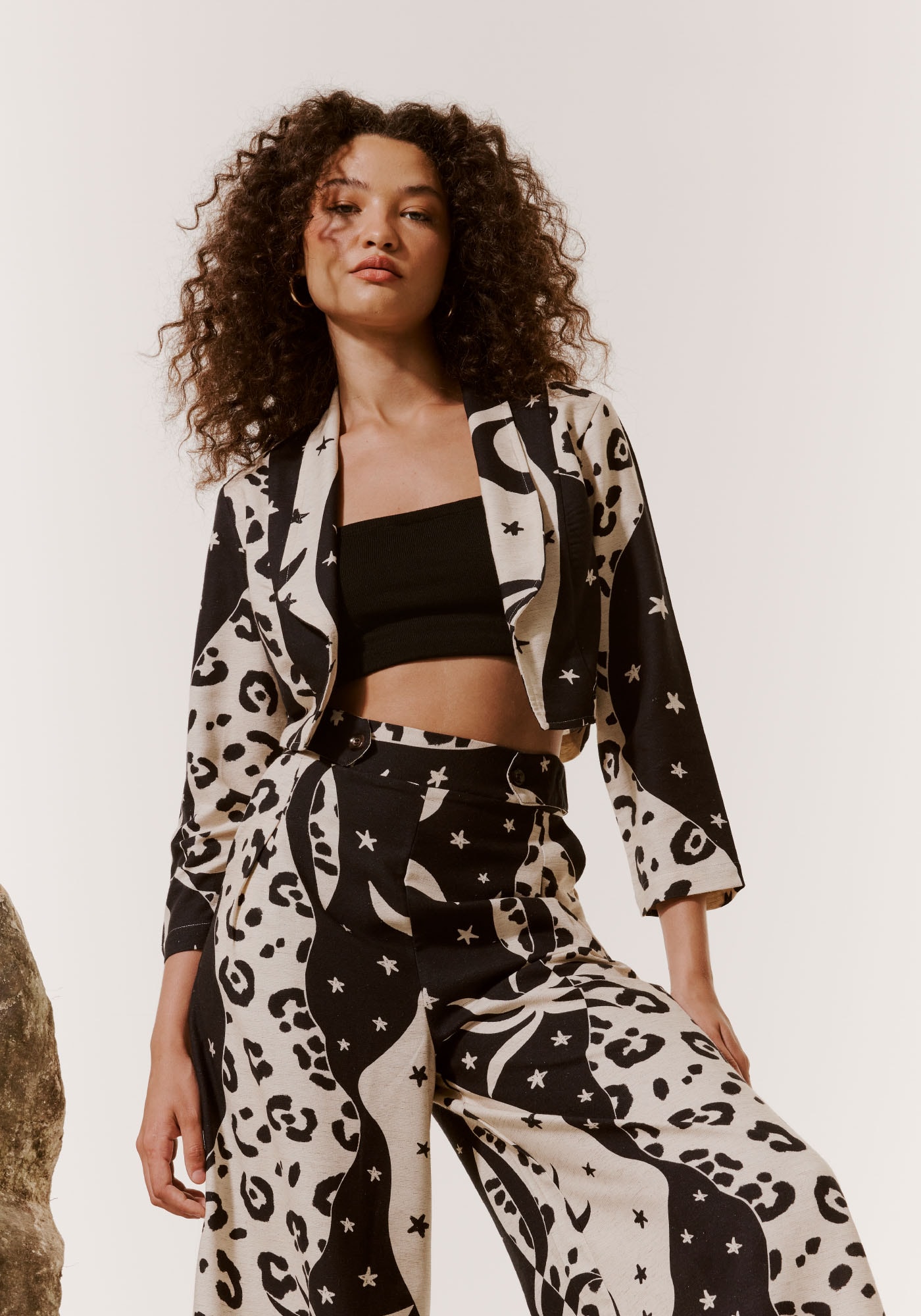 Este lindo blazer croppedconfeccionado em tecido misto, 42% algodão 38% viscose 14% modal 6% linho,destaca-se pela presença da estampa em preto e branco. Sua modelagem justapromove elegância sem perder o conforto.