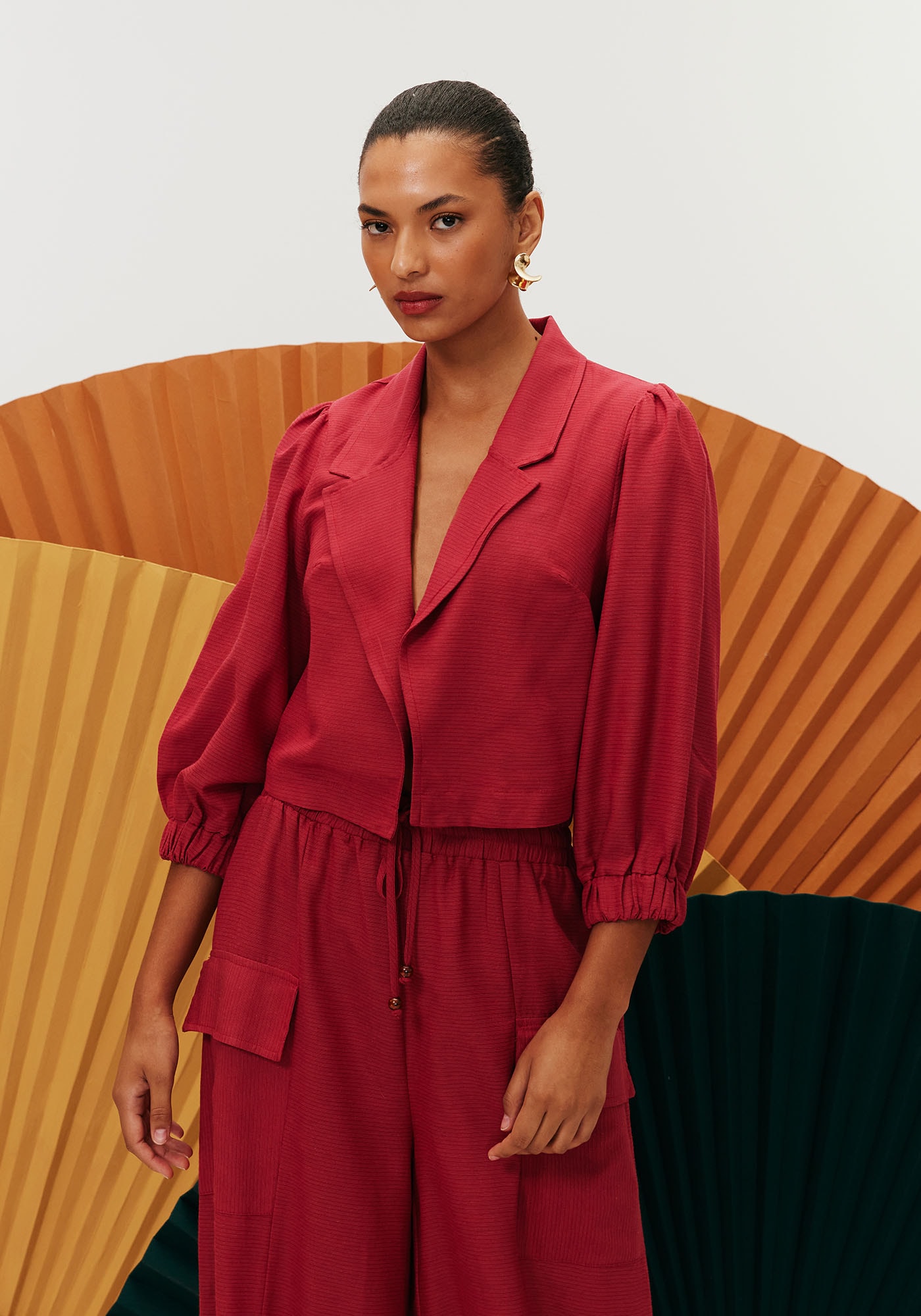 Este blazer é a peça idealpara quem busca um visual estiloso e feminino. É confeccionado em tecido decomposição 61% viscose e 39% algodão. Seu modelo é cropped, enquanto as suas mangastem comprimento ¾, punho com acabamento em elástico e são franzidas no ombro adicionandomais movimento à peça e trazendo um ar mais feminino e romântico.