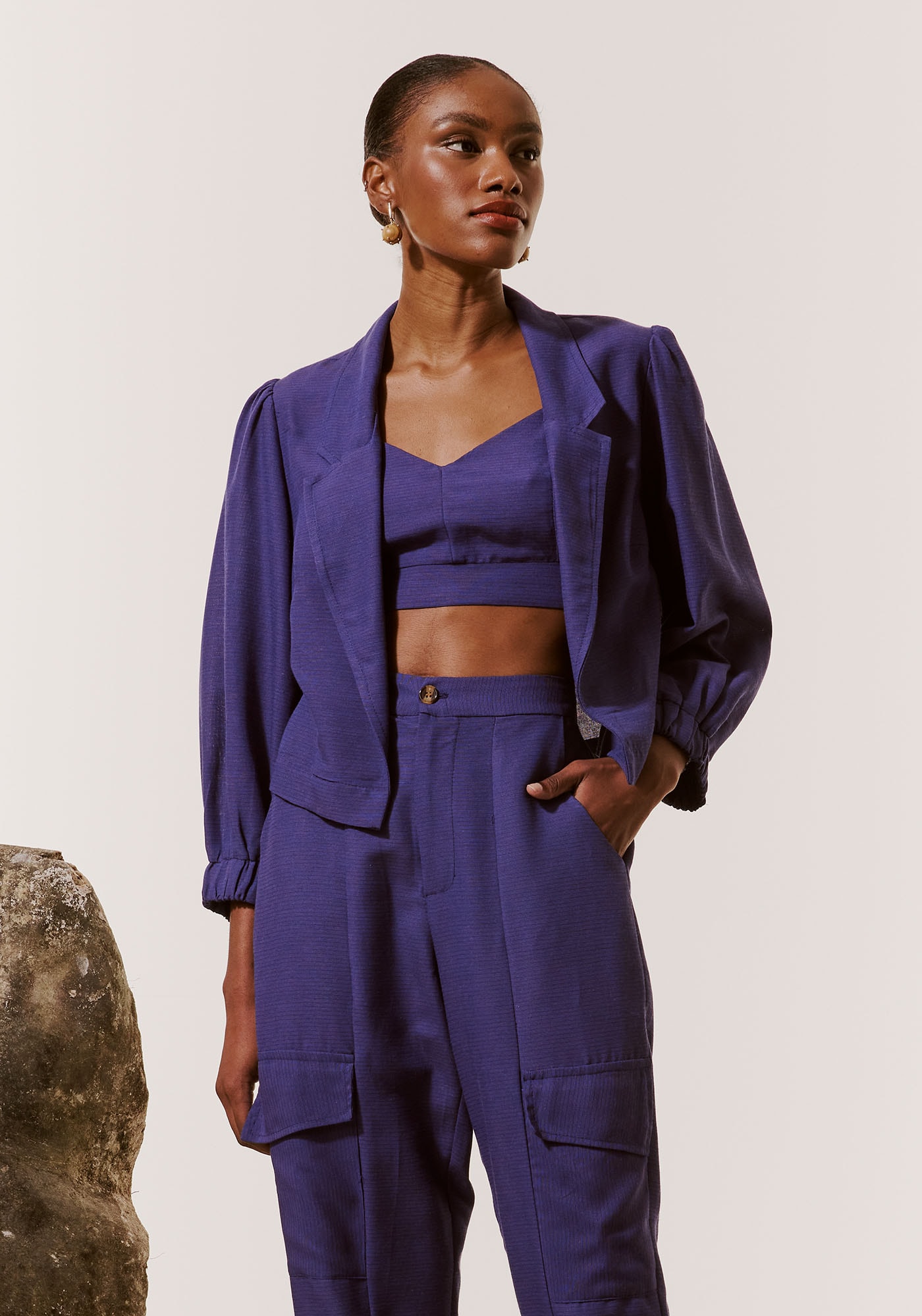 Confeccionado em tecido 61%viscose e 35% algodão, o blazer liso é uma peça sofisticada e versátil. O modelocropped com manga bufante que pode ser usado é chique e pode ser usado comoterceira peça em diferentes composições.