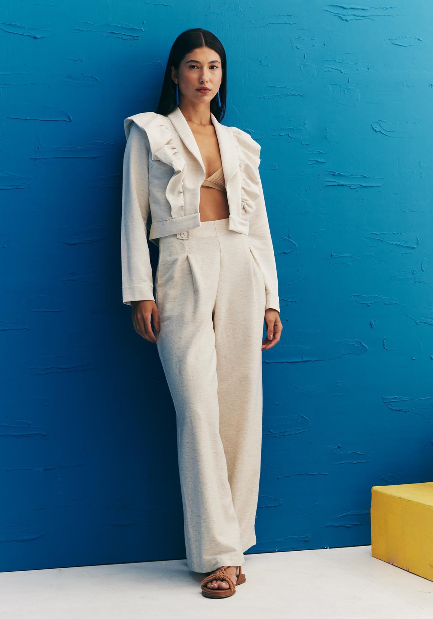 Confeccionado em tecido 50% algodão 29% viscose 15%modal 6% linho, o blazer com babado é chique e elegante. A sobreposição éaberta e tem como detalhe principal o babado super charmoso, que deixa qualquerlook sofisticado e elegante.