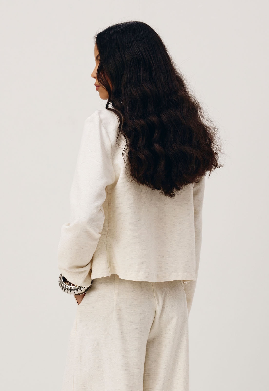O blazer é confeccionado em tecido 50% algodão 29% viscose 15% modal e 6% linho.É um modelo elegante, com lapela na parte da frente, que combina com diferentes ocasiões.