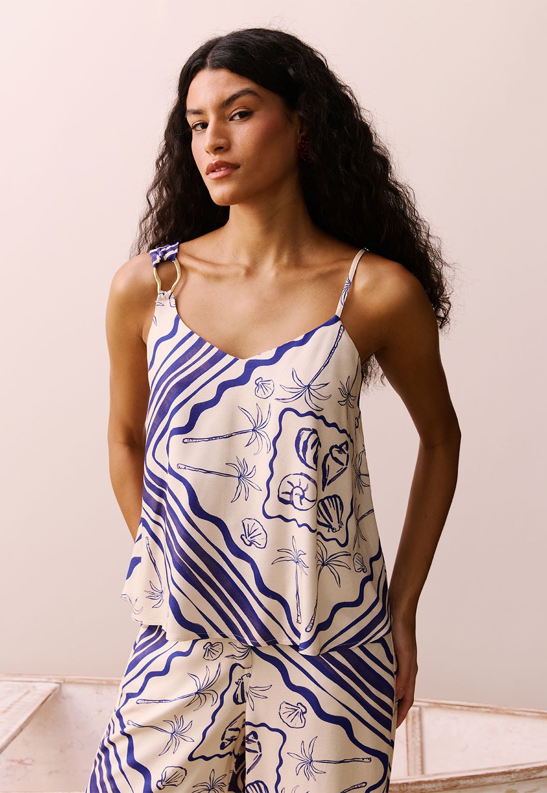 A Blusa Argola Orgânica Estampada Tupé é uma peça que traduz leveza, movimento e autenticidade. Com alças assimétricas, cada uma com espessura distinta, a blusa ganha destaque pelo detalhe artesanal da argola orgânica que conecta uma das alças à peça, criando uma composição única e sofisticada. O corte fluido e o caimento leve até os quadris proporcionam conforto e liberdade, enquanto o tecido em 100% viscose garante frescor e toque suave para os dias quentes.