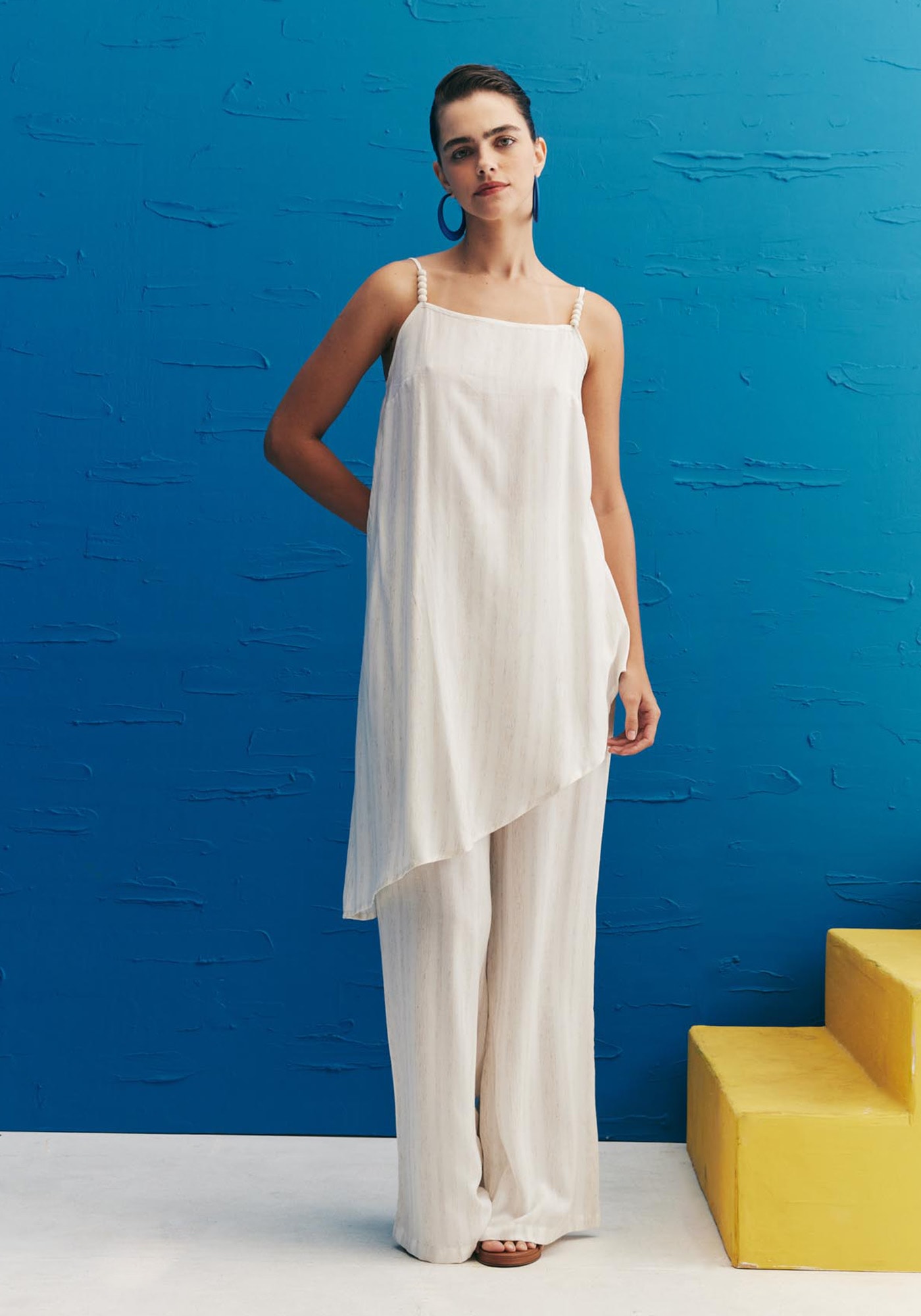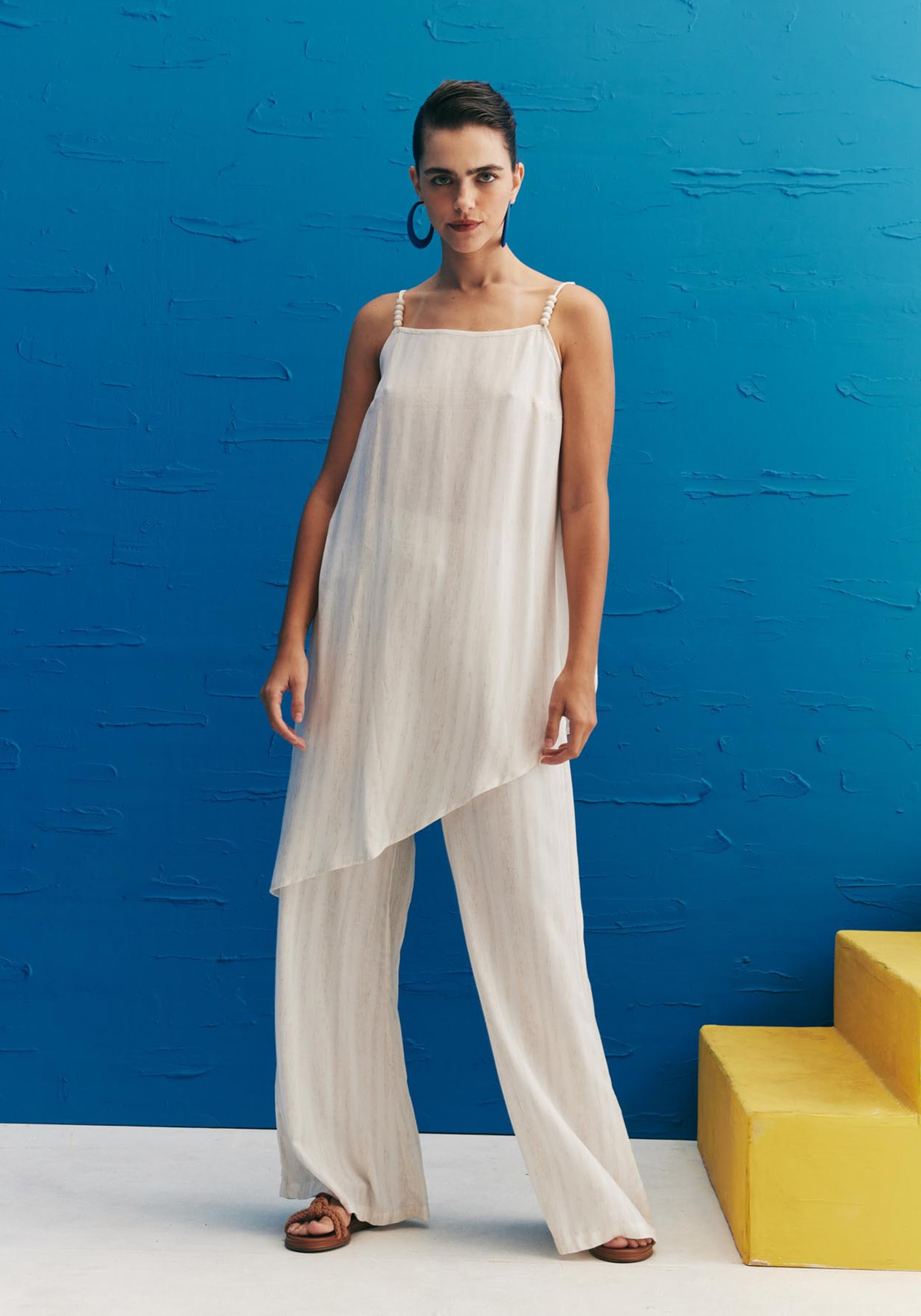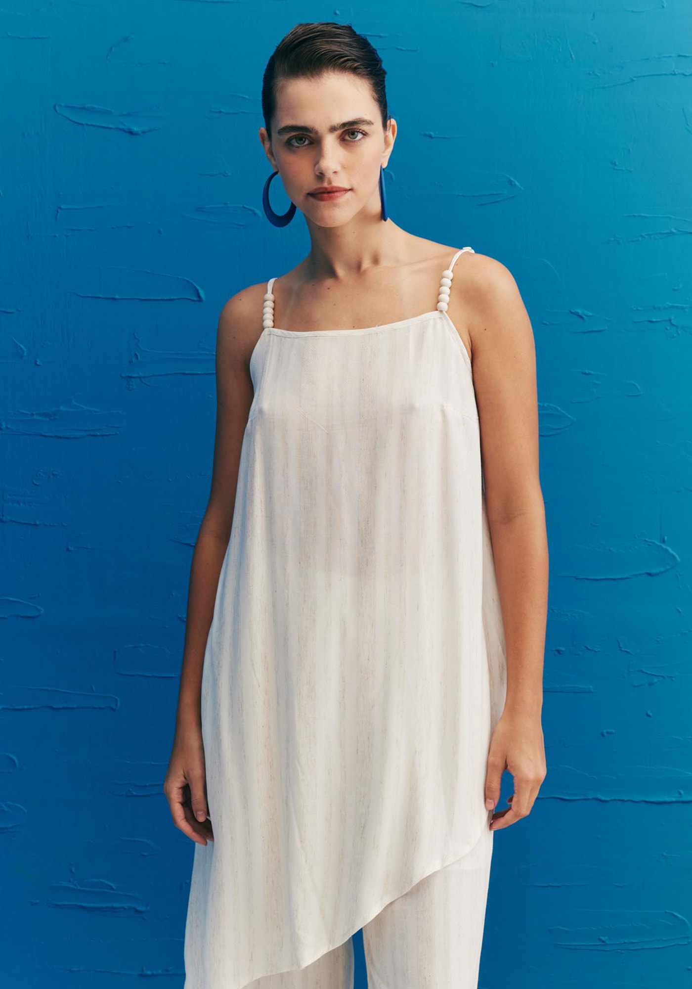 A blusaassimétrica é moderna e estilosa. Confeccionada em tecido 97% viscose e 3%linho, o modelo possui contas na alça, que são as joias da peça. O shape alongadoe assimétrico dá um toque elegante para a blusa.