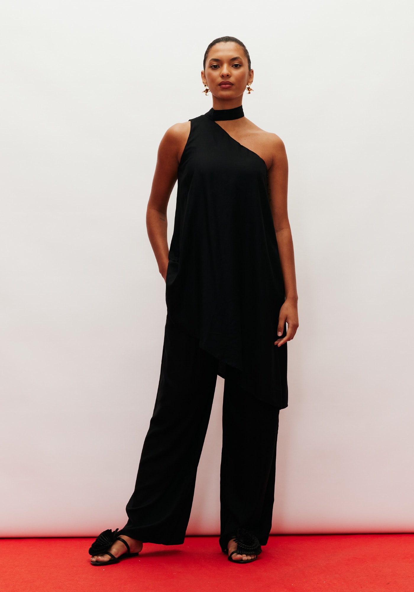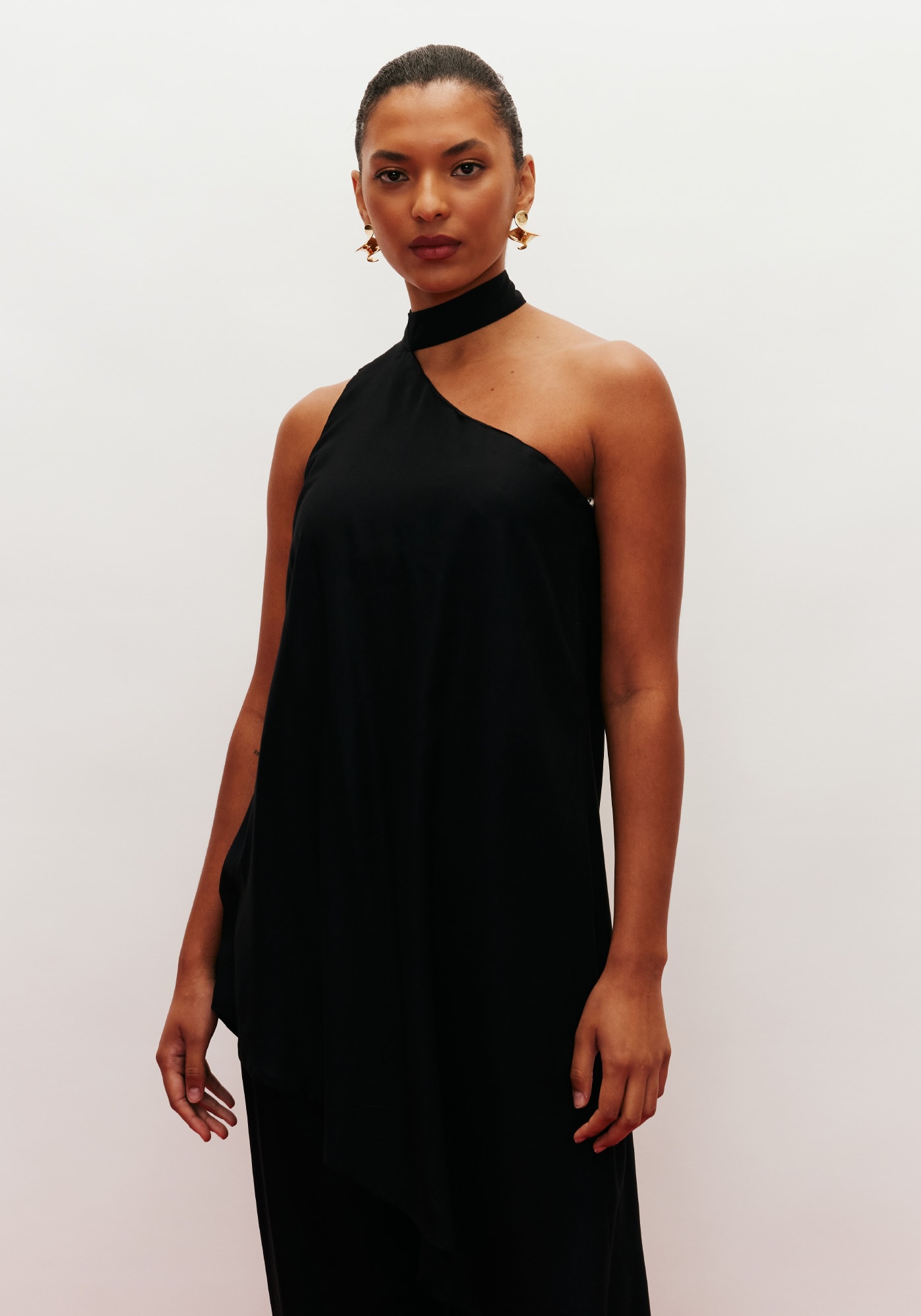 A blusa assimétrica possui um desenho únicoe ousado. Confeccionada em tecido 100% viscose, é um modelo de um ombro só comgola que amarra na parte de trás. O comprimento longo e o shape assimétrico dáum toque moderno na composição.