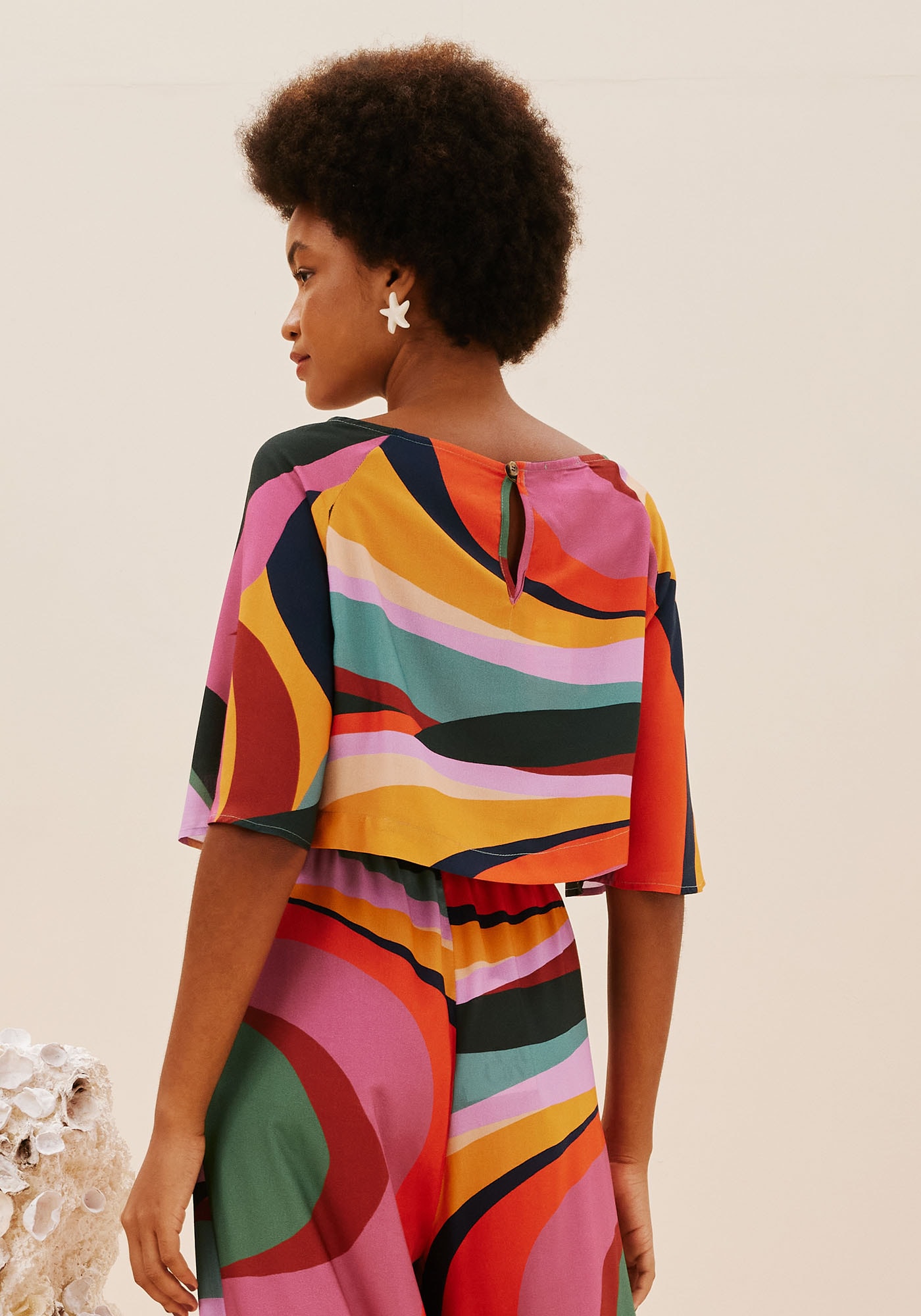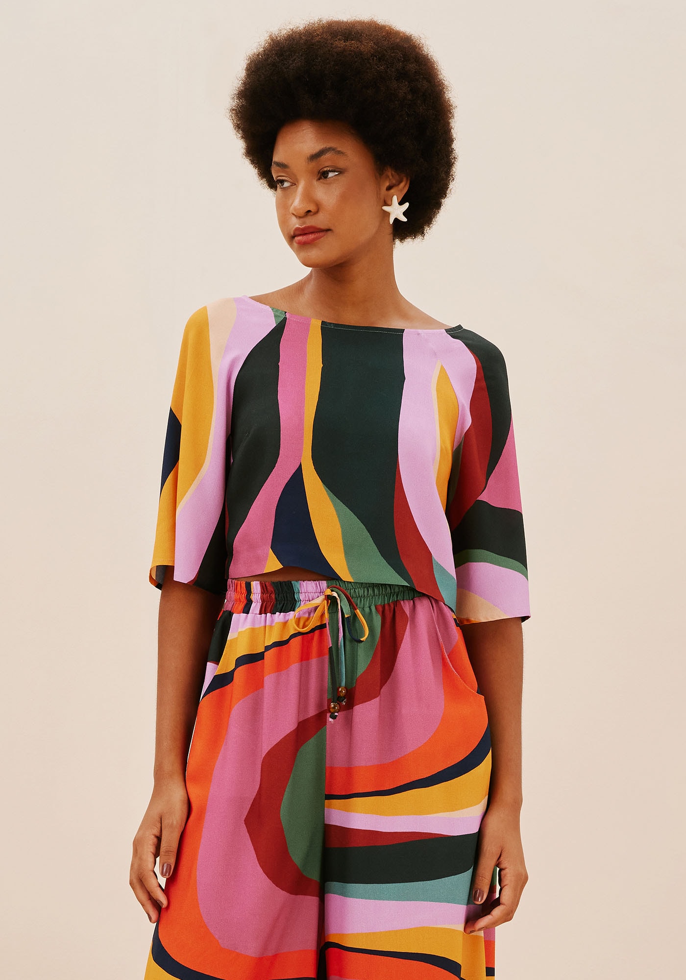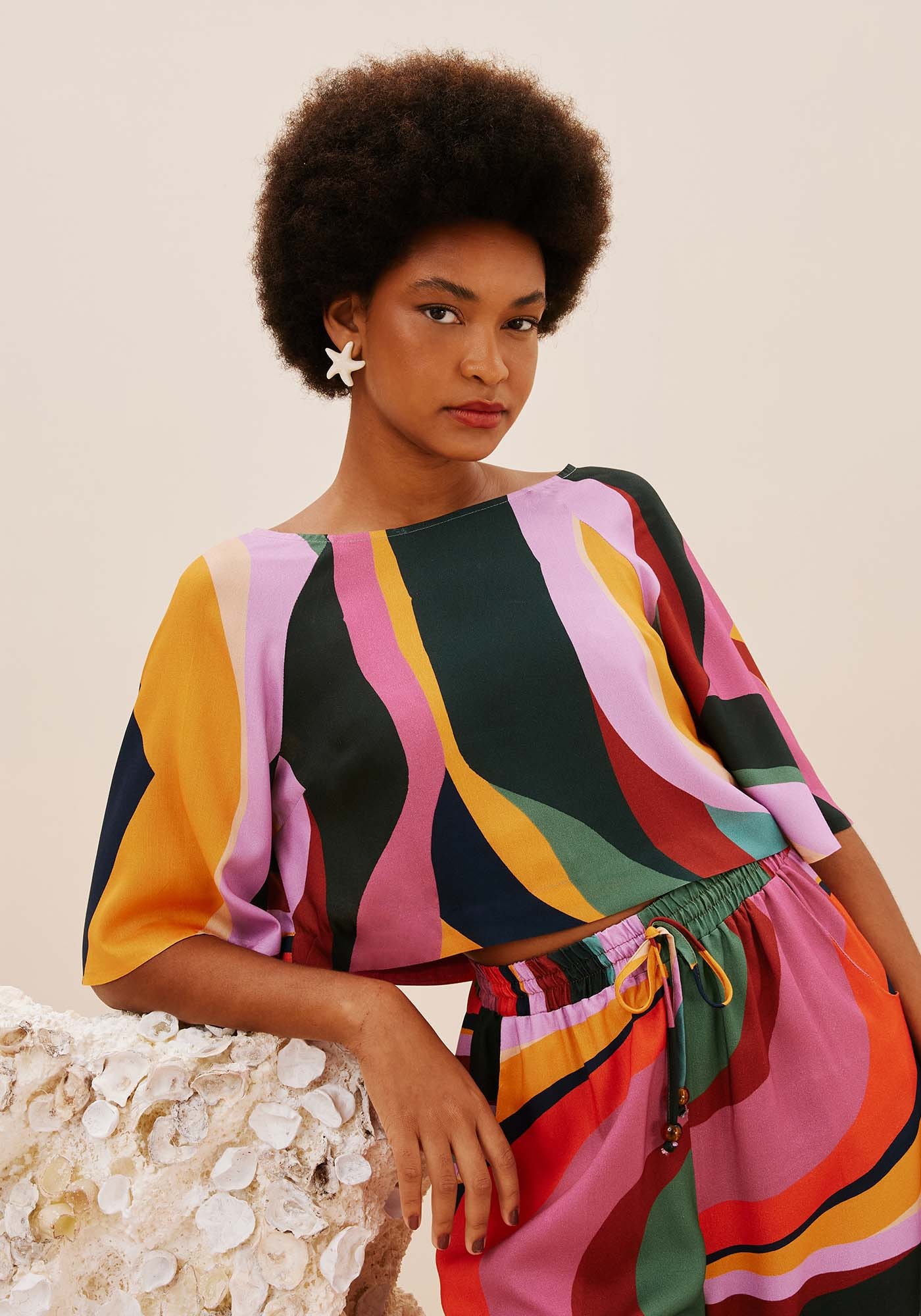 Esta Blusa Estampada Marés sedestaca pelas mangas amplas no estilo raglan que oferecem um toque despojado emoderno ao visual. O decote canoa proporciona sofisticação enquanto oabotoamento em gota nas costas adiciona um detalhe delicado. Confeccionado em 100%Viscose, é ideal para compor looks leves e confortáveis.