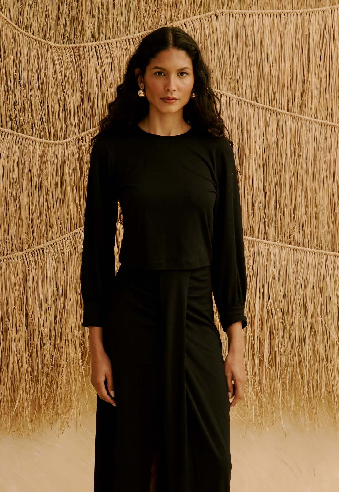 Confeccionada em viscose com elastano, a peça oferece toque macio e elasticidade moderada, ideal para uso prolongado com conforto. Sem forro ou bojo, ela se adapta bem ao corpo e transita com facilidade entre o dia a dia, o trabalho e ocasiões casuais. O design atemporal permite composições com saias de cintura alta, alfaiataria ou jeans, além de acessórios marcantes como brincos estruturados ou bolsas de textura natural.