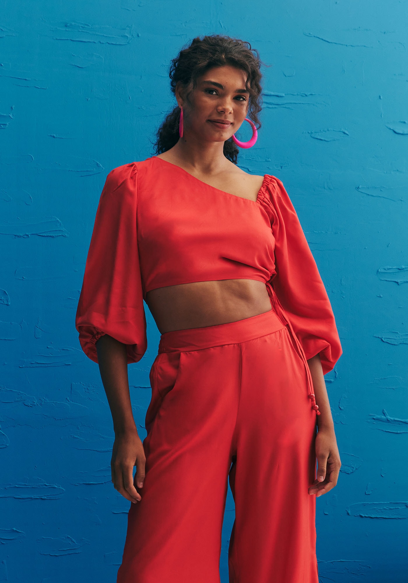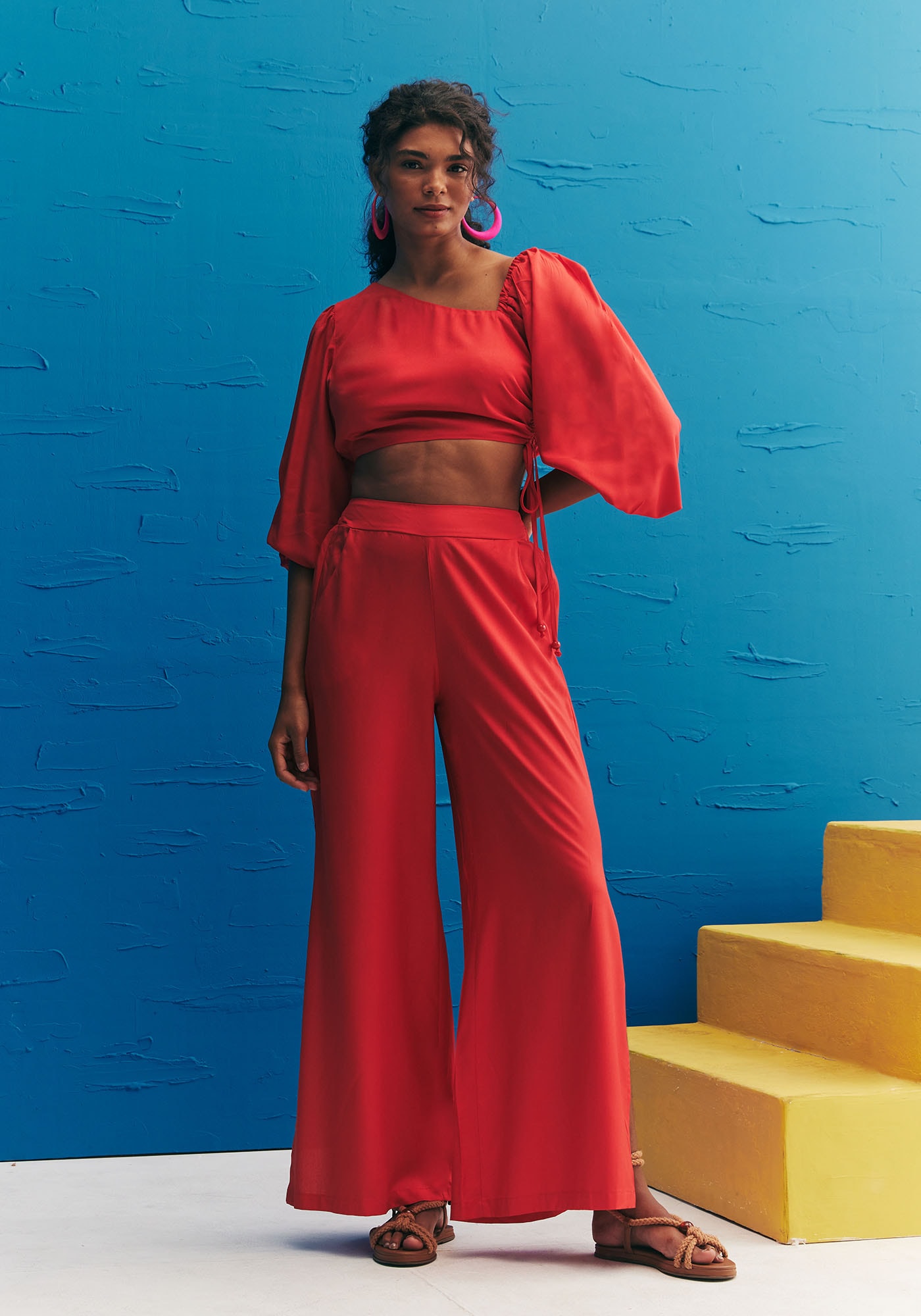 Confeccionadaem tecido 100% viscose, a blusa cropped lisa é simplesmente maravilhosa. A peçapossui uma modelagem moderna e diferenciada, com elástico no ombro e mangabufante. O detalhe franzido na lateral com amarração em túnel é um charme a mais.