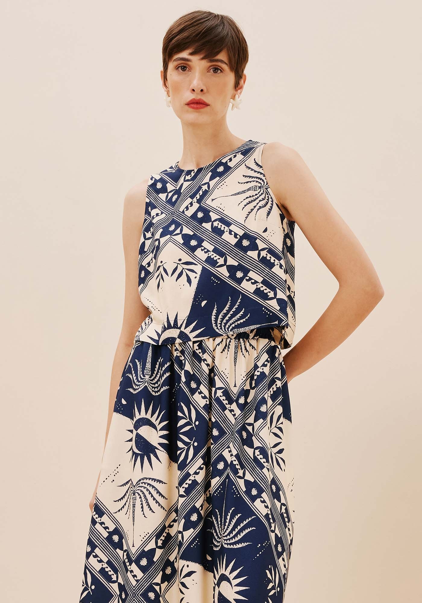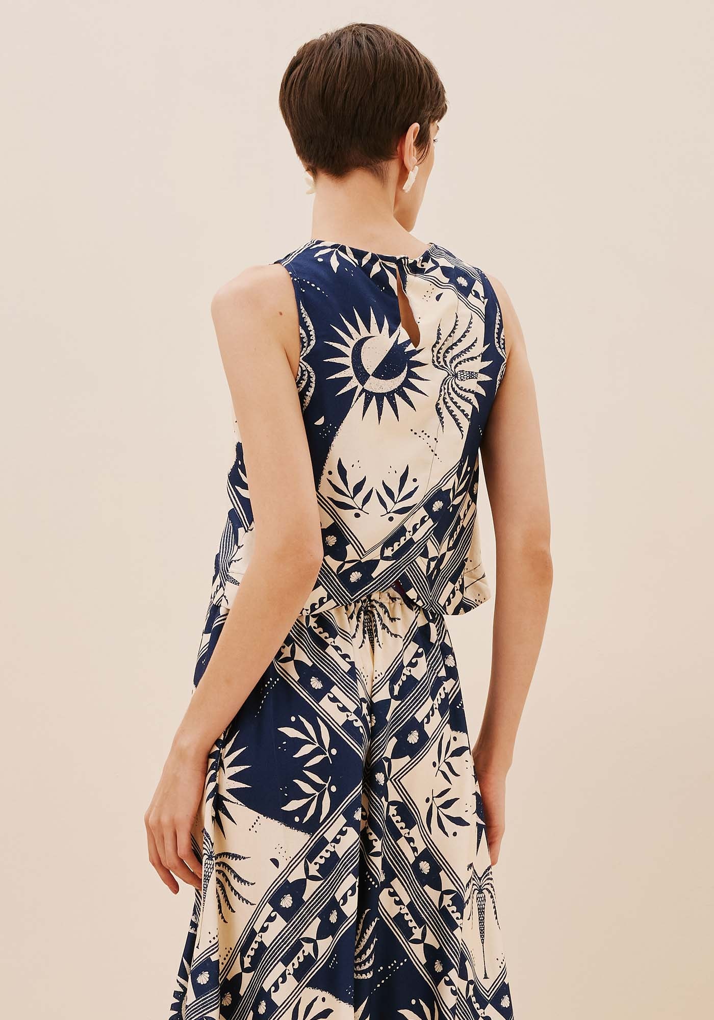 Com design básico e sofisticado,esta Blusa sem mangas apresenta um decote redondo e detalhe de costas emtranspasse que oferece um visual único e charmoso. Possui abotoamento em gotanas costas e se destaca por sua estampa Ceu. Feita em 100% viscose, é um modeloleve e confortável.