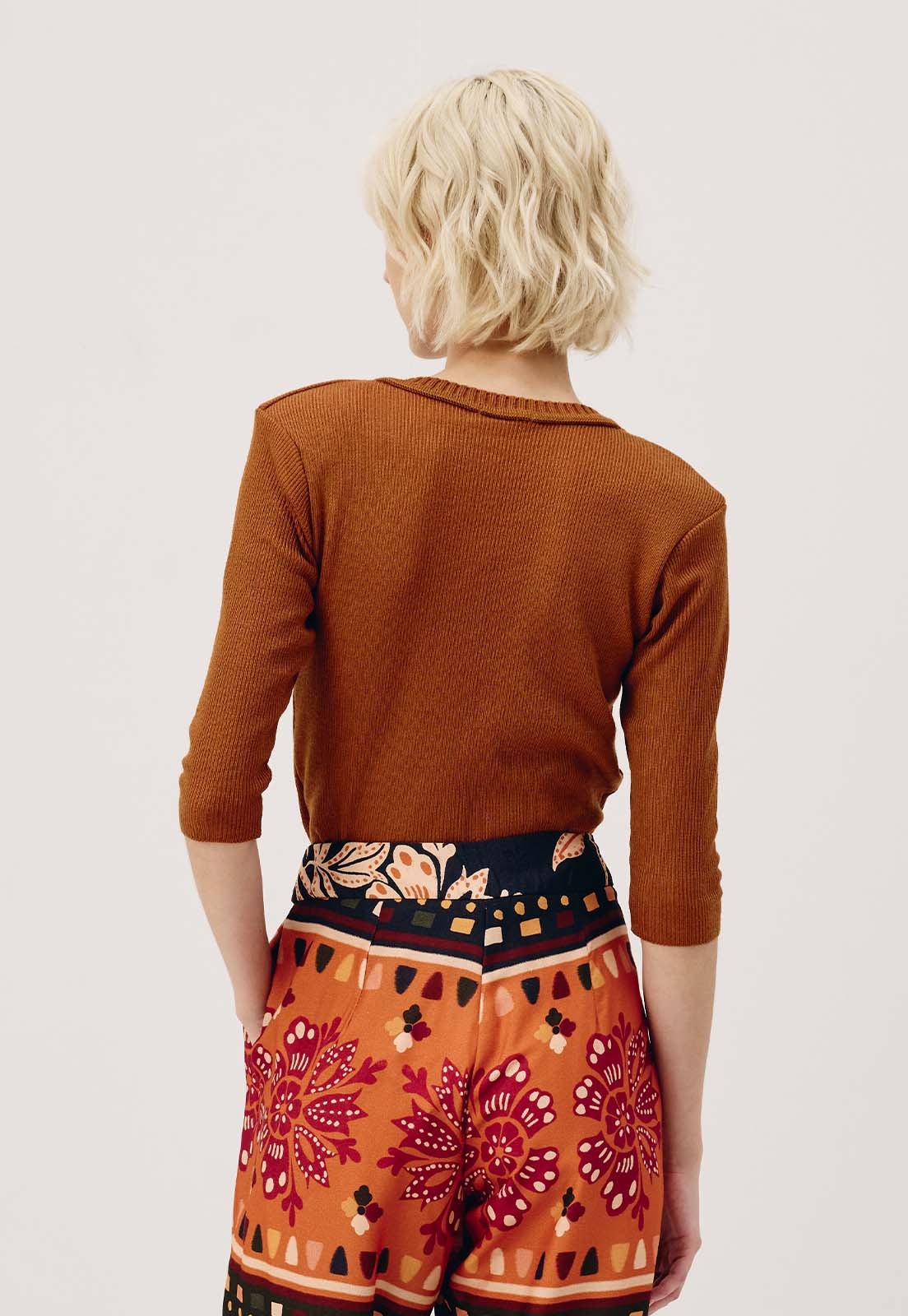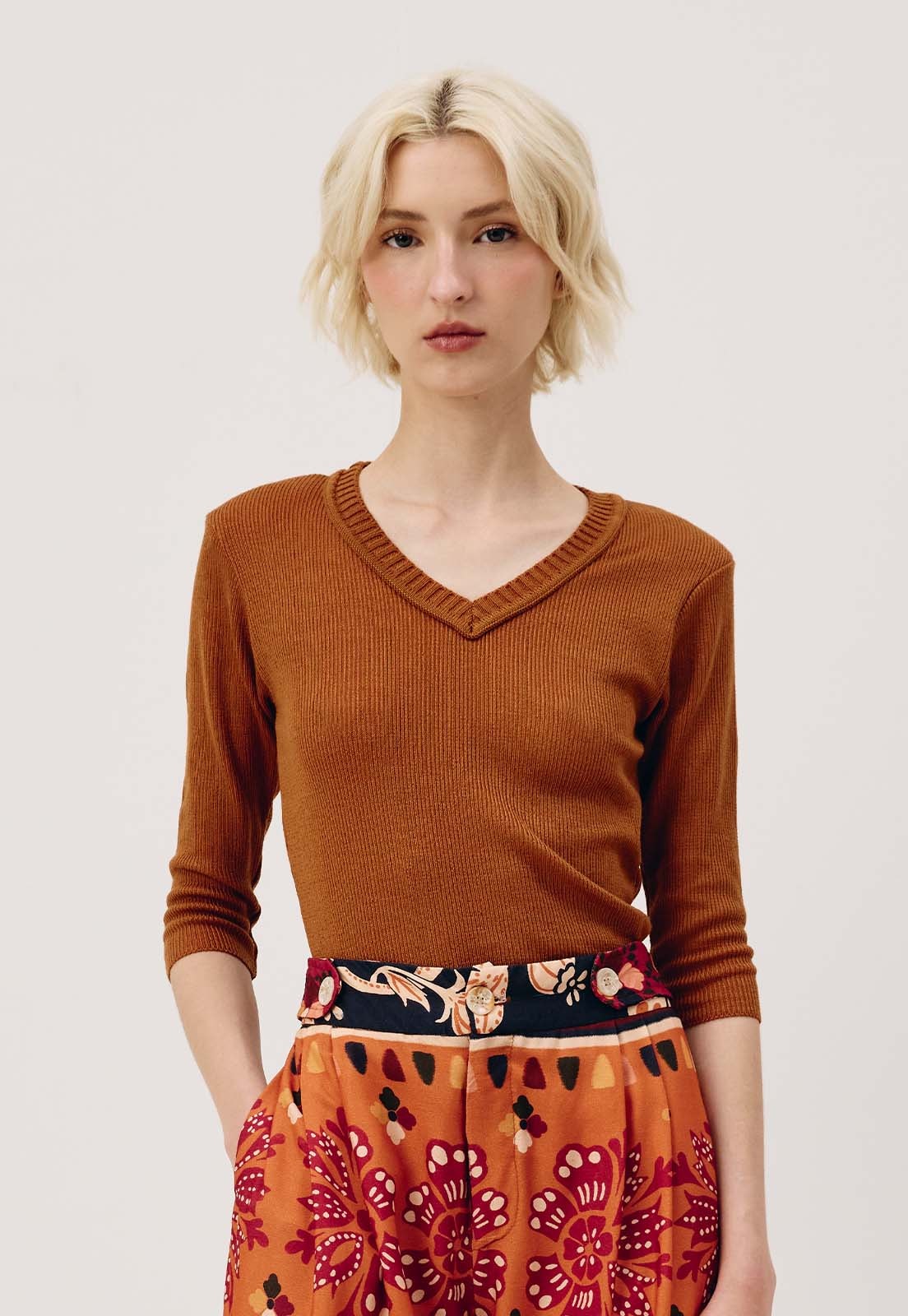 A Blusa Decote V Tricot CaCay é a escolha ideal para quem busca elegância atemporal com toque moderno. Com design canelado e caimento ajustado ao corpo, valoriza a silhueta com conforto e sofisticação. O decote em V e as mangas três quartos criam uma composição equilibrada entre estilo e praticidade, perfeita para transitar do dia a dia ao ambiente profissional com naturalidade. O tricot leve garante liberdade de movimentos e sensação agradável ao toque, ideal para todas as estações.