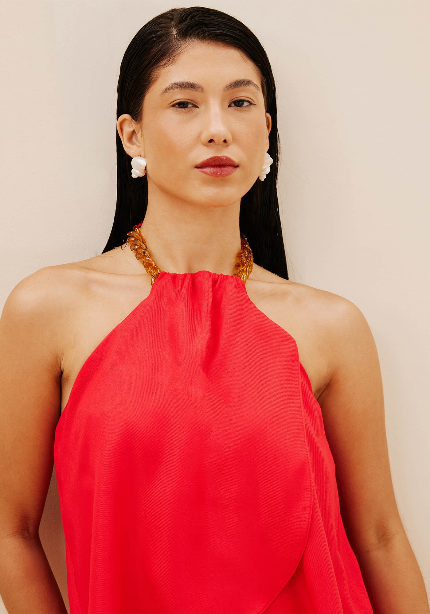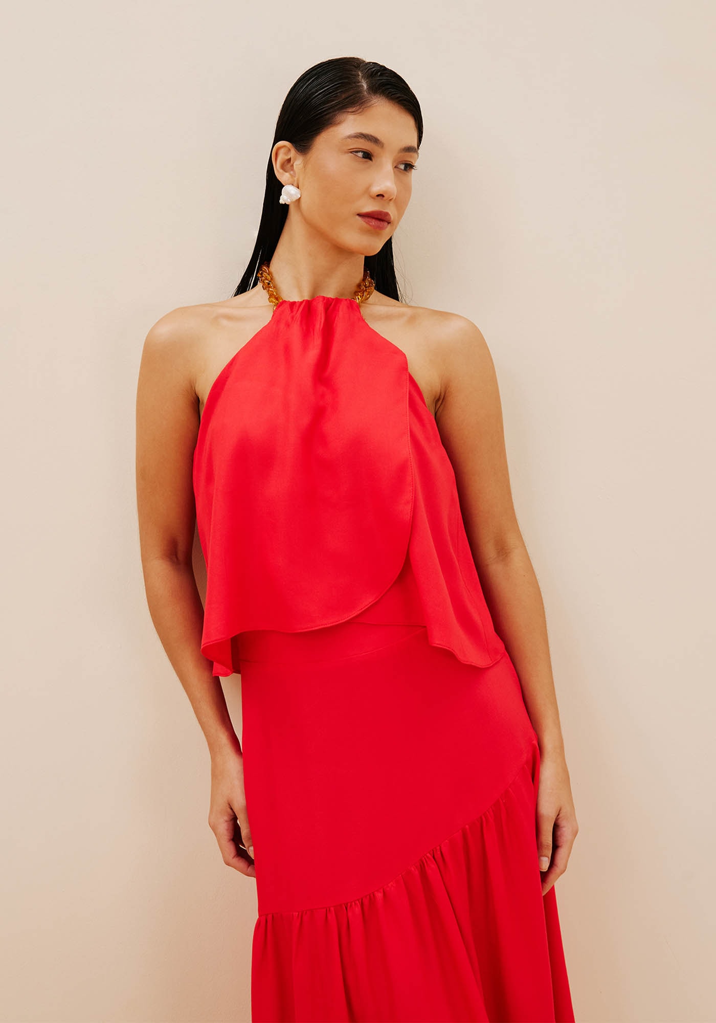 Com decote frente única e um detalhebelíssimo de corrente, a blusa confeccionada em tecido 100% viscose é fina e requintada.O shape mais solto com babado na parte da frente dá fluidez e movimento à peça.