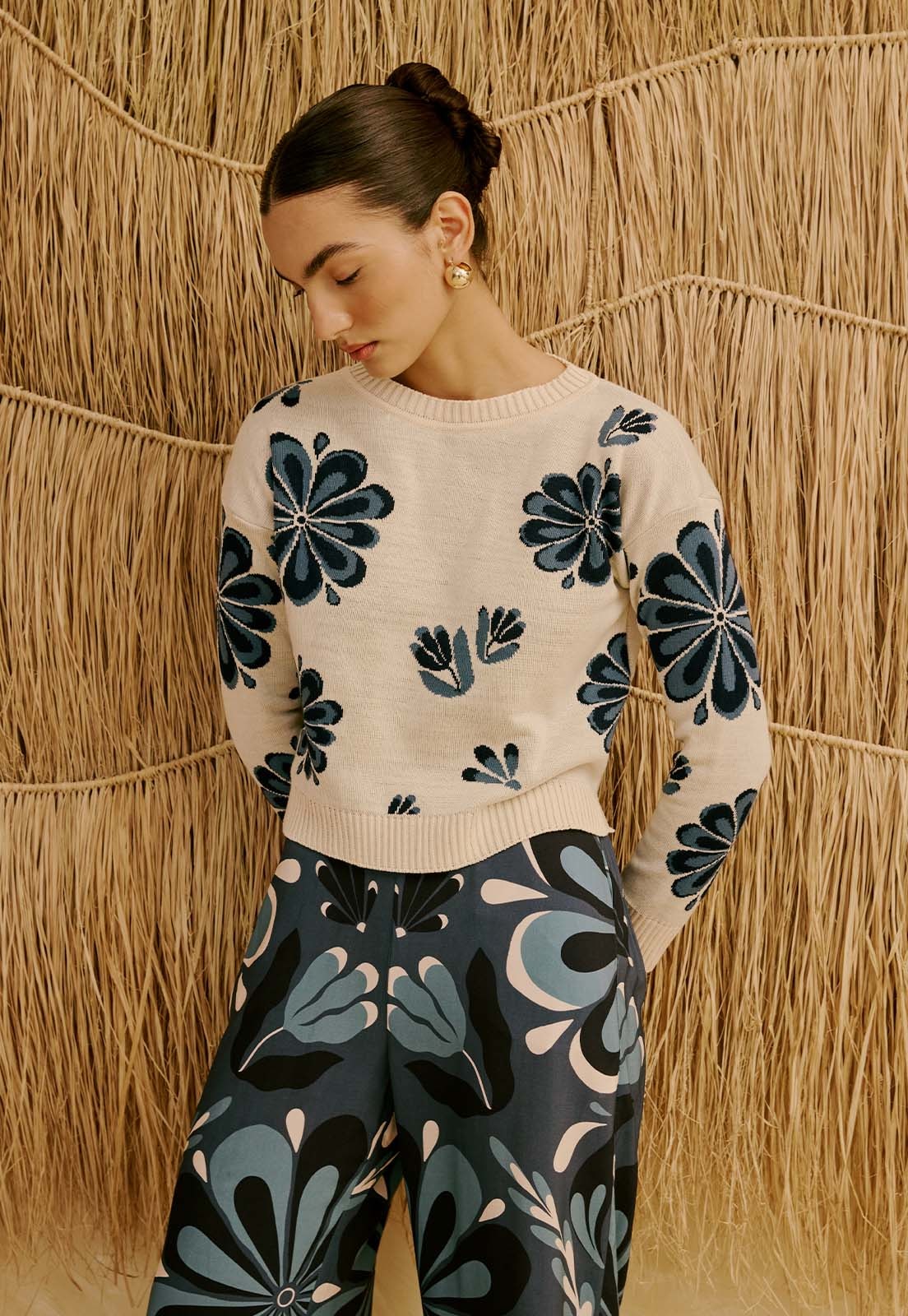 A Blusa em Manga Longa Jacquard Cantuta da CaCay tem modelagem reta e sofisticada, com caimento confortável que acompanha o busto e a cintura, proporcionando equilíbrio visual e versatilidade. A forma é grande, então se estiver em dúvida entre dois tamanhos, recomendamos optar pelo menor e consultar a tabela de medidas para precisão. Na foto, a modelo tem 1,75m de altura, veste manequim 36 e usa o tamanho P.