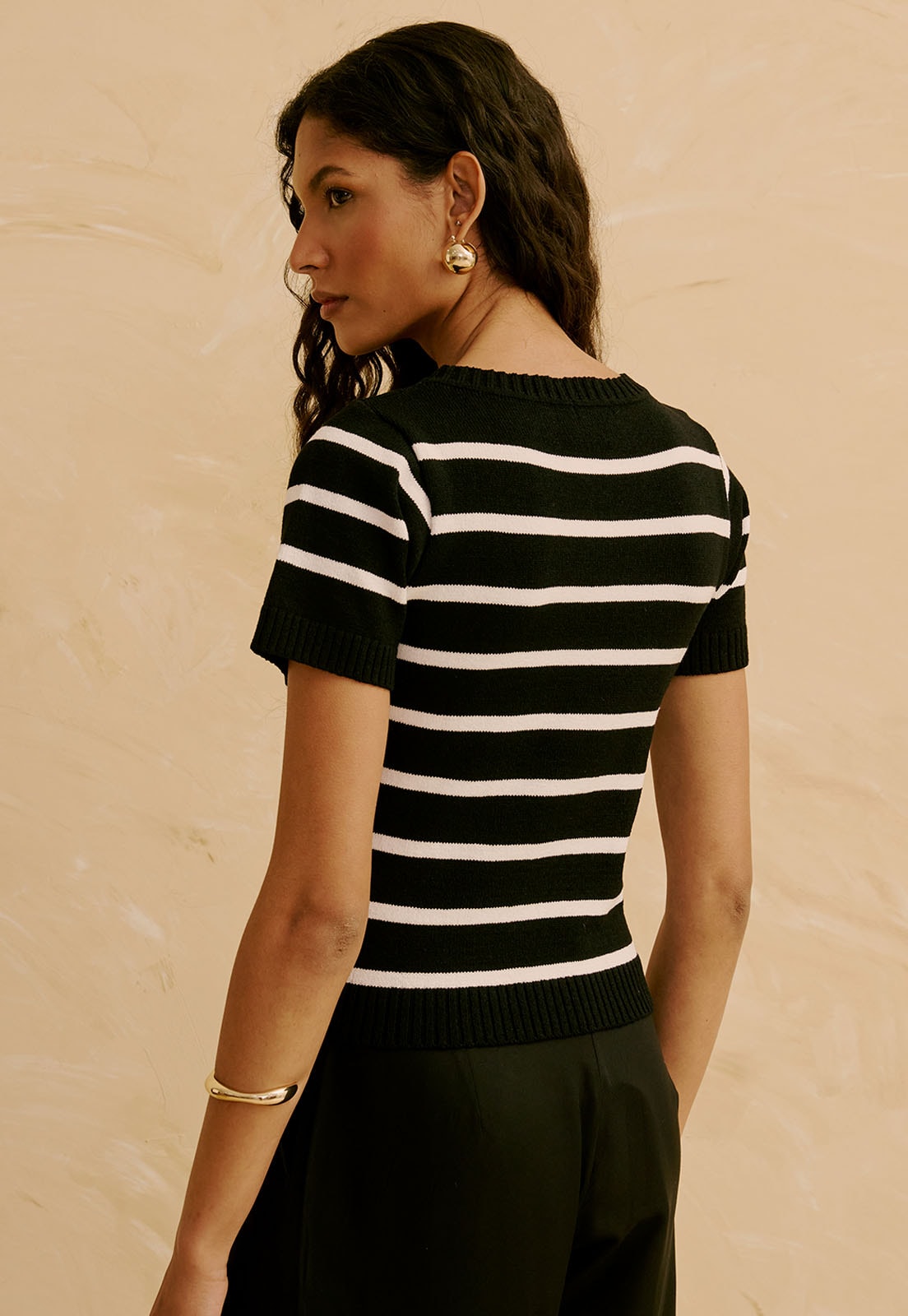 Confeccionada em tricot, com elasticidade moderada e sem transparência, garante conforto prolongado e versatilidade para diferentes ocasiões. O design listrado traz sofisticação discreta, fácil de combinar com alfaiataria, jeans ou saias fluidas. Complemente com acessórios dourados ou uma bolsa estruturada para um toque refinado.
