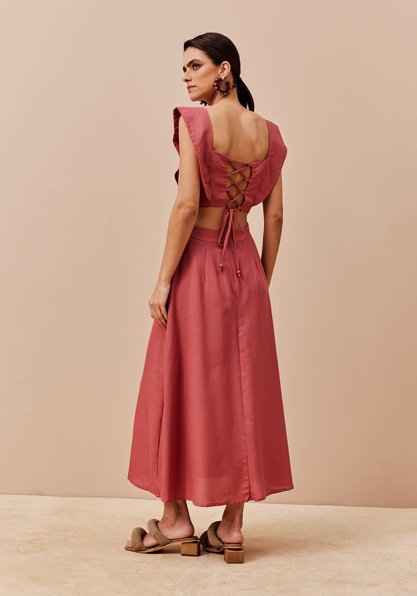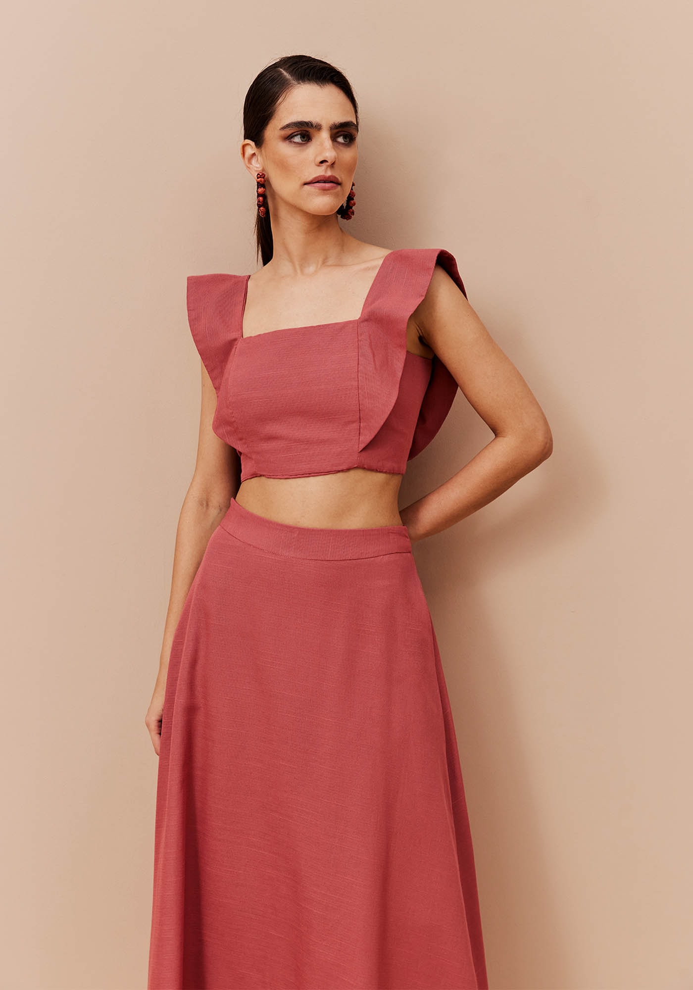A blusa geométrica é confeccionada em tecido 61% viscose e 35% algodão. Possui um decote reto e amarração cruzada nas costas. A alça em babado dá todo o charme para a peça.