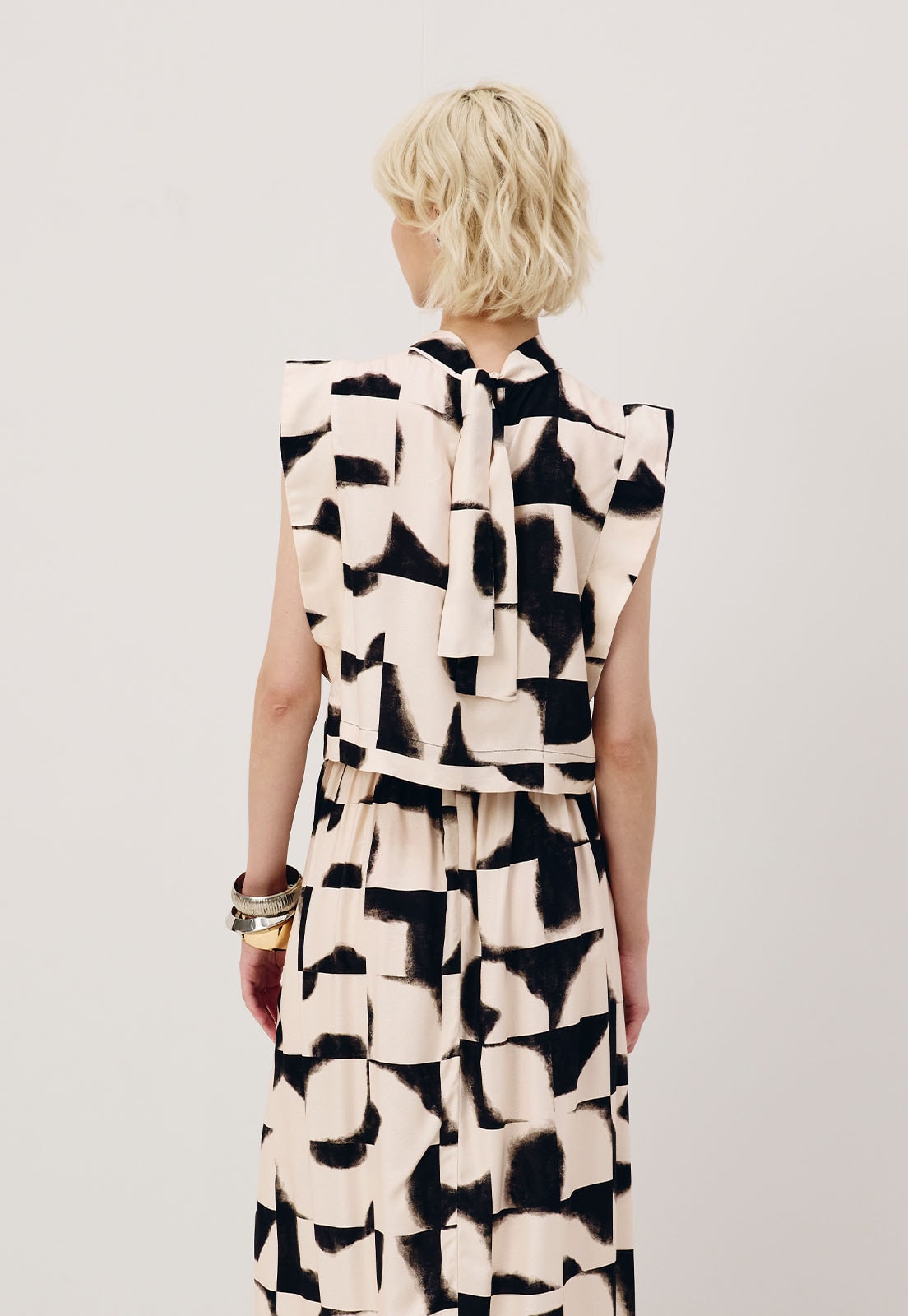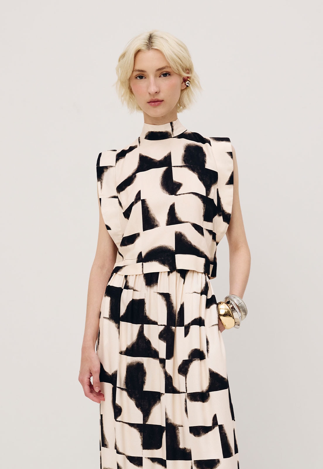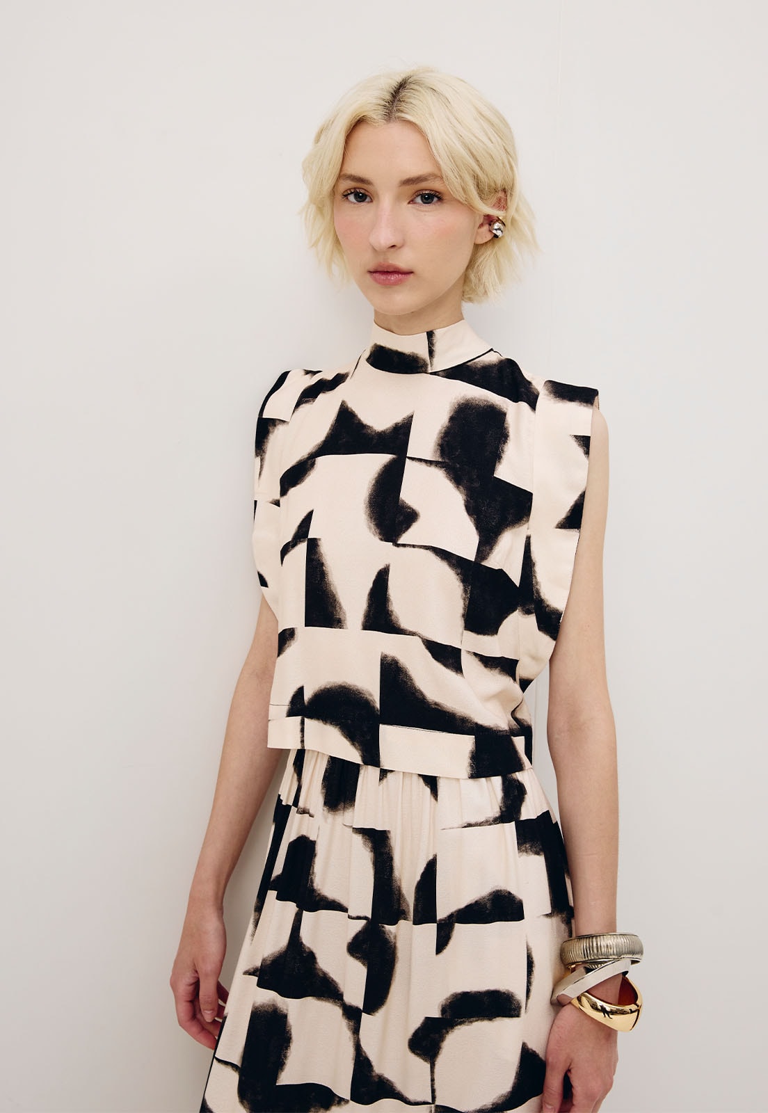Com silhueta moderna e acabamento sofisticado, essa blusa traz gola alta com amarração nas costas e modelagem estilo muscle tee, com ombros marcados e sem mangas. A estampa gráfica dá personalidade à peça, que tem corte reto e comprimento levemente encurtado, ideal para combinar com peças de cintura alta. A amarração nas costas adiciona charme ao visual e possibilita ajuste delicado. Confeccionada em 100% Viscose, o tecido tem toque leve, caimento fluido e acabamento macio.