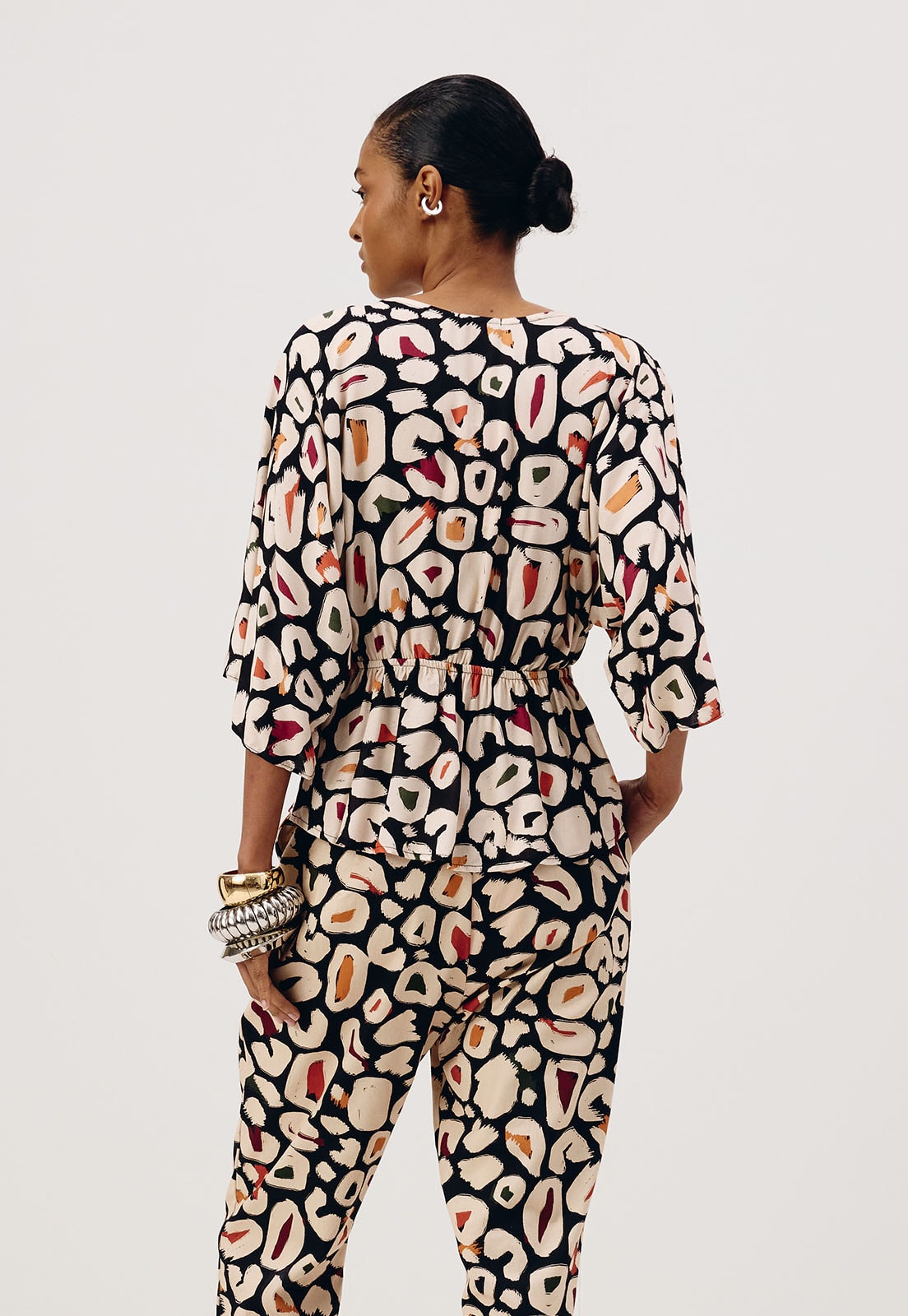 Confeccionada em tecido 100% viscose, a blusa estampada Onza possui manga curta ampla e decote profundo finalizado com ponteira. A modelagem com babado dá um charme para a peça.