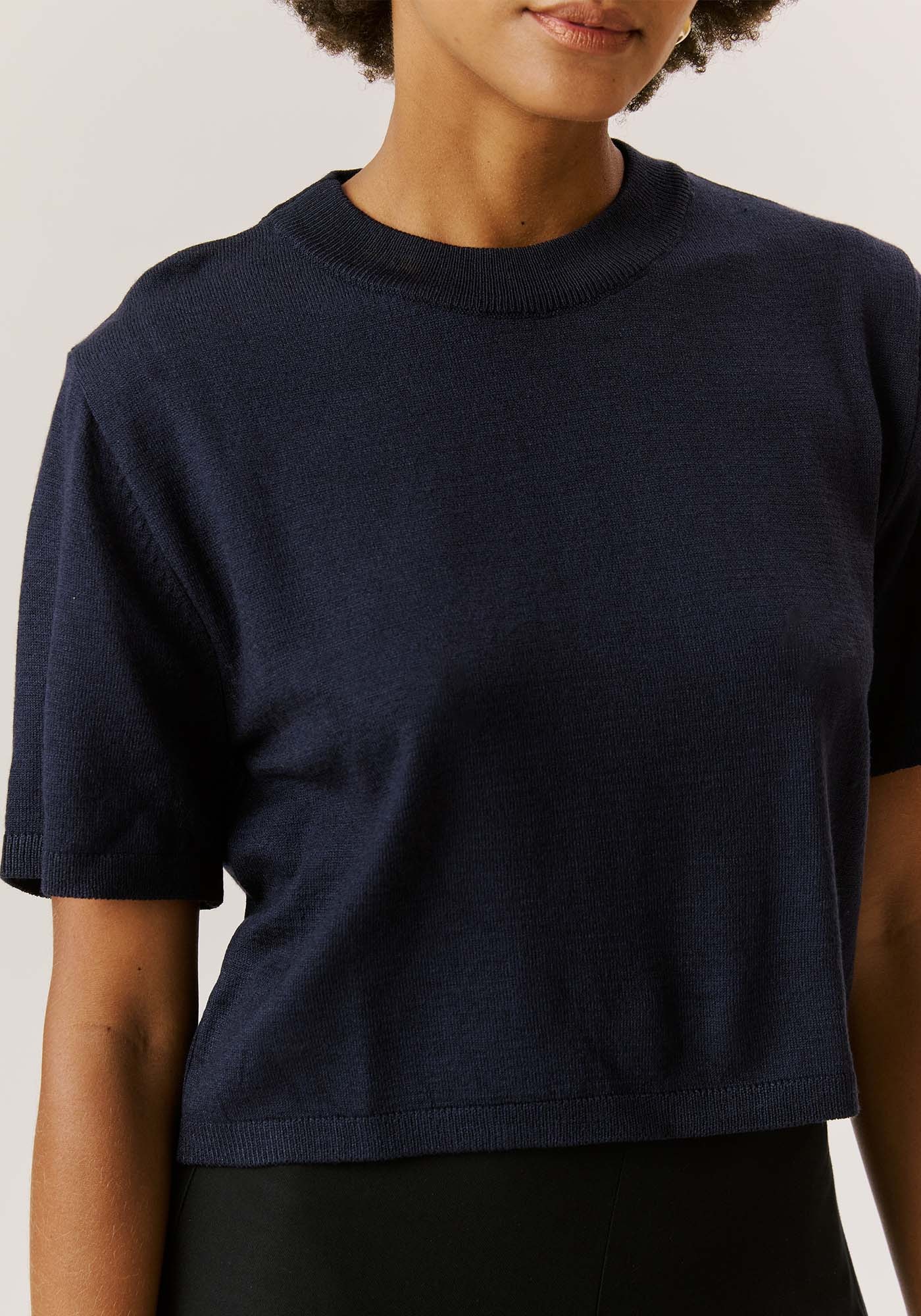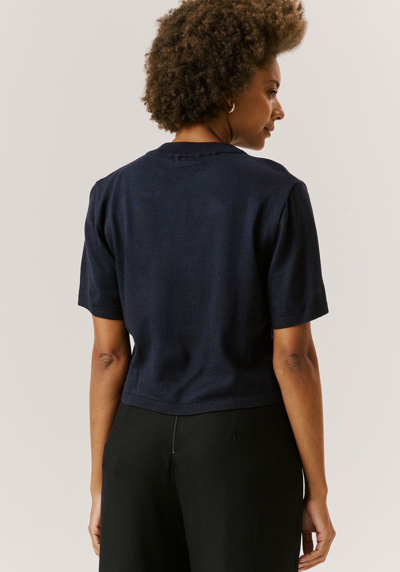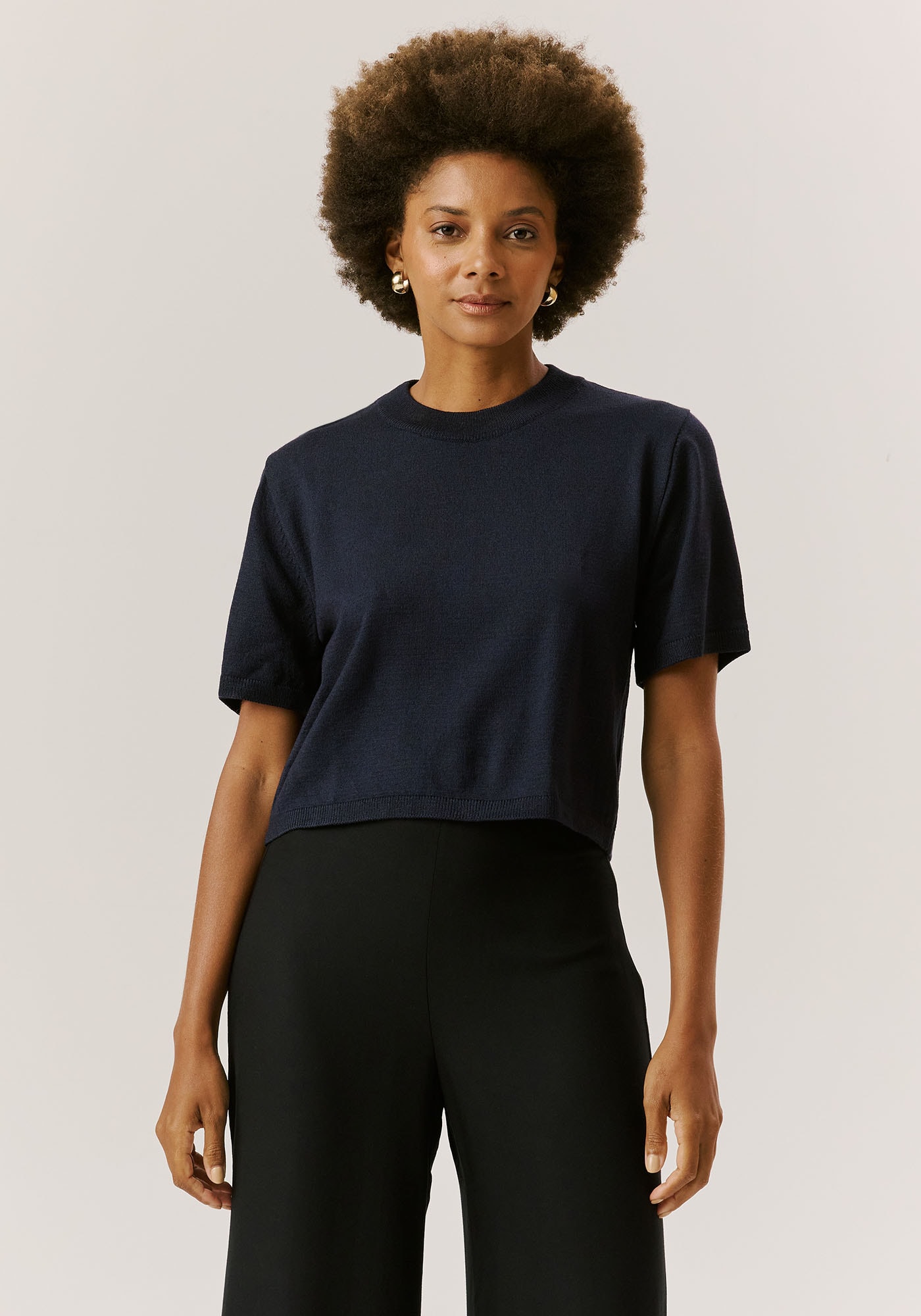 Confortável,sofisticada e atemporal esta blusa em tricot é uma peça indispensável em qualquerguarda-roupas. Com modelagem solta e comprimento cropped, ela oferece um visualcasual e contemporâneo além de proporcionar muito conforto. Apresenta mangas curtase gola arredondada que completam o visual, tornando-a perfeita para combinaçõesbásicas e estilosas no seu dia-a-dia.