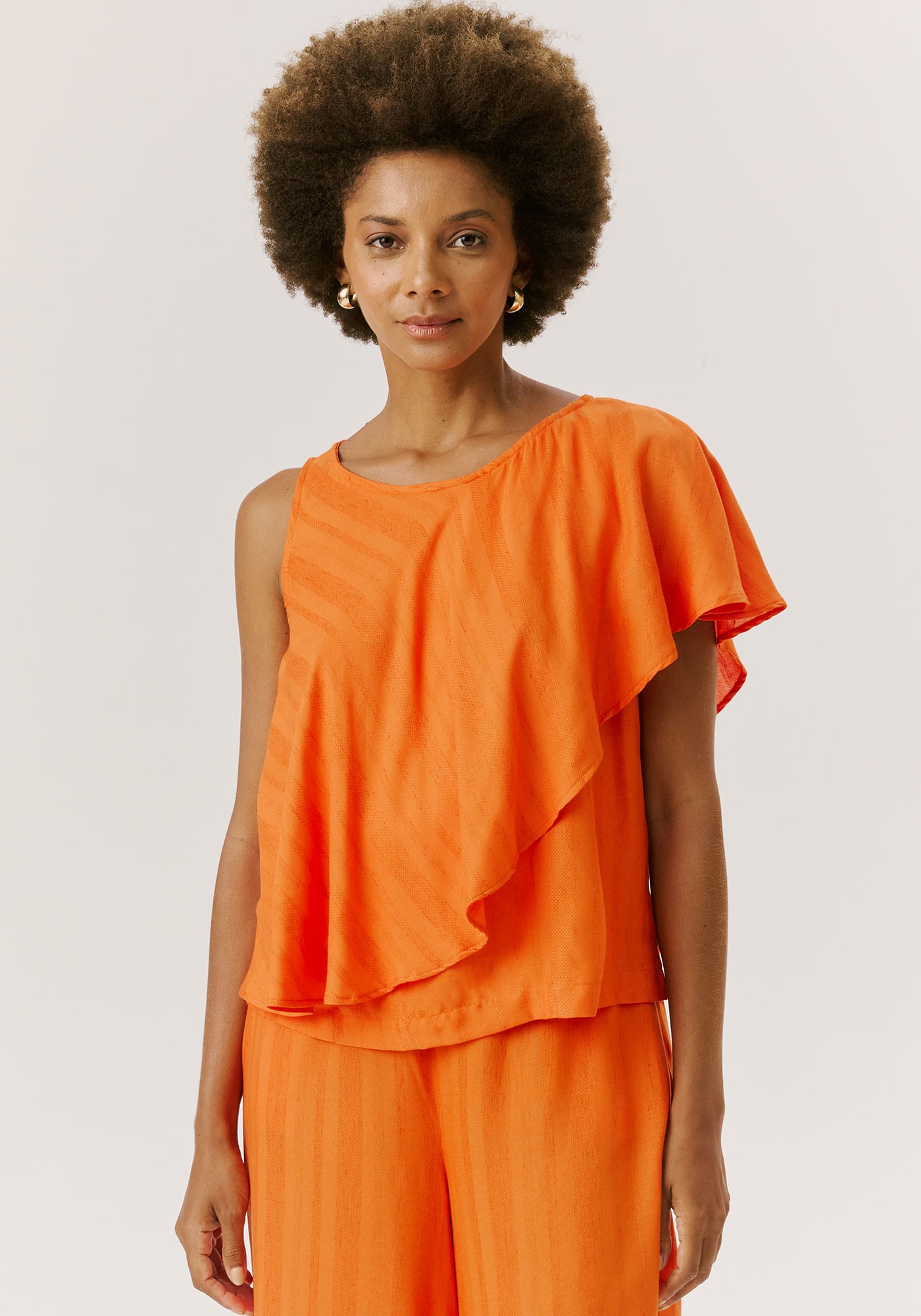 A blusa estilo regata éconfeccionada em tecido 97% viscose e 3% linho e possui um estilo autêntico emoderno. O modelo com gola redonda contém babados na parte da frente que vãoaté um dos ombros, causando um efeito visual lindíssimo.