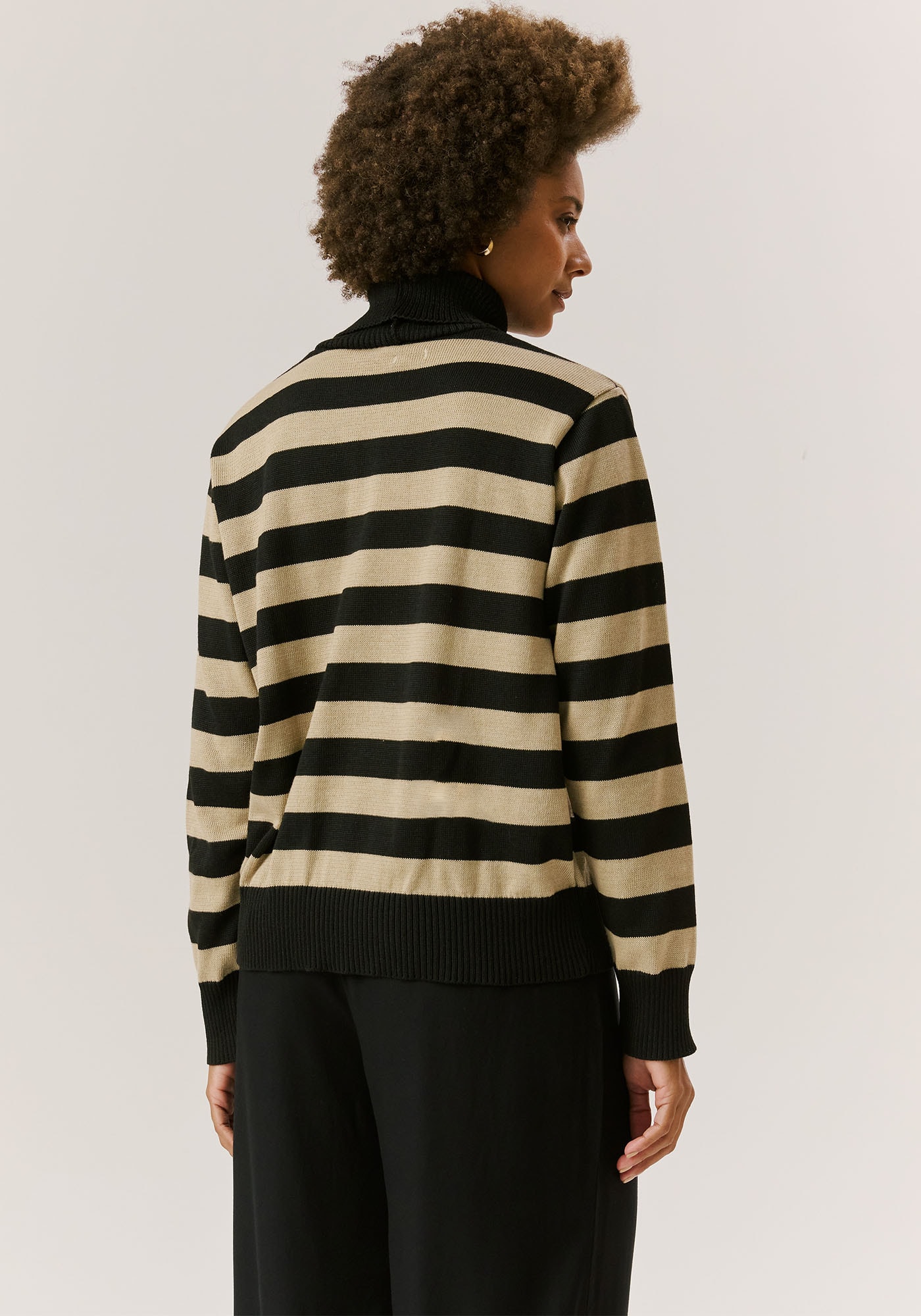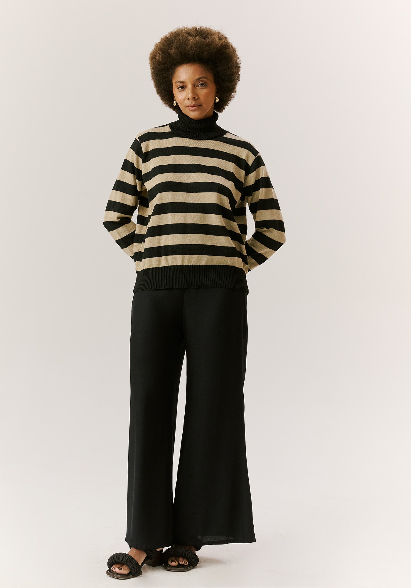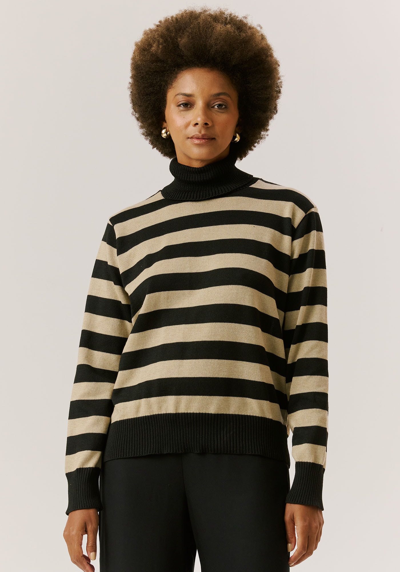Perfeita para os dias frios, establusa possui mangas longas e gola alta. Confeccionada em tricot, é de modelagemampla e apresenta estampa listrada que adiciona um diferencial à esta peça.