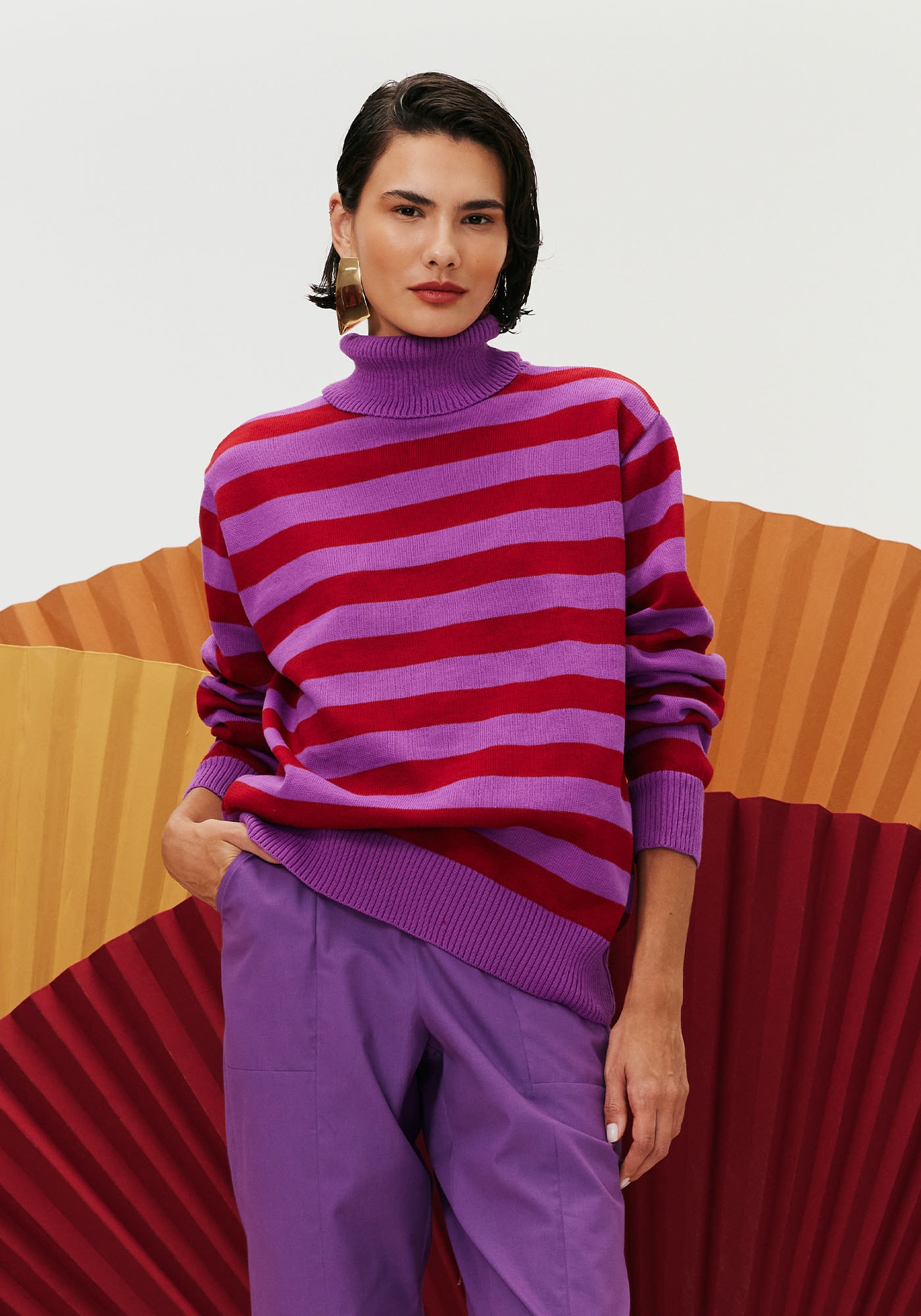Perfeita para os dias frios, establusa possui mangas longas e gola alta. Confeccionada em tricot, é de modelagemampla e apresenta estampa listrada que adiciona um diferencial à esta peça.