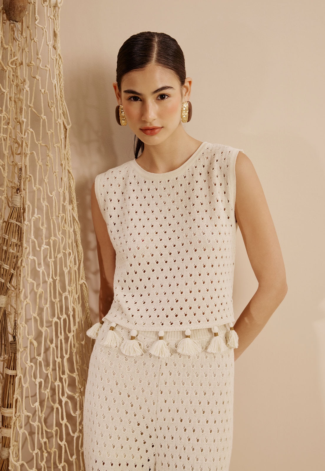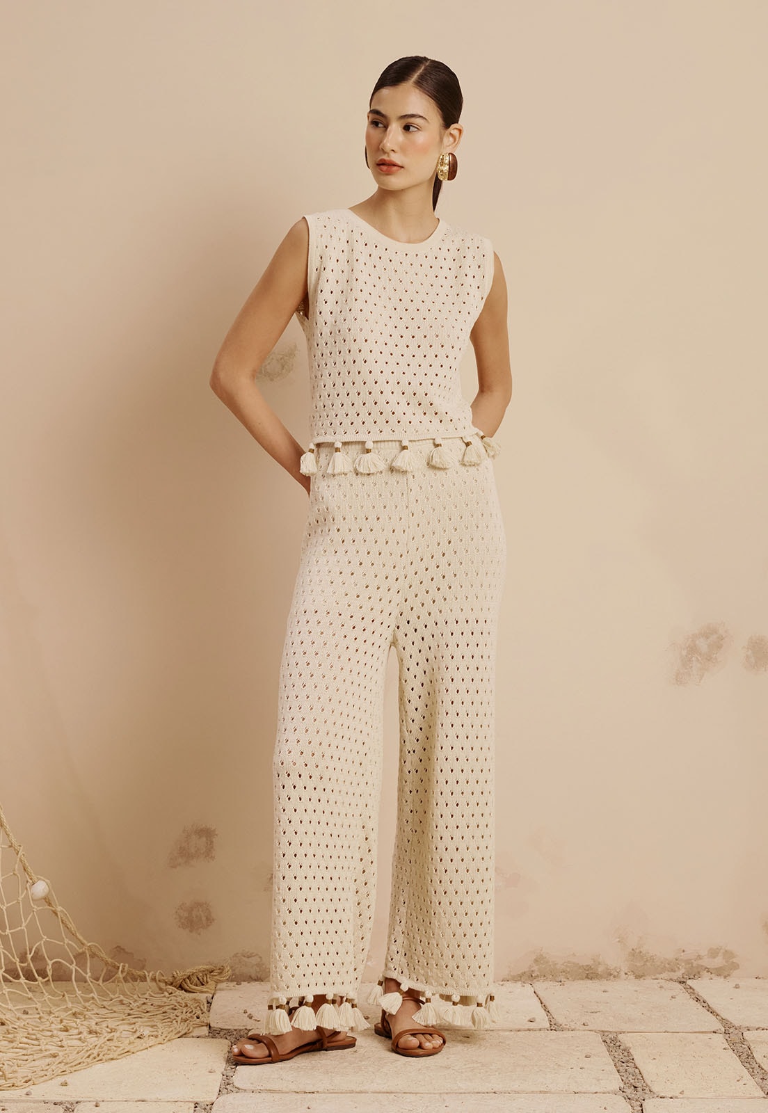 A Blusa Tricot Tassel CaCay é a escolha perfeita para quem busca leveza e estilo em uma única peça. Com design sem mangas e textura de tricô vazado, ela proporciona um caimento fluido e confortável, ideal para dias mais quentes ou composições em camadas. A gola redonda valoriza o colo com sofisticação, enquanto os delicados tassels aplicados na barra adicionam movimento e charme ao visual. Seu acabamento artesanal e os detalhes em trama aberta revelam uma estética contemporânea com toque boho, perfeita para quem aprecia moda com personalidade.
