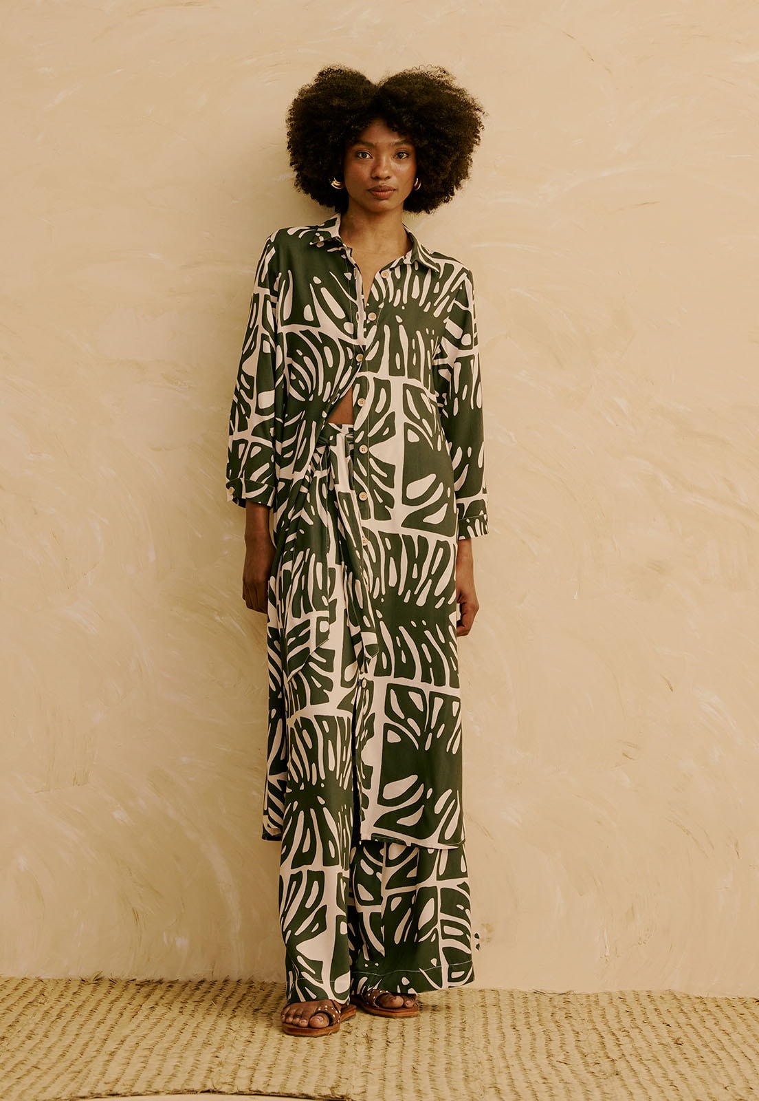 A Calça Amarração Estampada Totora da CaCay tem modelagem ampla e elegante, garantindo conforto e movimento natural. A forma é grande, então se estiver em dúvida entre dois tamanhos, recomendamos optar pelo menor. Consulte a tabela de medidas para maior precisão. A modelo da foto tem 1,75m, veste manequim 36 e está usando o tamanho P.
