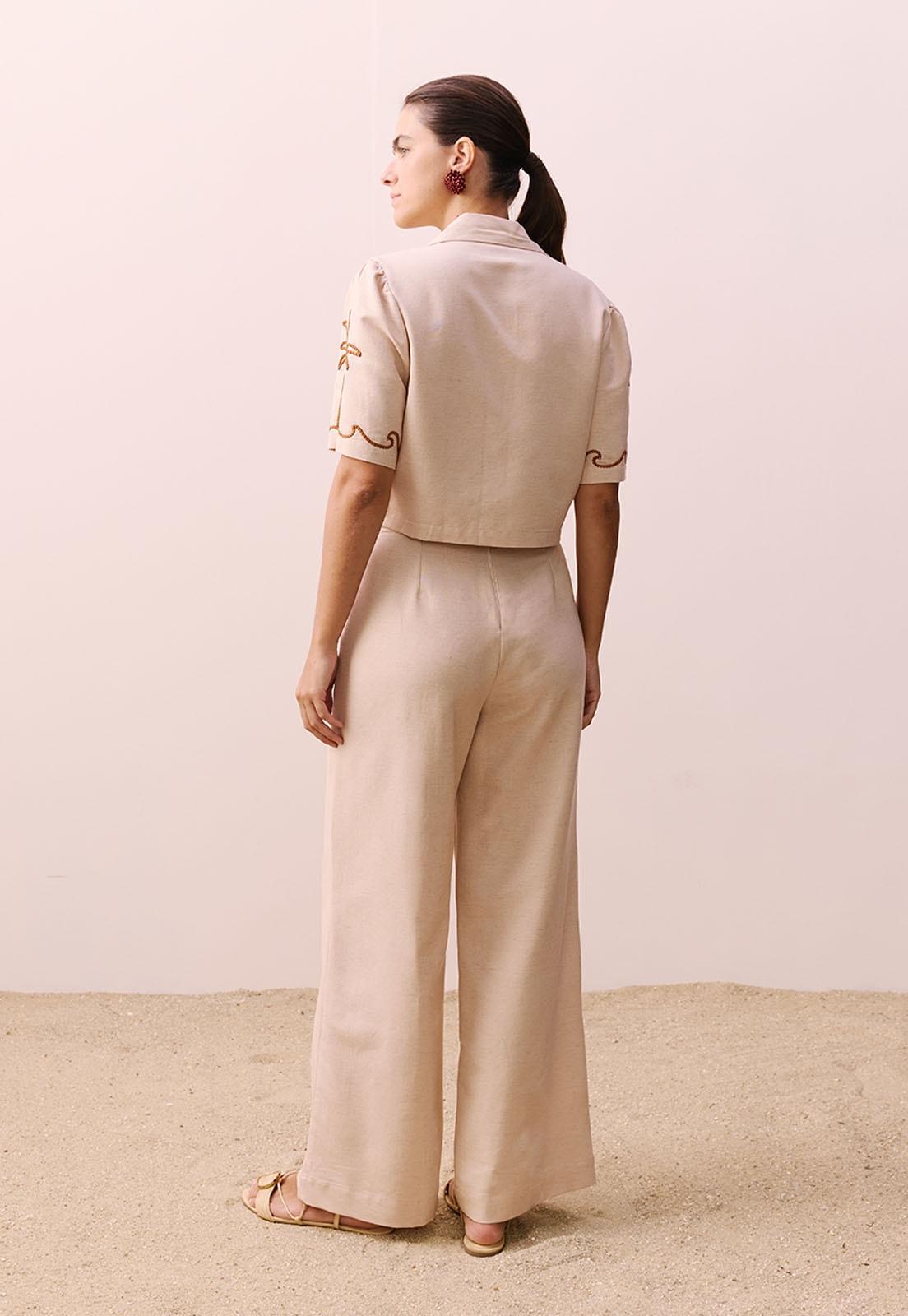 A Calça Bordado Corda CaCay combina sofisticação artesanal com conforto contemporâneo. Com cintura alta e corte reto, seu caimento amplo valoriza diferentes silhuetas, oferecendo liberdade de movimento e elegância atemporal. O bordado exclusivo na barra com desenhos de palmeiras e linhas orgânicas adiciona um toque artístico e natural, ideal para quem busca peças com identidade. Confeccionada em um tecido leve e respirável, sua composição traz 42% algodão, 38% viscose, 14% modal e 6% linho uma mistura que garante conforto térmico, toque macio e excelente caimento.