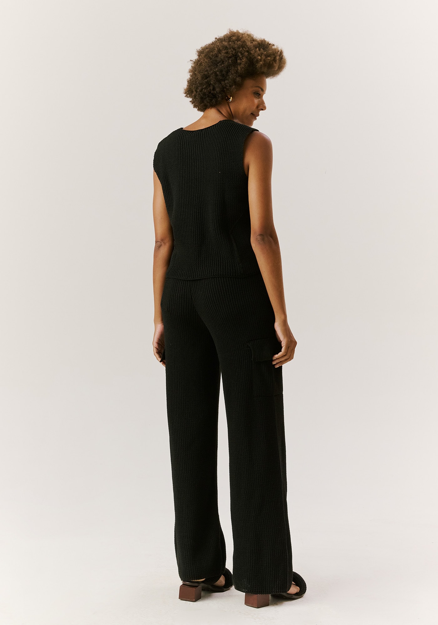 A calça de tricot é uma peçaprática e confortável. O modelo em tricot pode ser usado em dias mais frescos ecombina com outras composições.