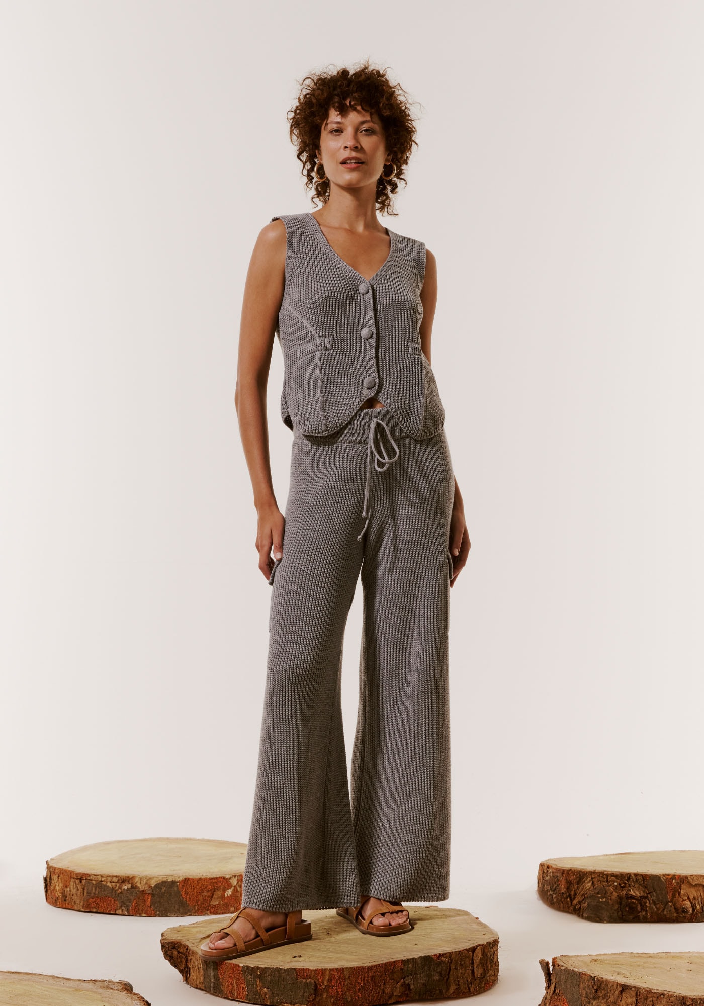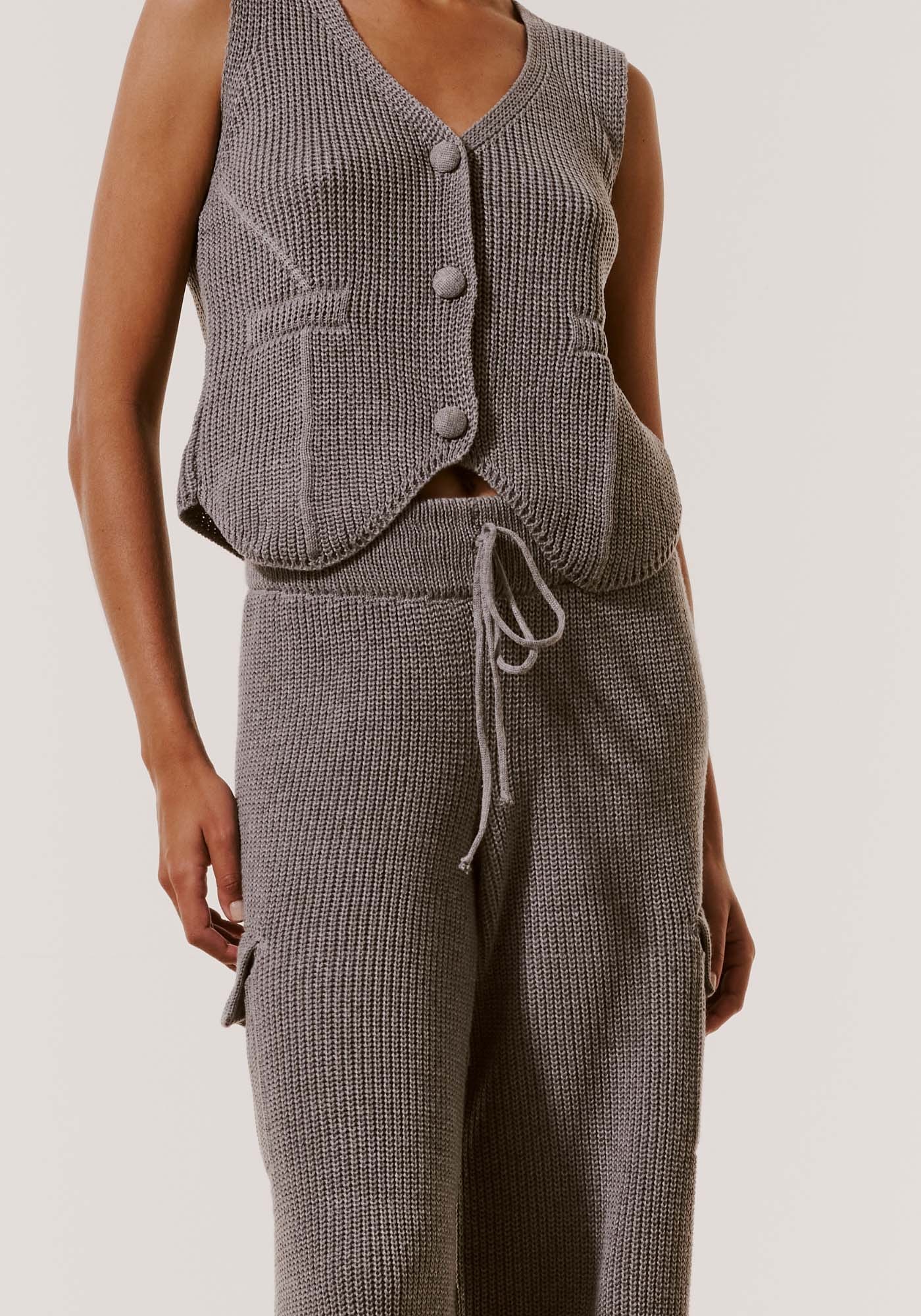 A calça de tricot é uma peçaprática e confortável. O modelo em tricot pode ser usado em dias mais frescos ecombina com outras composições.