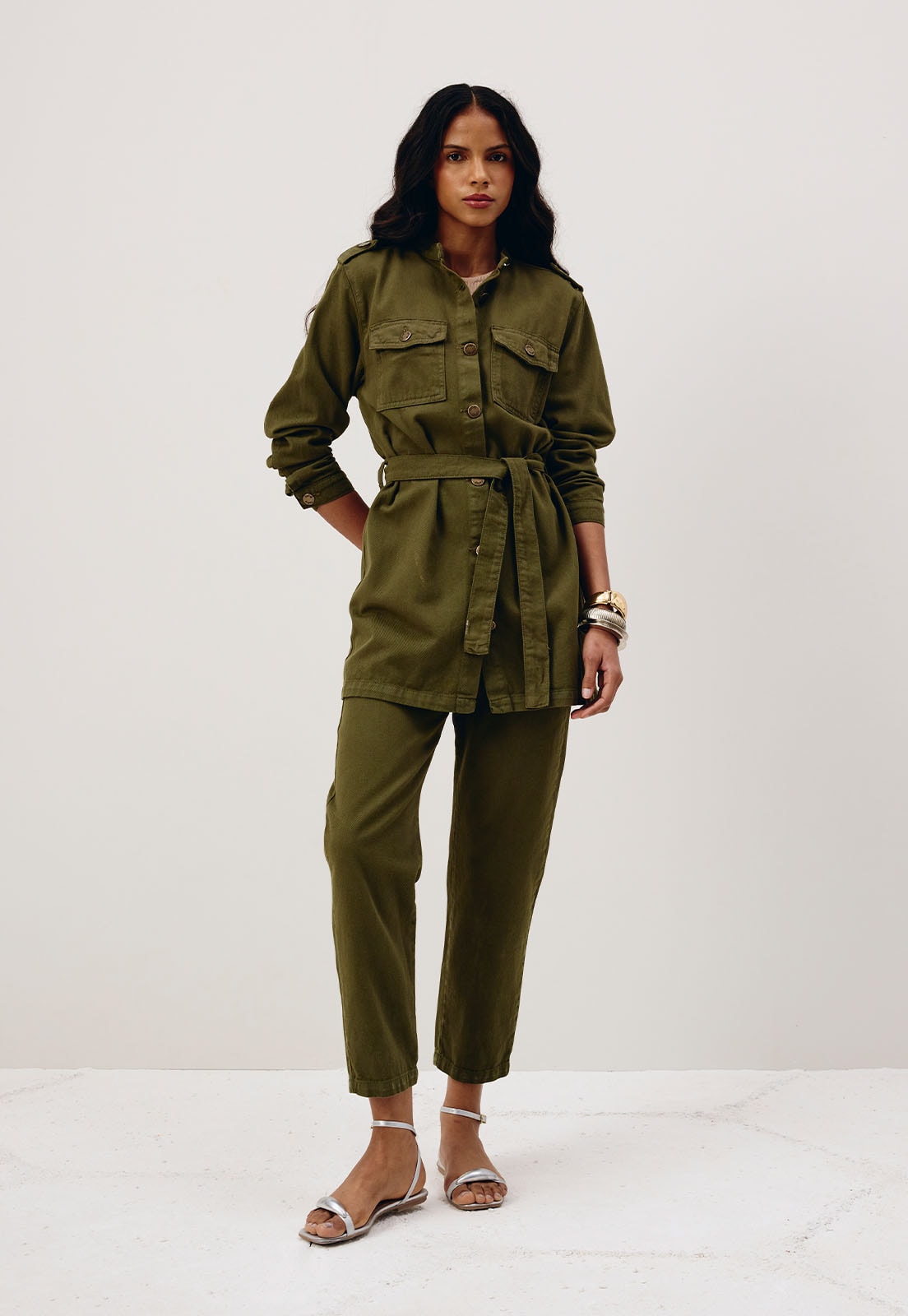 A calça cenoura é confeccionada em sarja 100% algodão. É um modelo moderno cintura alta com recortes na parte da frente e fechamento em botão duplo e zíper.