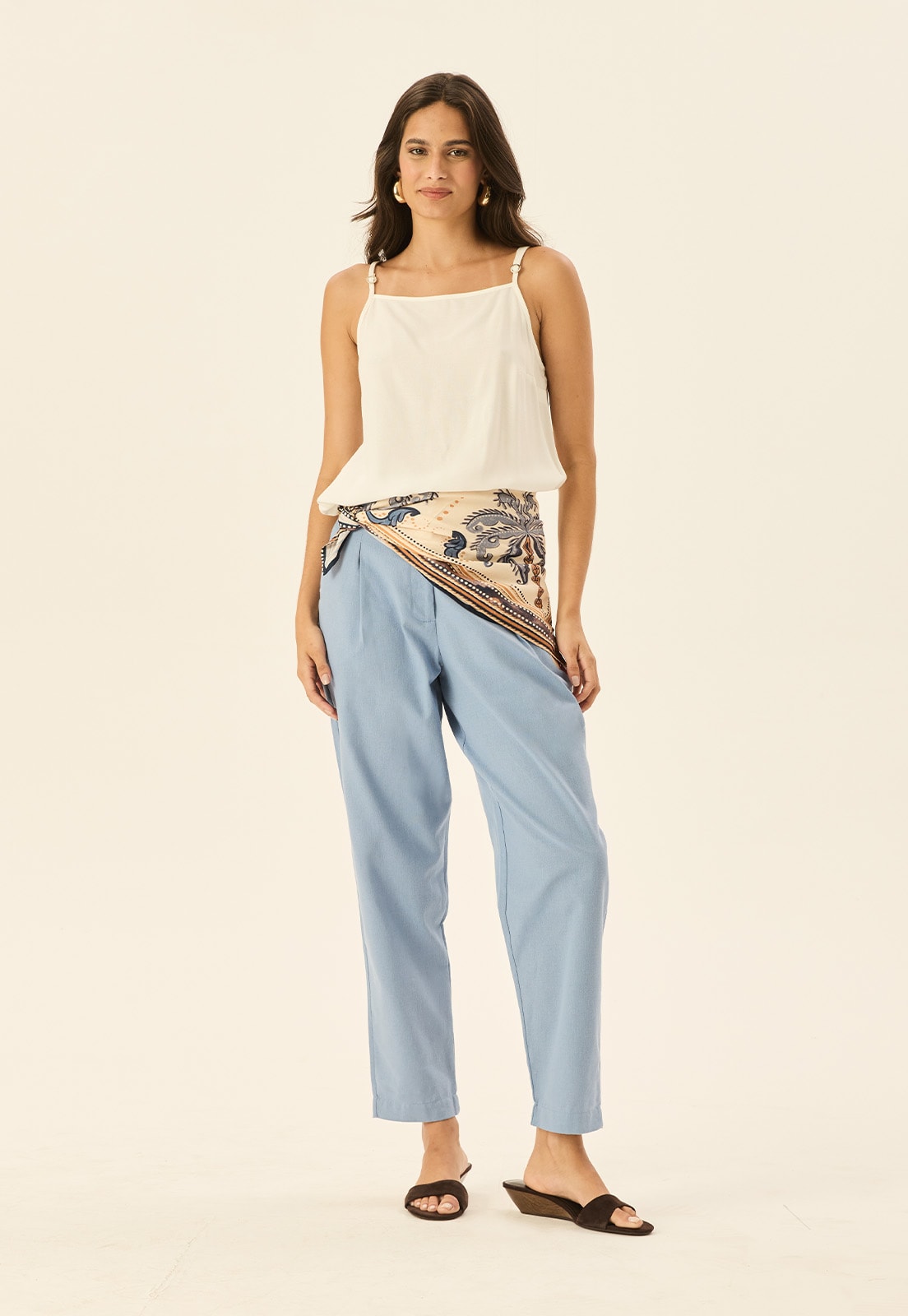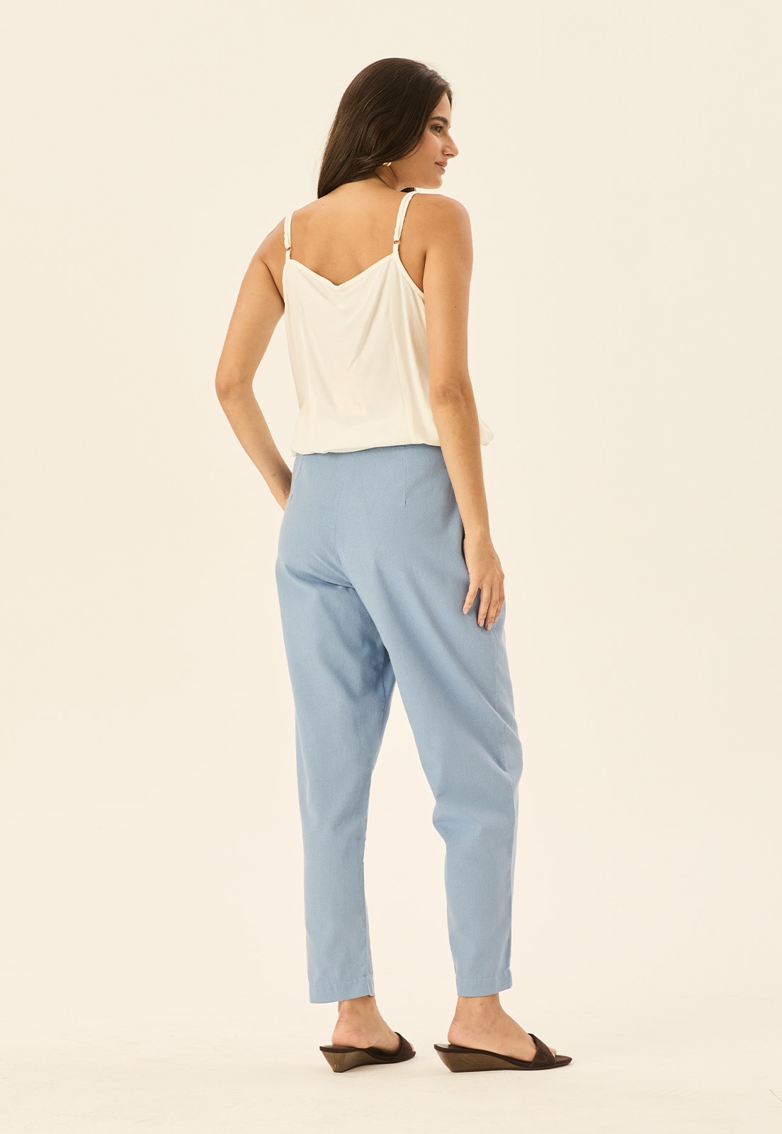 Versátil e atemporal, essa calça combina facilmente com camisas de linho, blusas estruturadas ou até mesmo t-shirts básicas. Para um visual completo, aposte em sandálias de tiras, mules ou tênis minimalistas. A modelo veste tamanho P e tem 1,77m de altura.