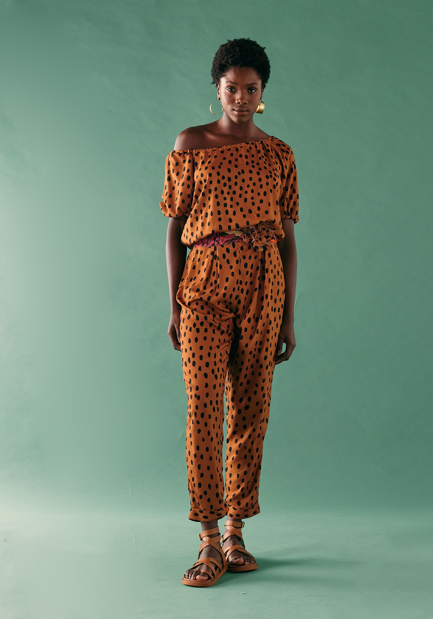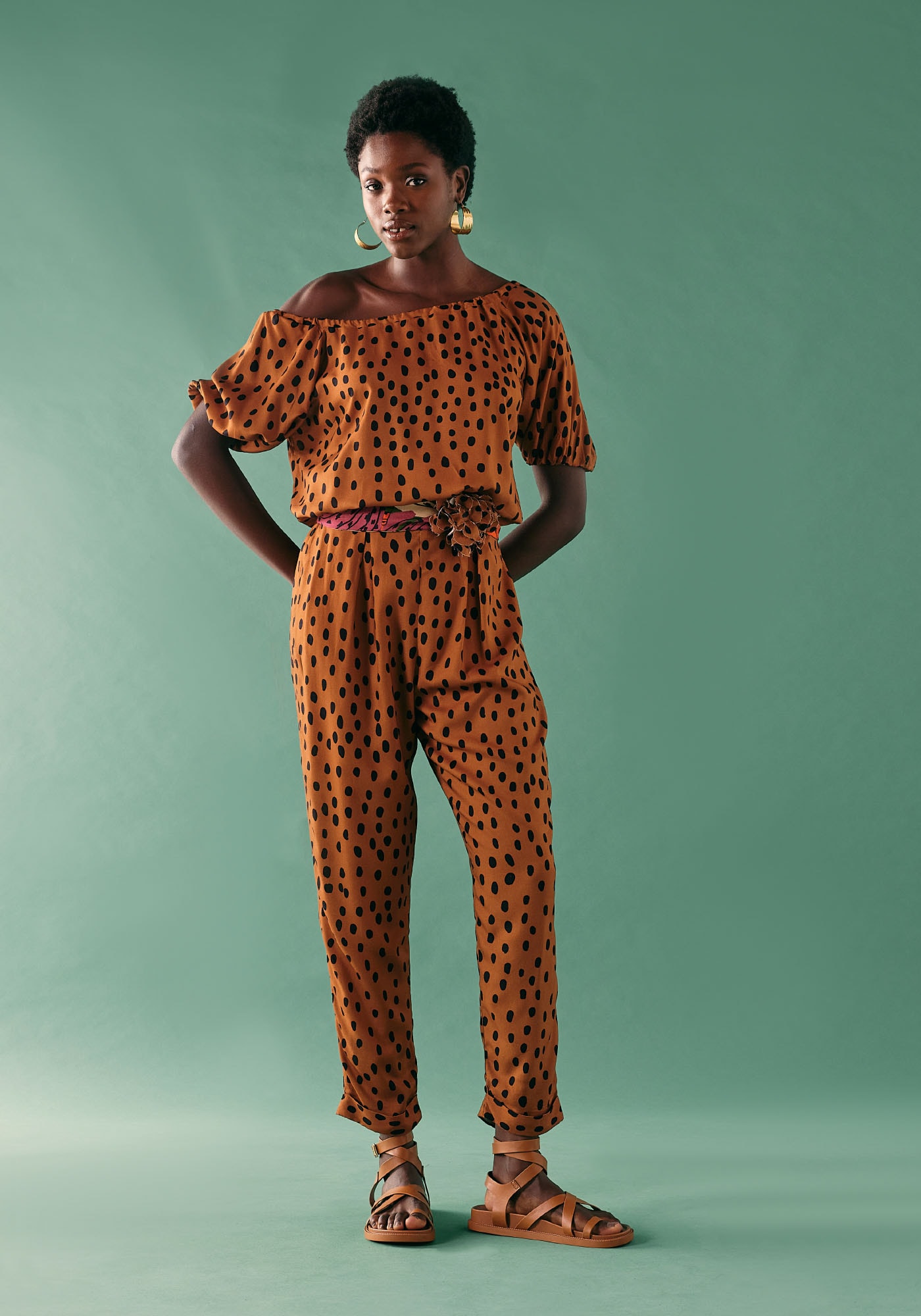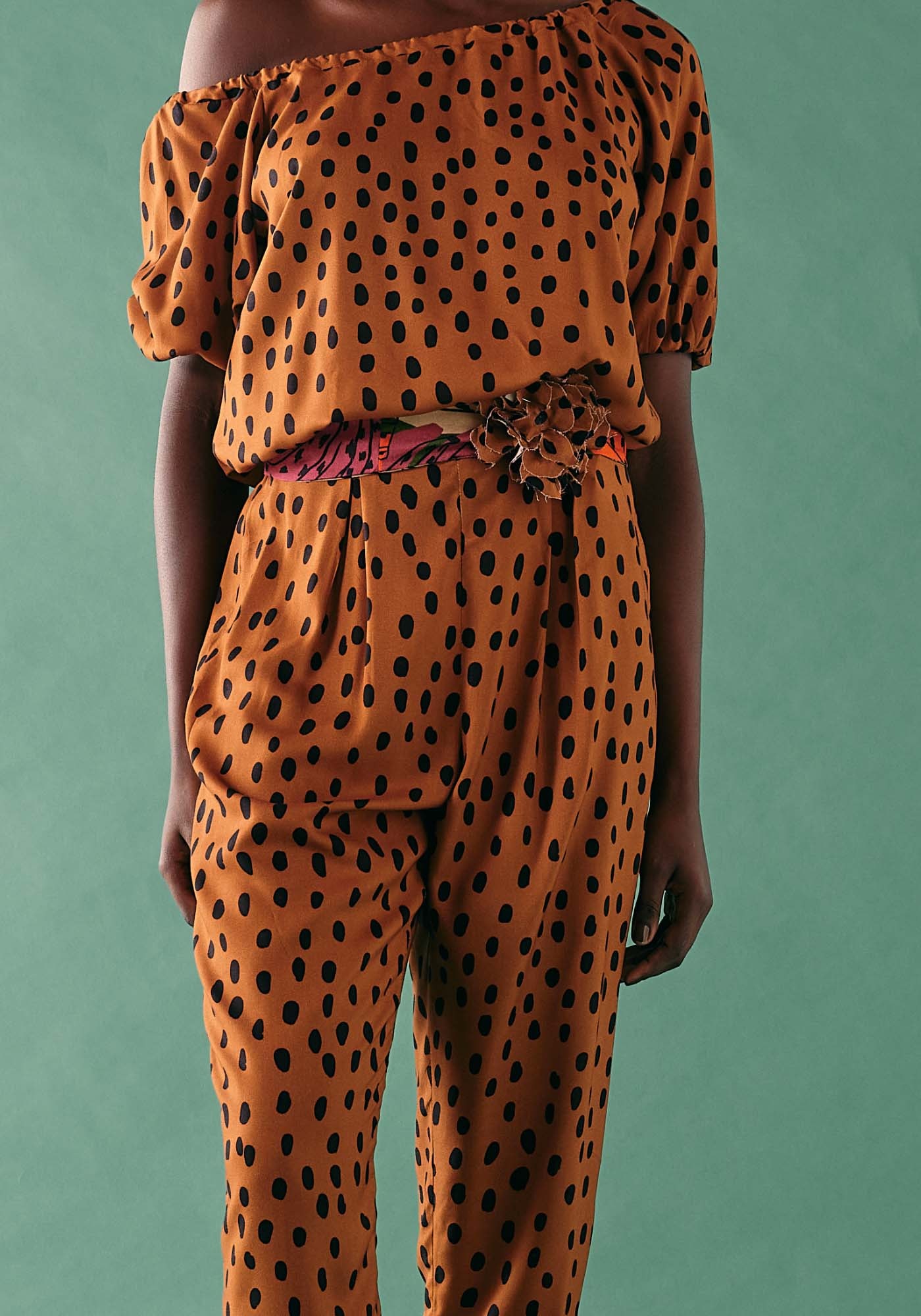Com um vibrante tom de laranja e uma encantadora estampa debolinhas, esta calça é a opção perfeita para agregar um toque de estilo aosseus looks.