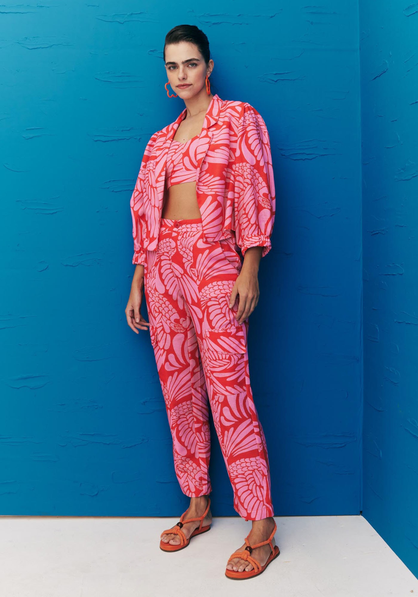 A Calça Cenoura Estampada é um destaque para o seu guarda-roupa com a sua encantadora estampa Araras de Bonito. Apresenta modelagem cenoura que é afunilada na barra e pala na cintura com fechamento em braguilha que marca a cintura valorizando a silhueta. Seus bolsos frontais adicionam funcionalidade e praticidade à peça. É confeccionada em tecido de composição 61% Viscose 39% Algodão.