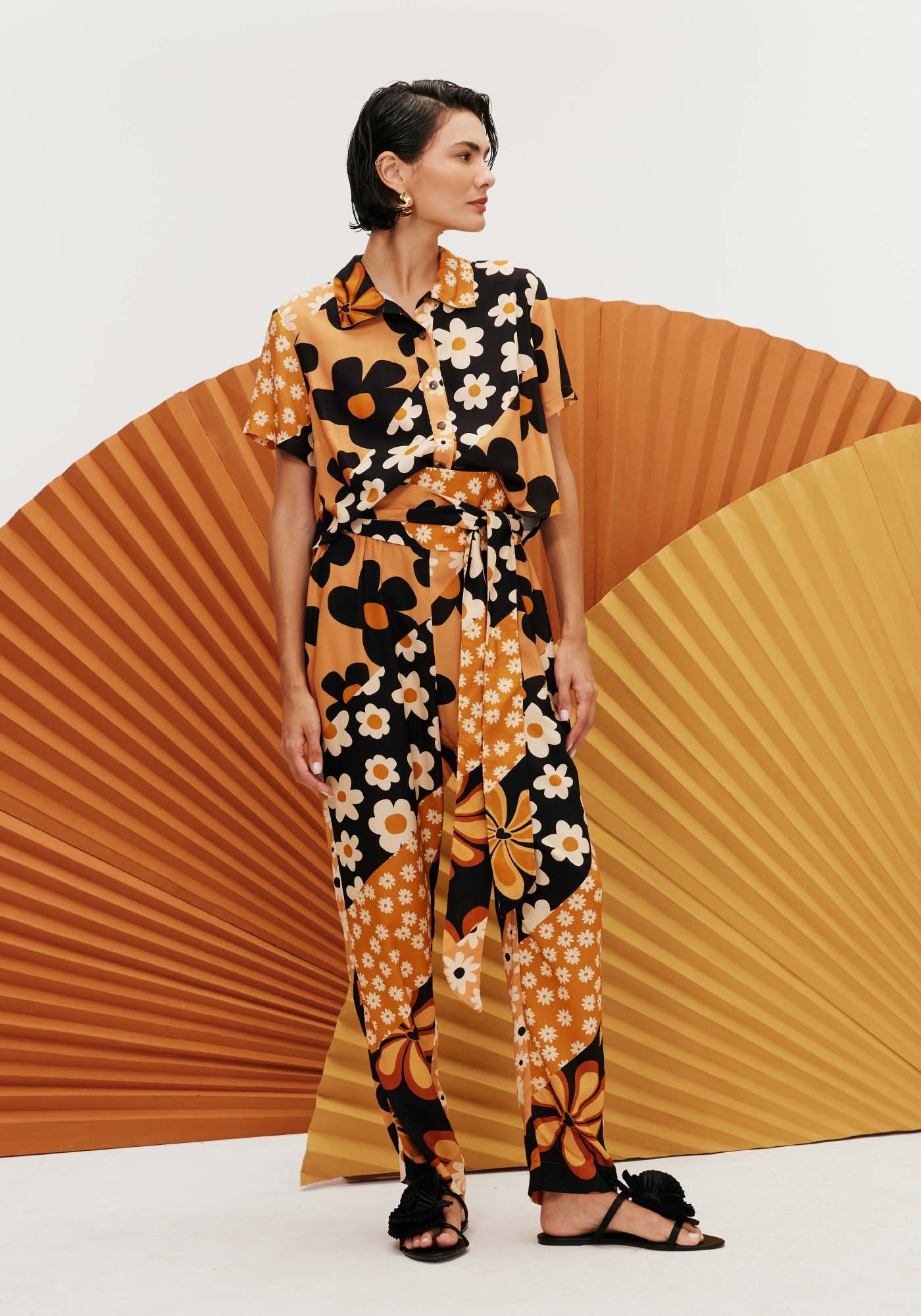 A calça cenoura estampada é ummodelo básico no armário. O modelo possui lastex no cós e amarração em túnel,facilitando a vestibilidade e a adaptação ao corpo.
