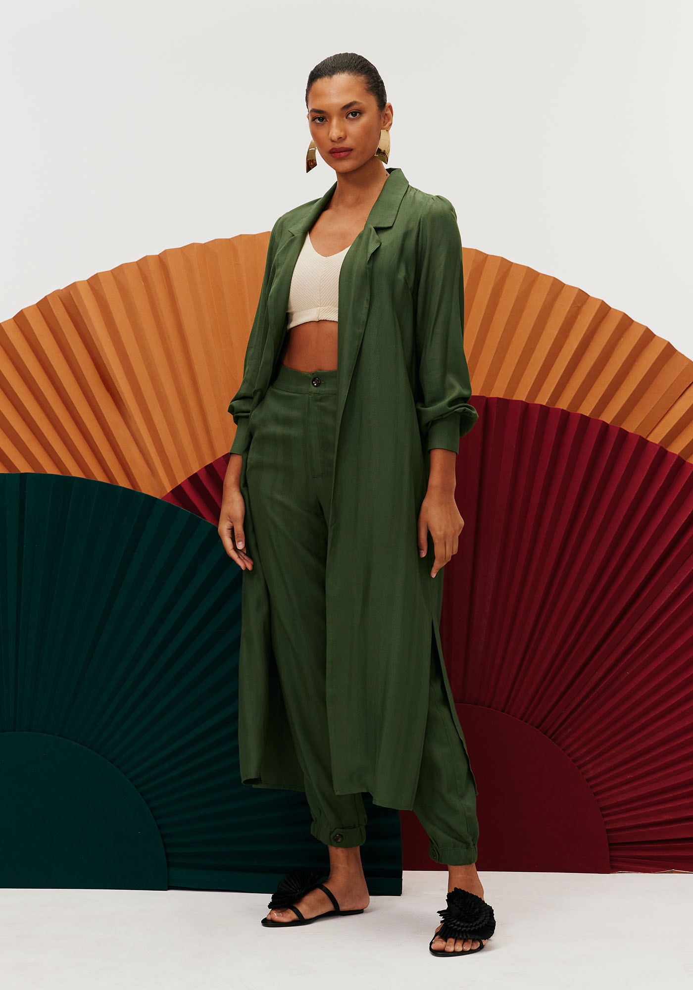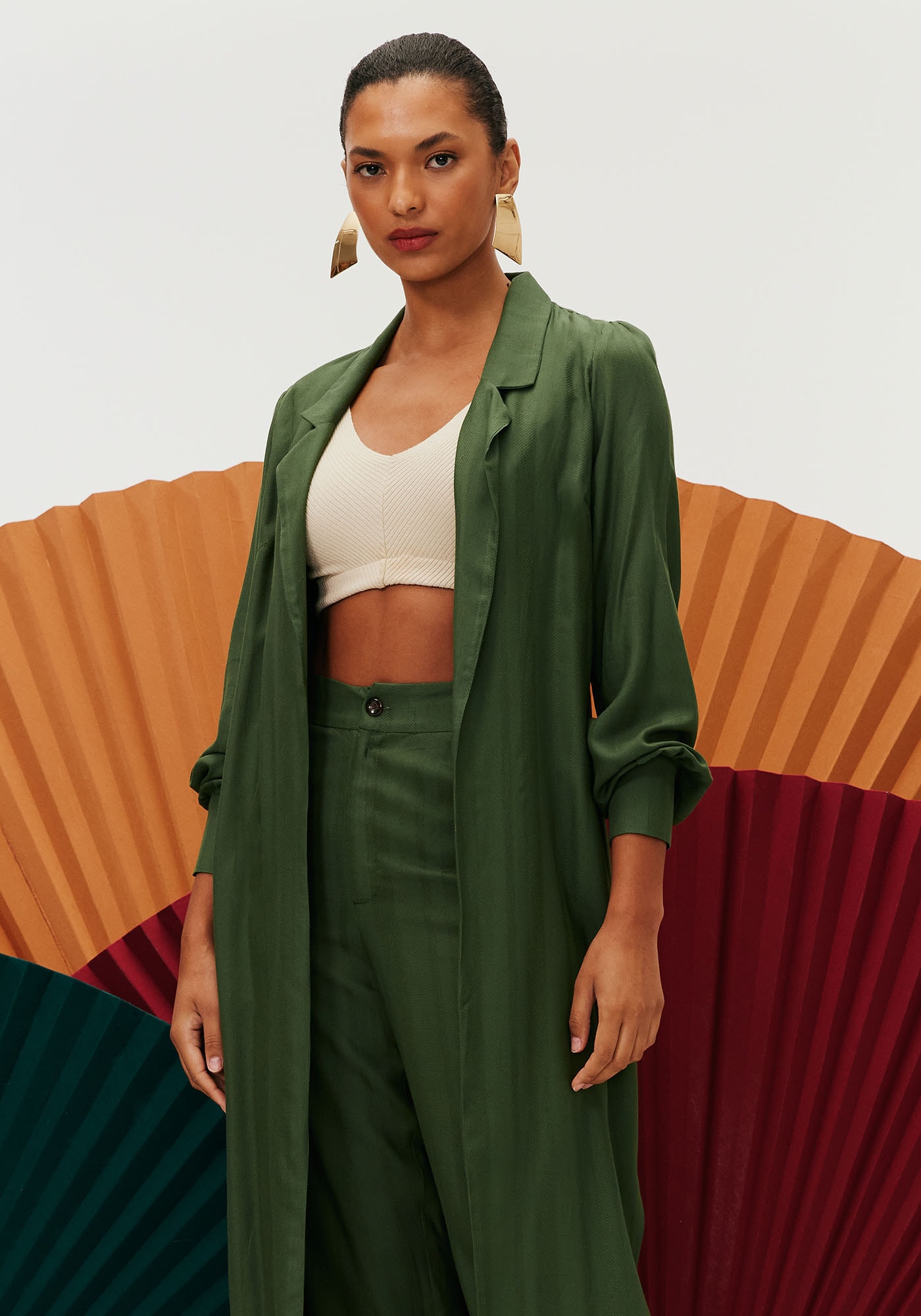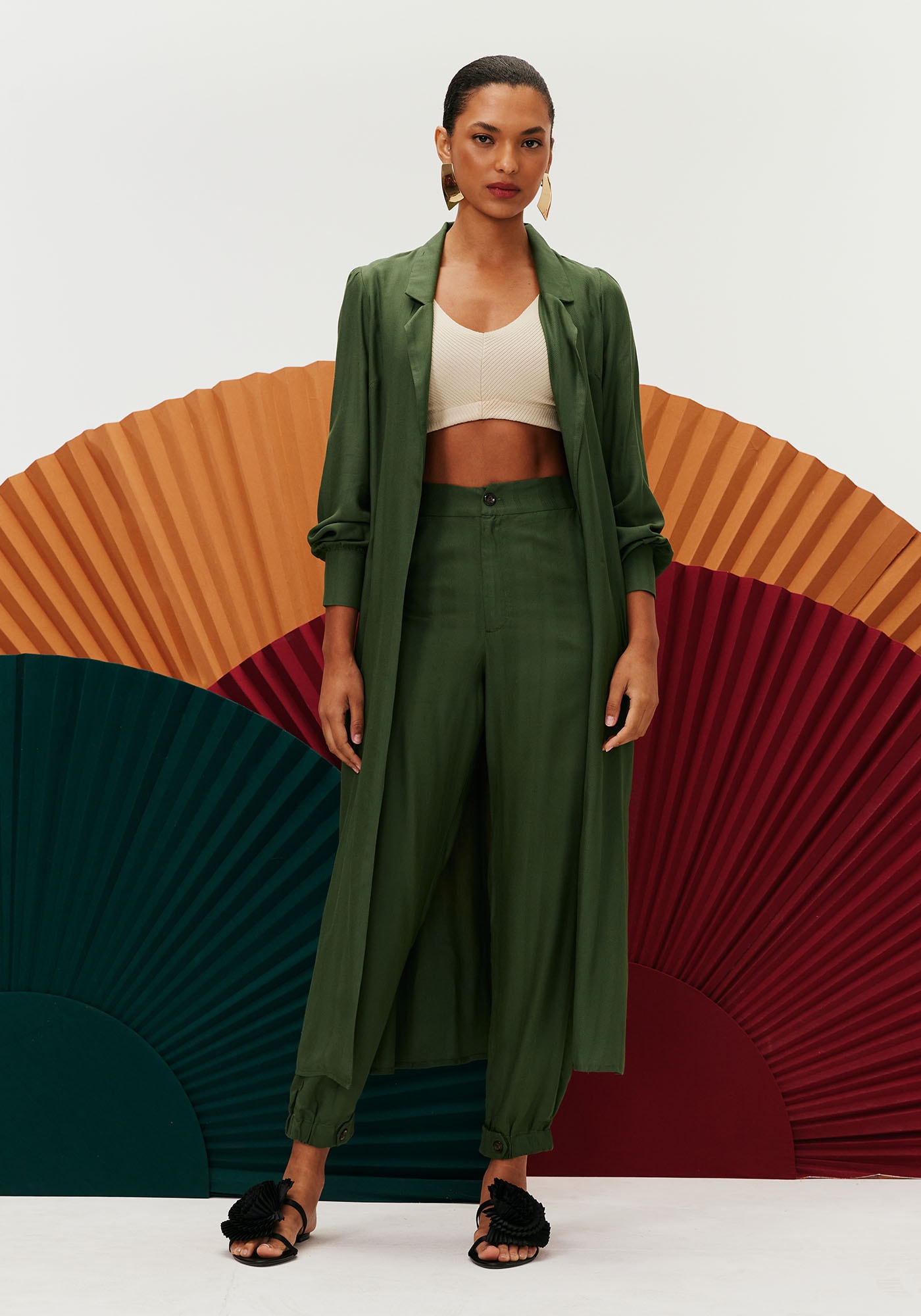 Confeccionada em tecido 97%viscose e 3% linho, a calça cenoura lisa é uma peça sofisticada. O modelocintura alta possui fechamento com abotoamento frontal e zíper e aleta nabarra. O tecido com listras verticais dá um toque diferenciado para a peça.
