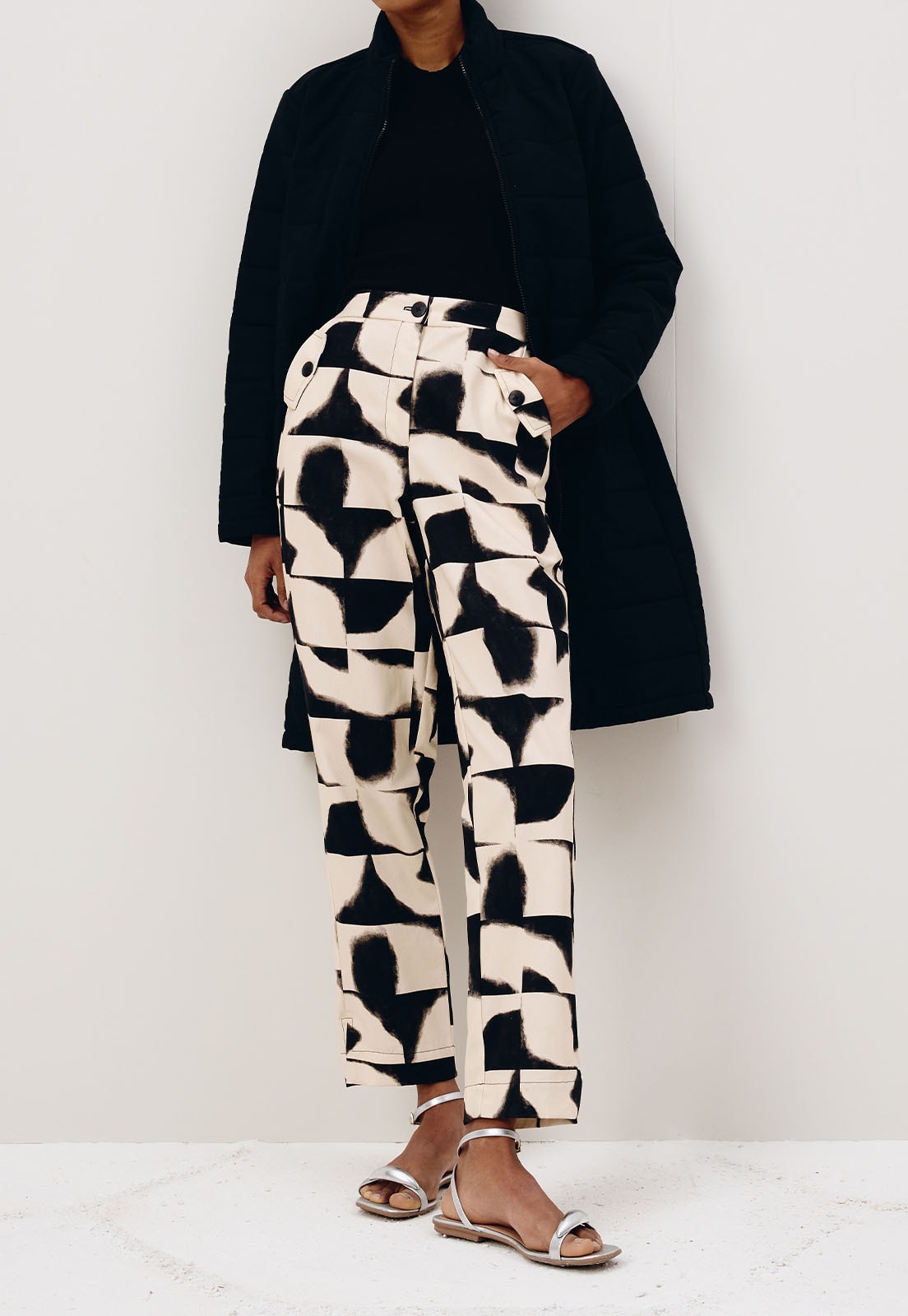 A calça cenoura Estampada Aconcágua é confeccionada em tecido 100% algodão. É um modelo cintura alta, com pequena abertura na lateral da barra e o detalhe sofisticado da lapela no bolso.