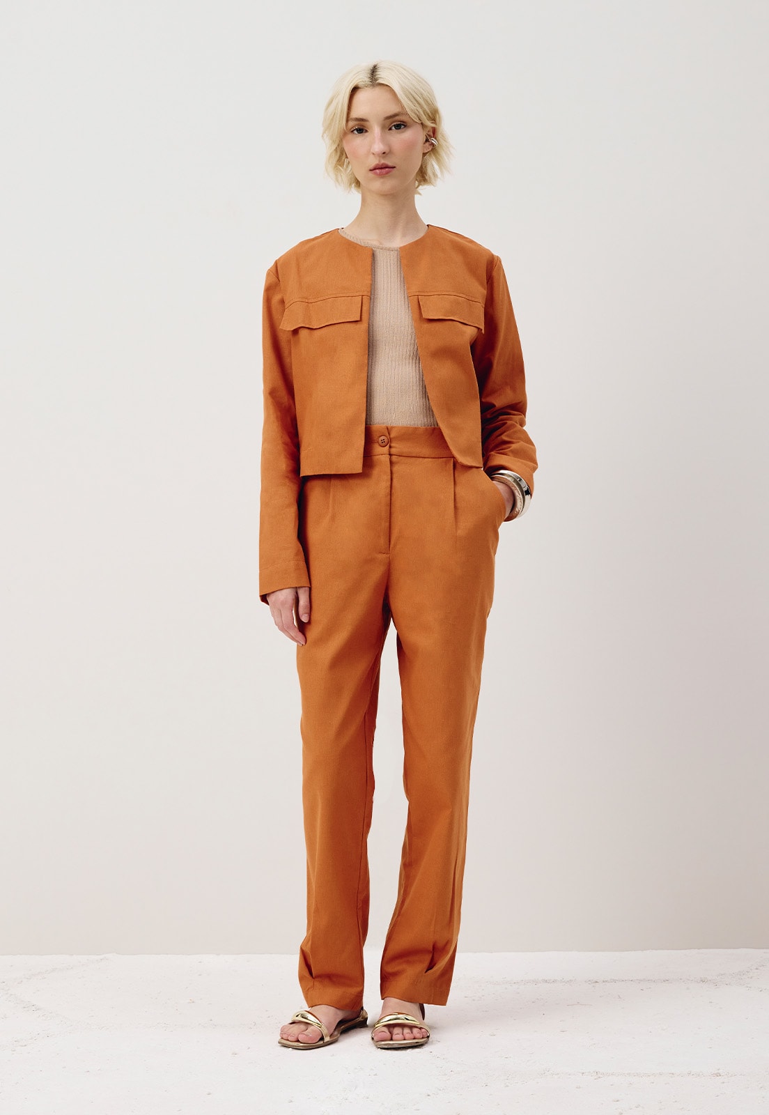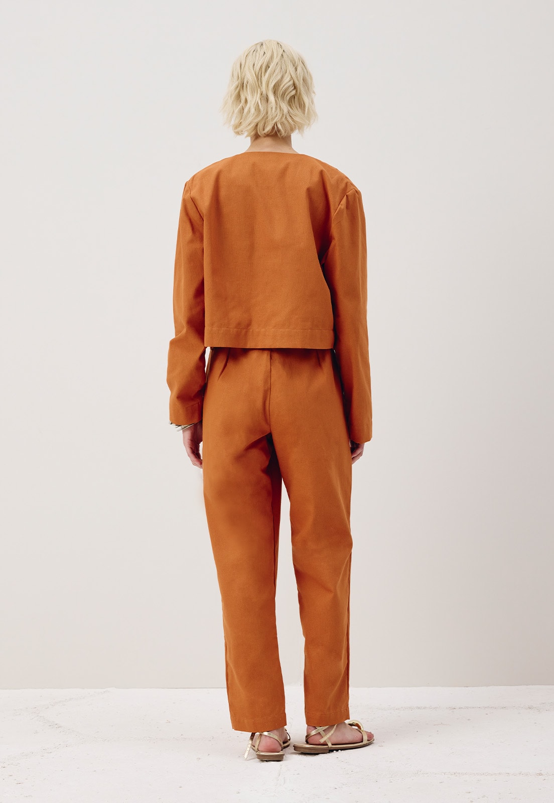 A calça cenoura é confeccionada em tecido 100% algodão. O modelo cintura alta possui bolsos laterais e prega na barra.