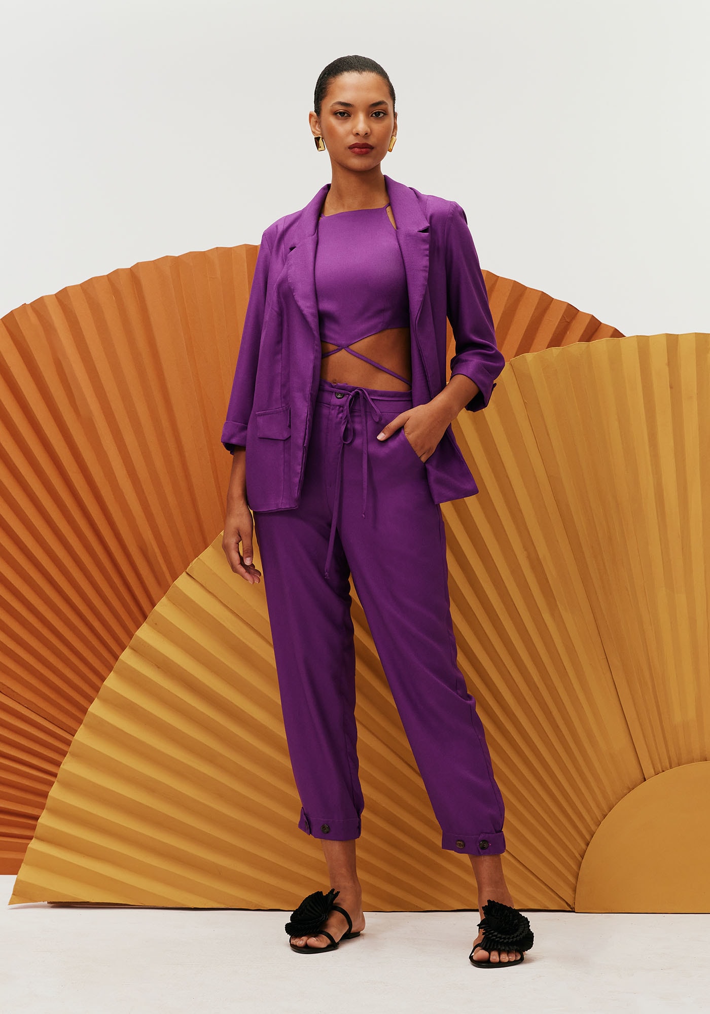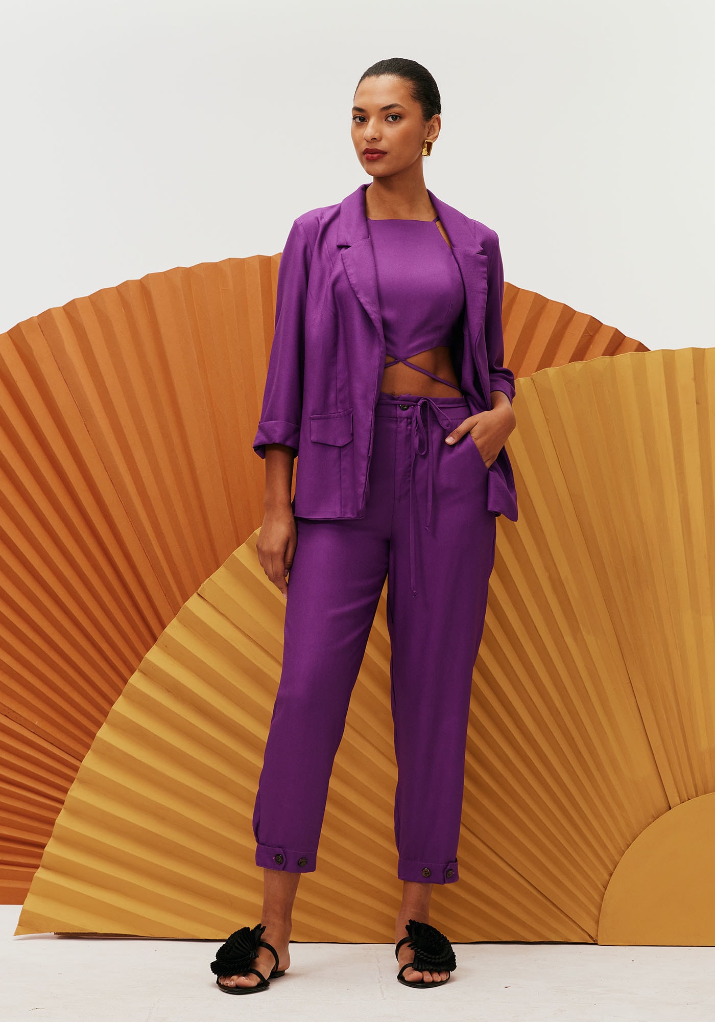 Confeccionada em tecido 100%viscose, a calça cenoura é sofisticada e elegante. O modelo clássico é cinturaalta e possui fechamento com abotoamento frontal e zíper. Além disso, possuielástico na barra com aleta, detalhe que torna a peça diferenciada. O bolso emfaca nas laterais é prático para o dia a dia.