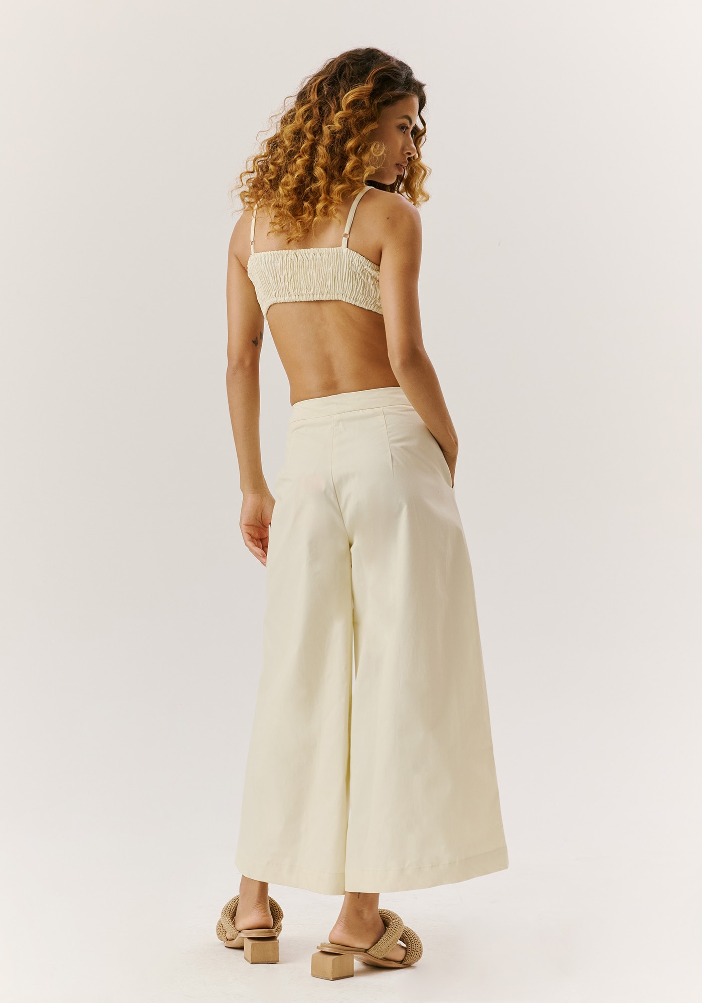 Confeccionada em tecido 100%algodão, a calça cropped é super estilosa. A peça possui uma modelagem pantalona,com bolsos grandes e fechamento diferenciado com botão escondido.