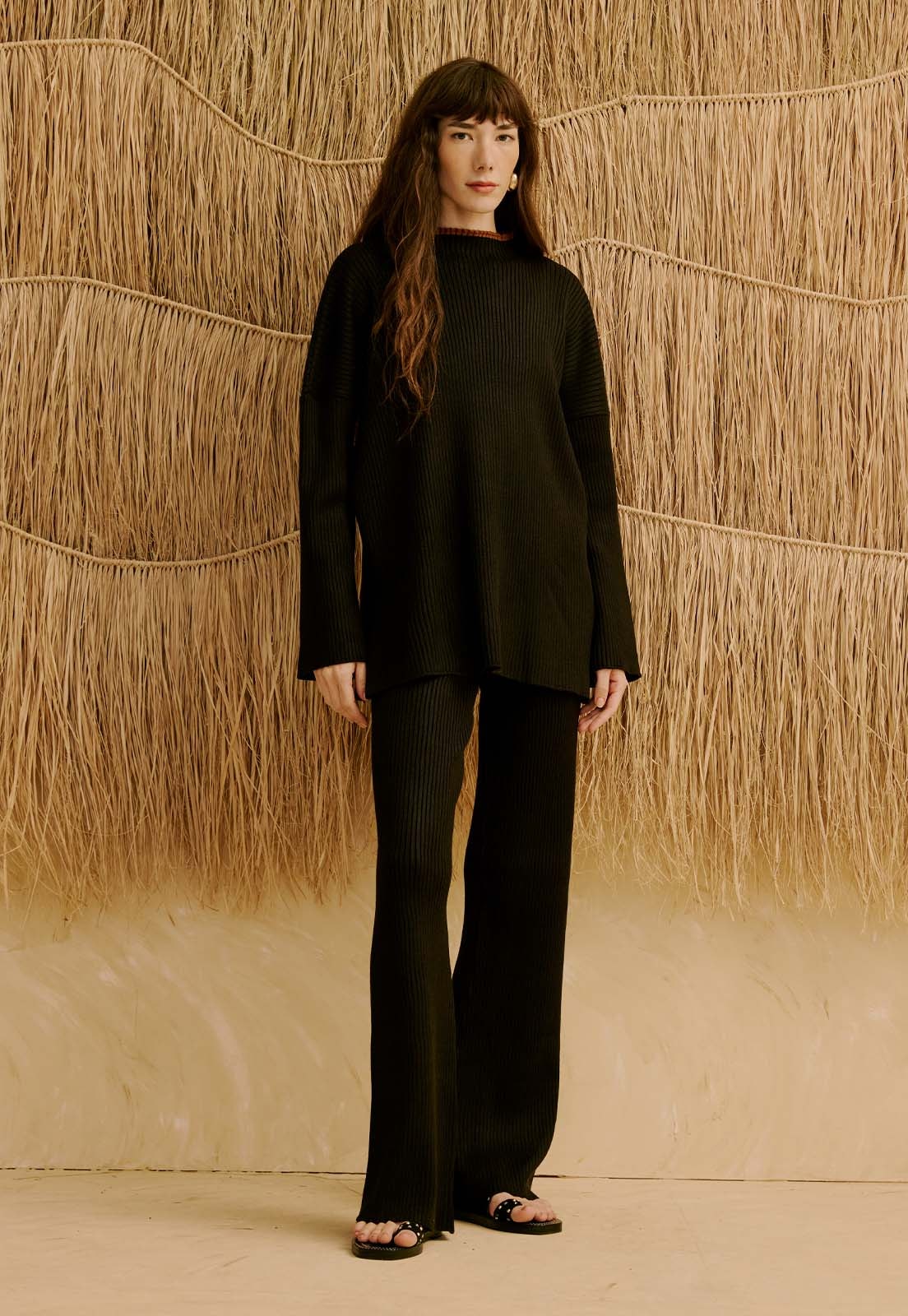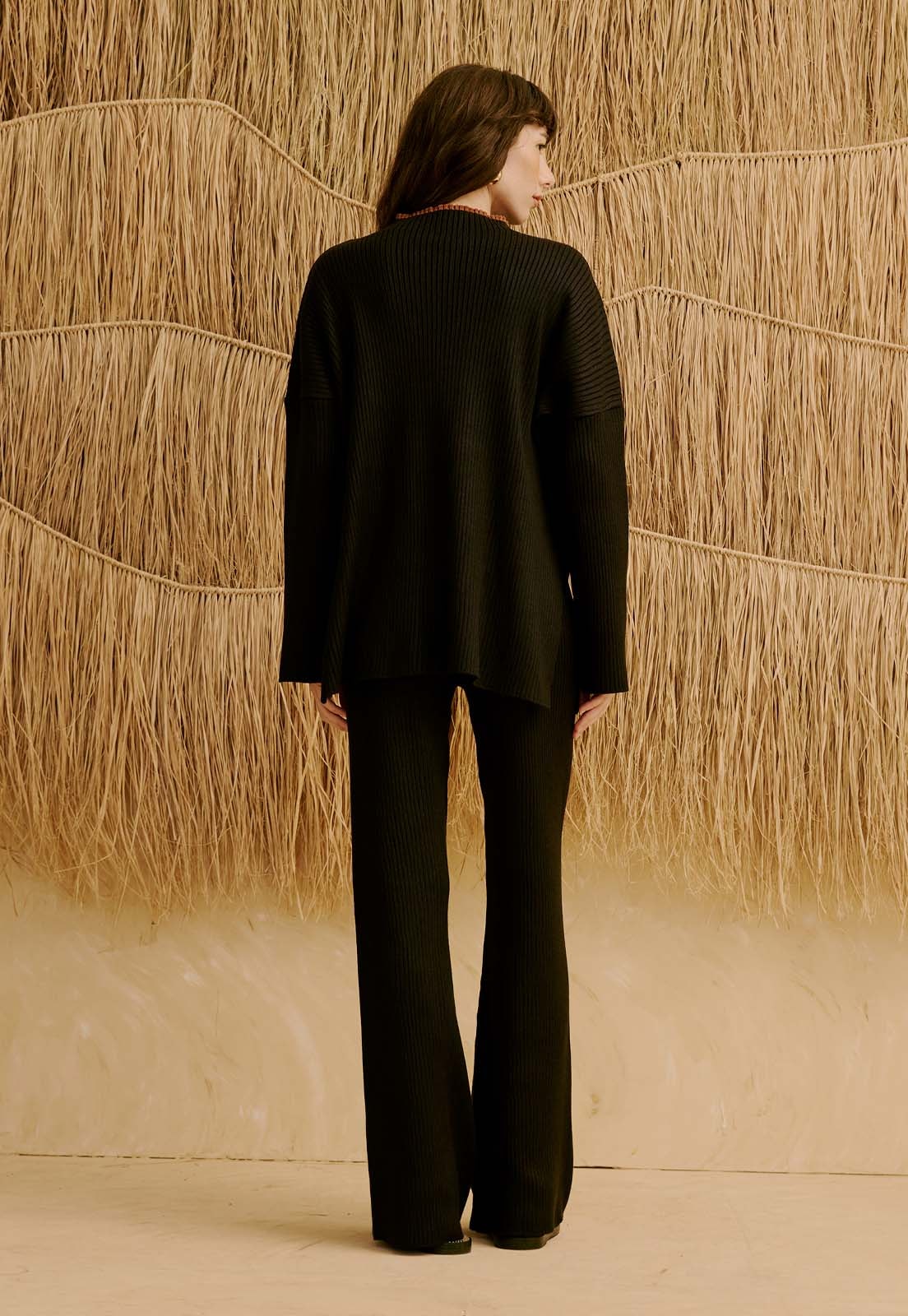 A Calça em Tricot da CaCay apresenta uma modelagem reta com caimento suave que alonga a silhueta, mantendo conforto desde o quadril até a barra. A forma é grande; por isso, se estiver entre dois tamanhos, opte pelo menor e consulte a tabela de medidas para garantir o encaixe ideal. A modelo das fotos tem 1,75m, veste manequim 36 e usa o tamanho P.
