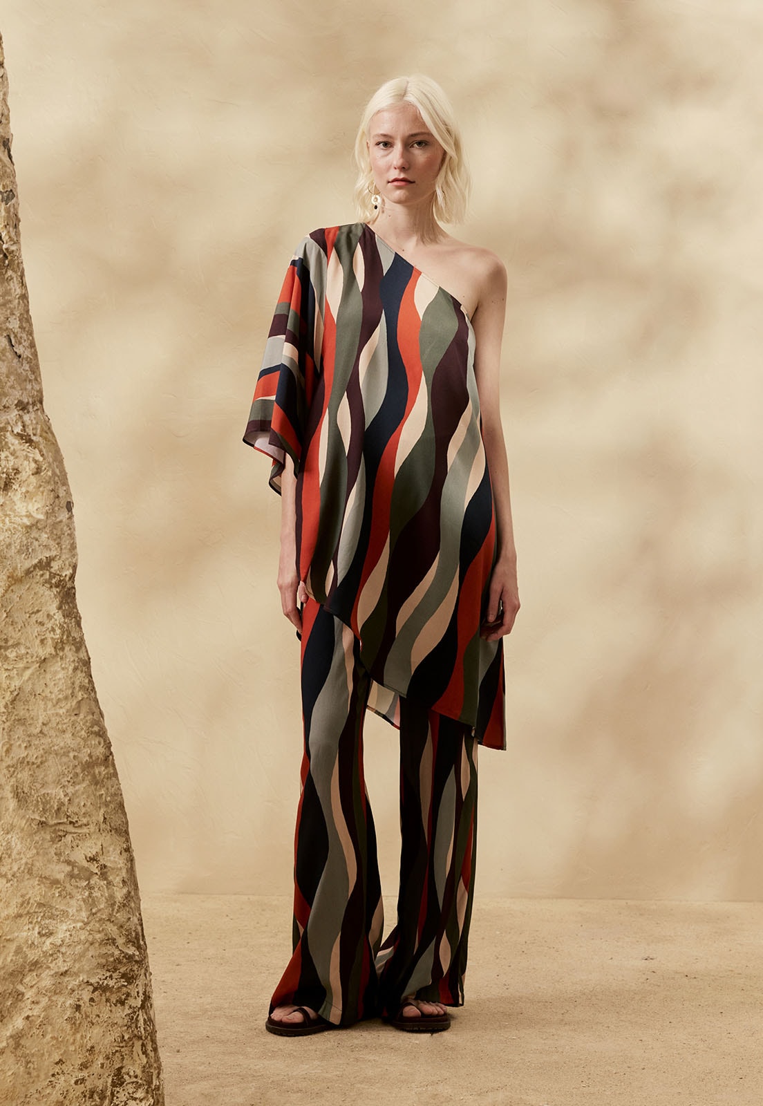 A Calça Estampada Cordilheira da CaCay tem modelagem ampla e fluida, com caimento solto no quadril e cintura, proporcionando conforto e movimento natural. A forma é grande, então se estiver em dúvida entre dois tamanhos, recomendamos optar pelo menor e consultar a tabela de medidas para precisão. Na foto, a modelo tem 1,75m, veste manequim 36 e está usando o tamanho P.
