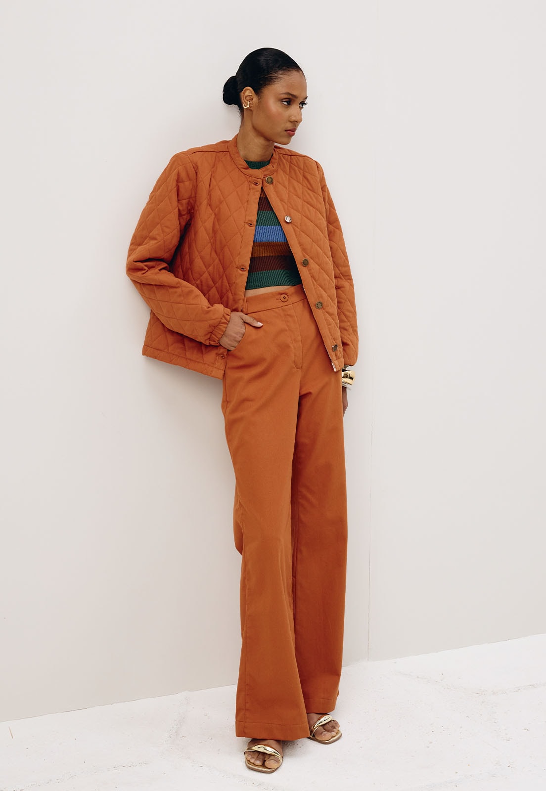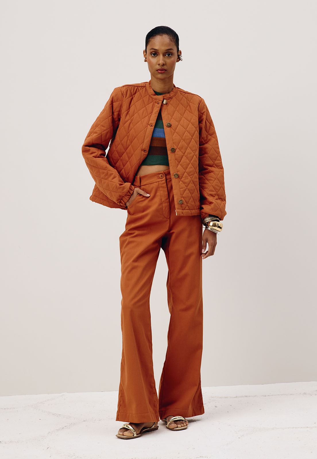 A Calça Flare Lisa traz elegância e estrutura em uma modelagem que valoriza a silhueta. Com pala na cintura e passadores, permite o uso de cintos, enquanto o fechamento em braguilha e os bolsos frontais adicionam funcionalidade ao design. O recorte flare garante um caimento fluido e alongado, perfeito para produções que pedem sofisticação e conforto. Confeccionada em 100% algodão, a peça combina toque natural e conforto em todas as ocasiões.