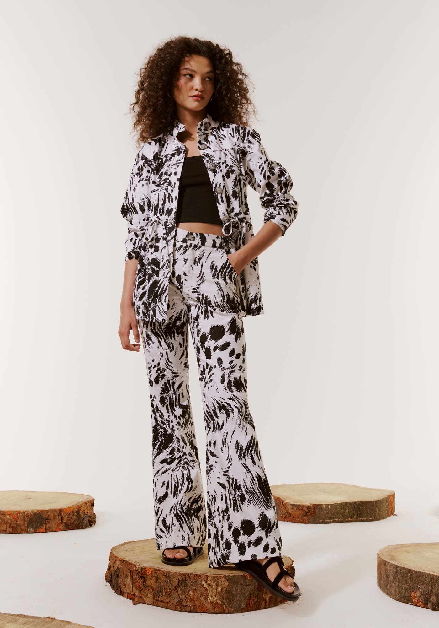 A Calça Flare se tornou um modelo queridinho! A estampaLeopardo remete a um animal print nas cores clássicas P&B. Confeccionadaem tecido misto, 97% algodão 3% elastano, a calça com modelagem flare possui fechamentocom zíper frontal e botão, além de bolsos laterais que deixam a peça maisprática.